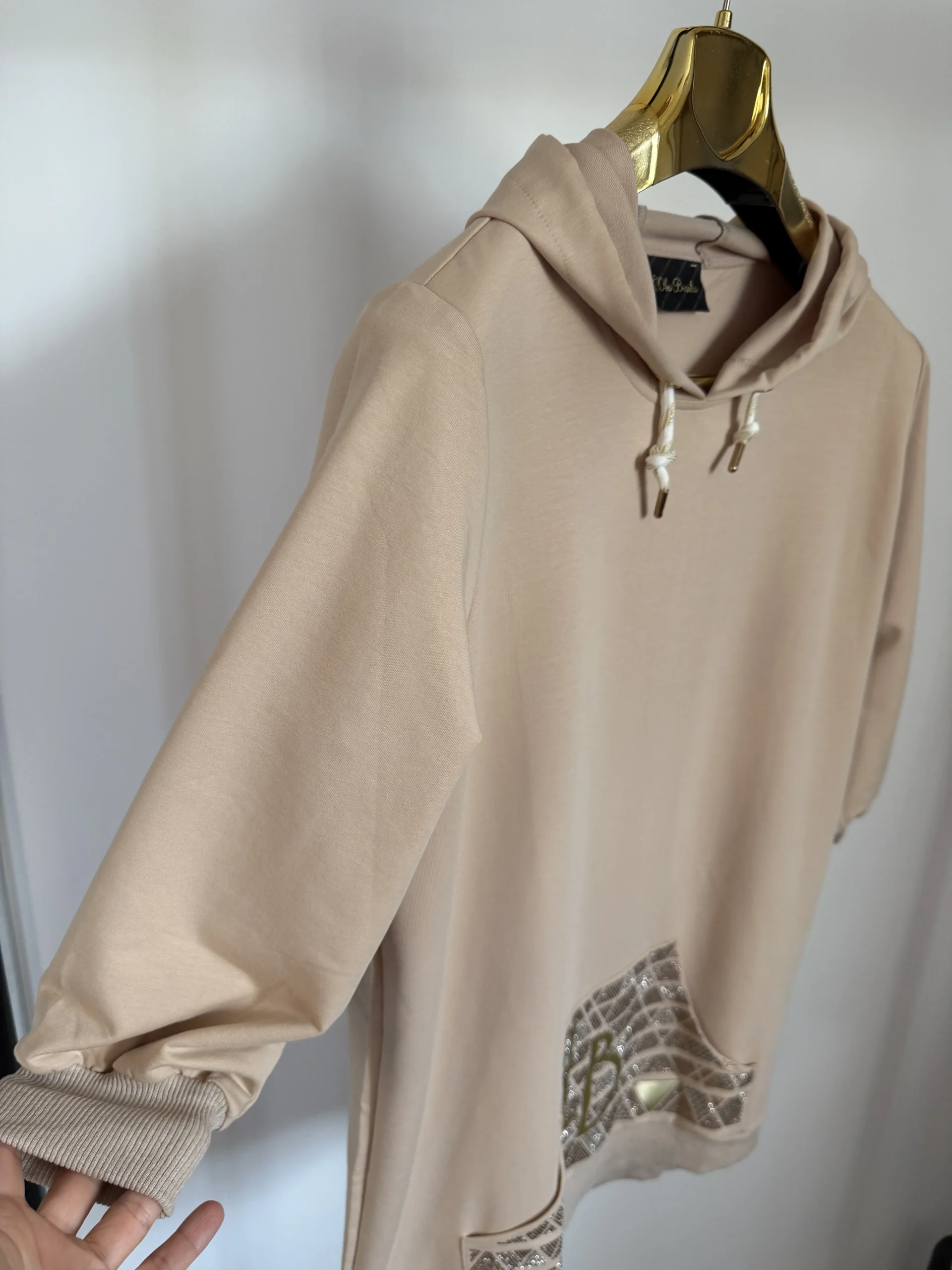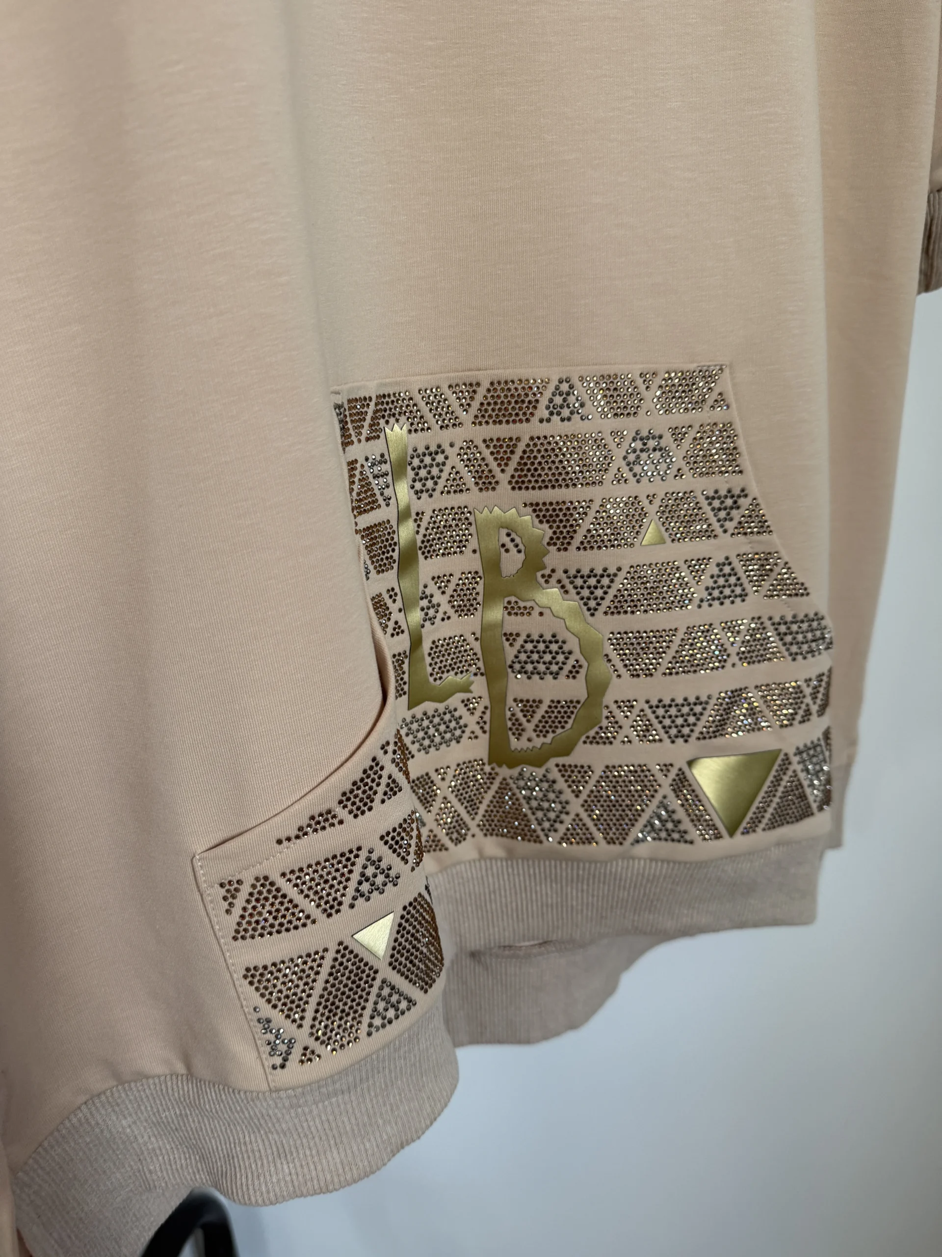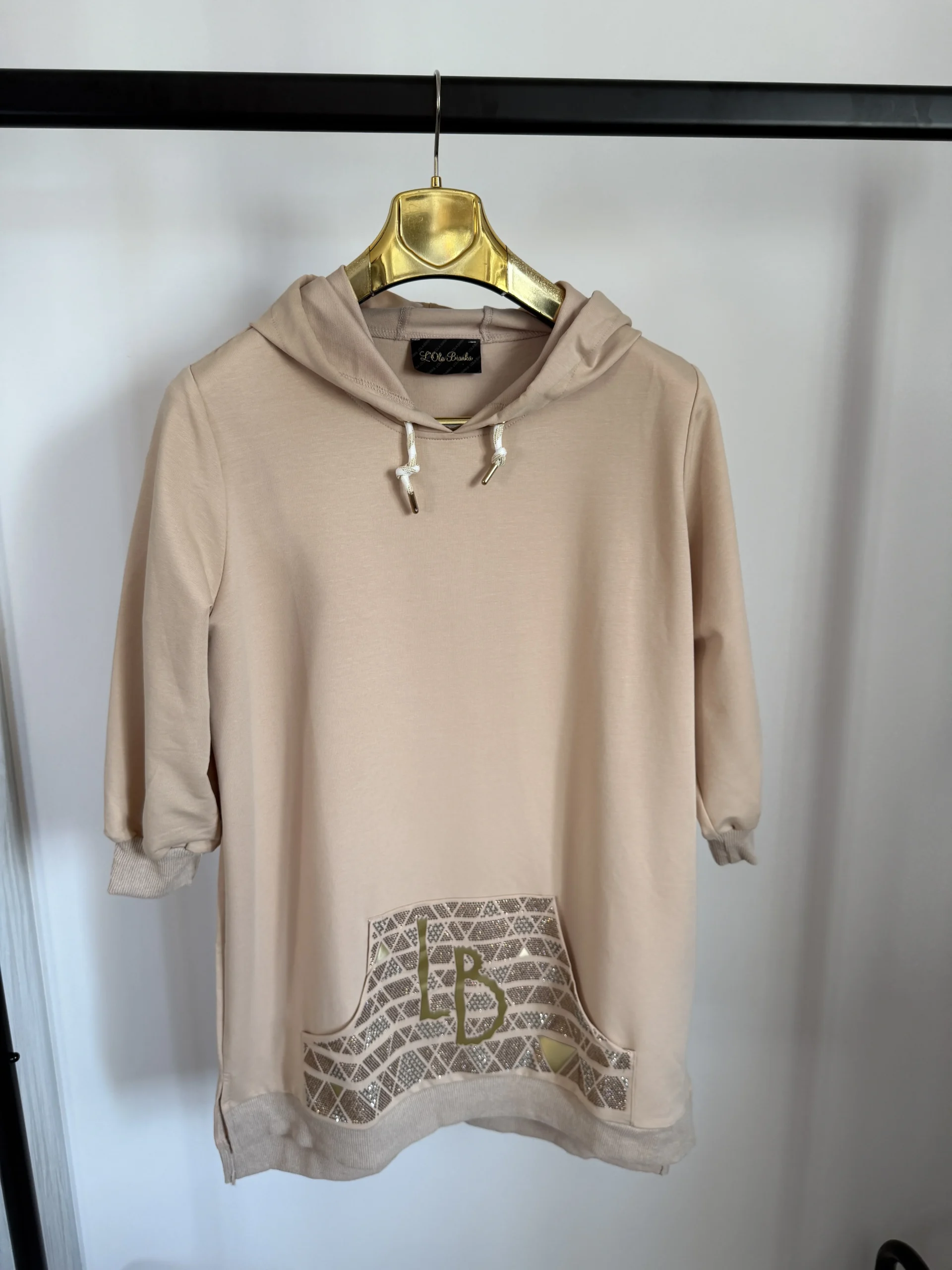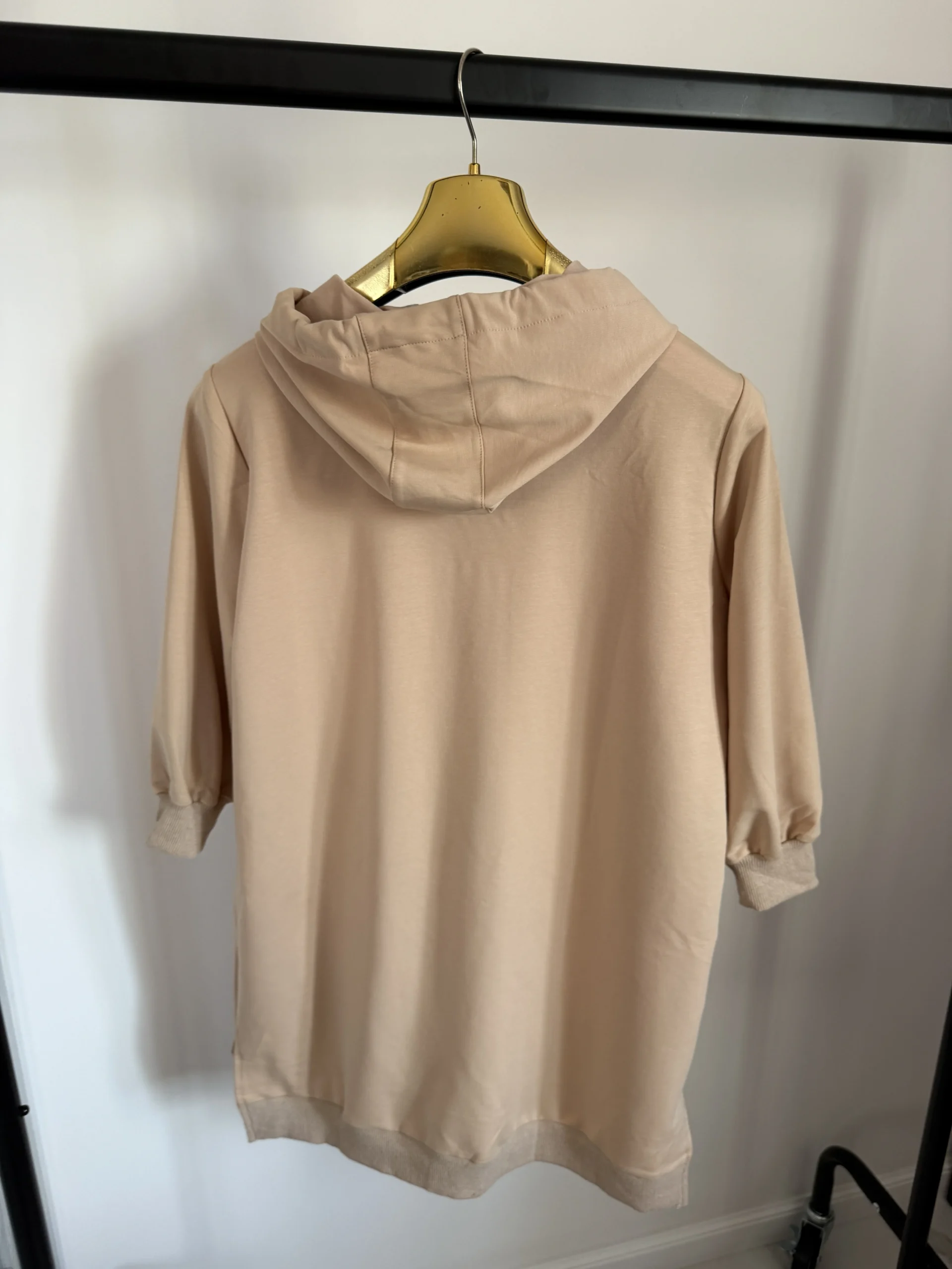 Bluza Lola Bianka beżowa tunika dresowa, rozmiar UNI na metce pasuje na S,M,L, rękawek 3/4, z kapturem, zdobiona cyrkoniami, piękny i wygodny model lekkiej cieńszej bluzy/pasek nie jest w zestawie to tylko przykładowa stylizacja -można dokupić osobno