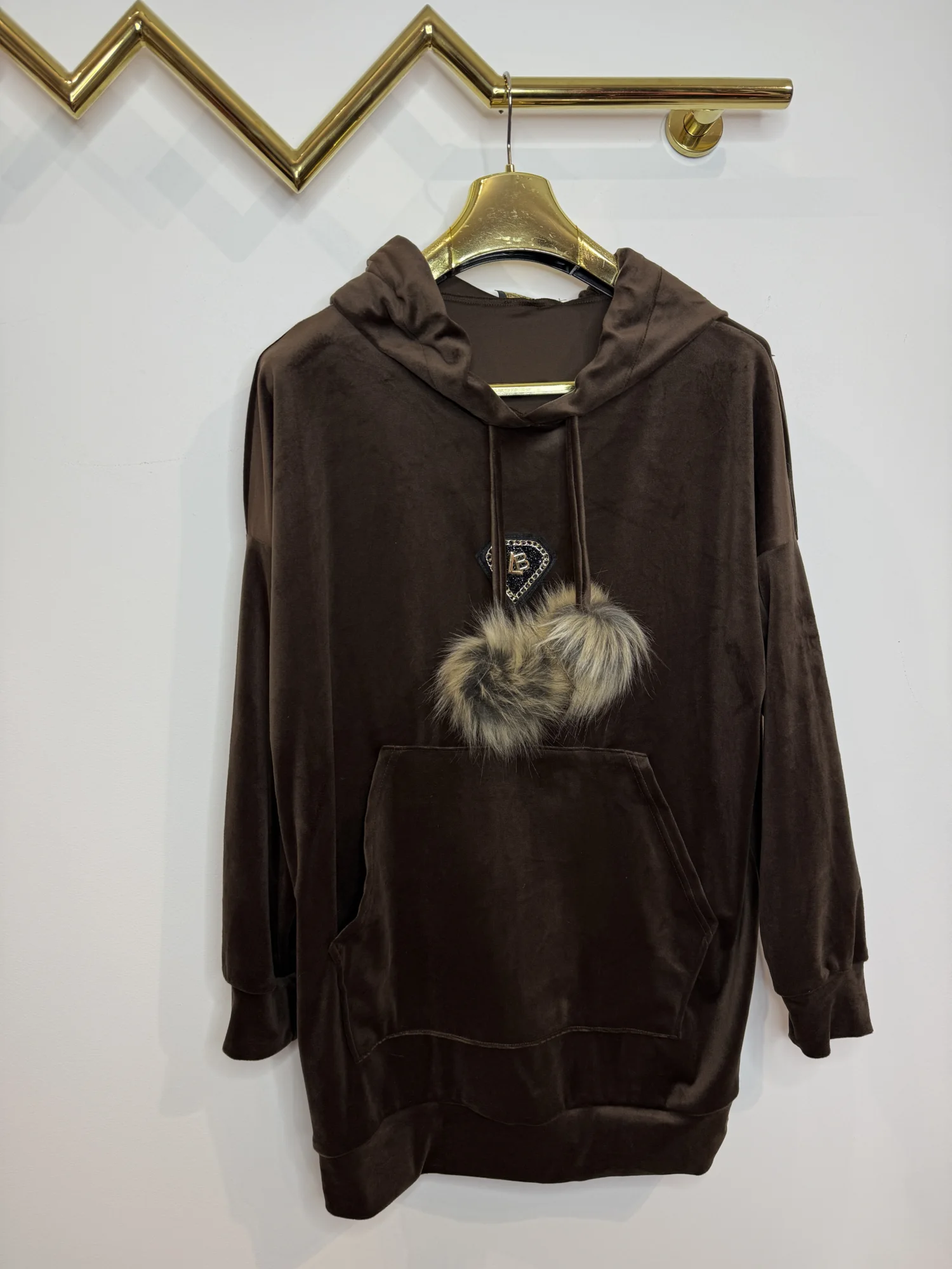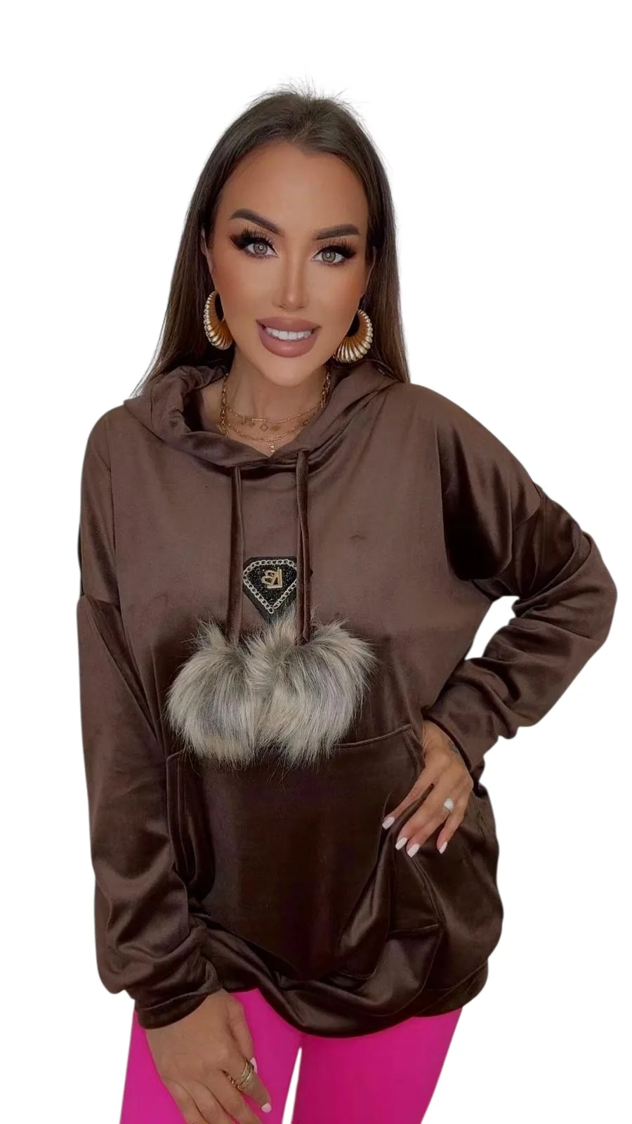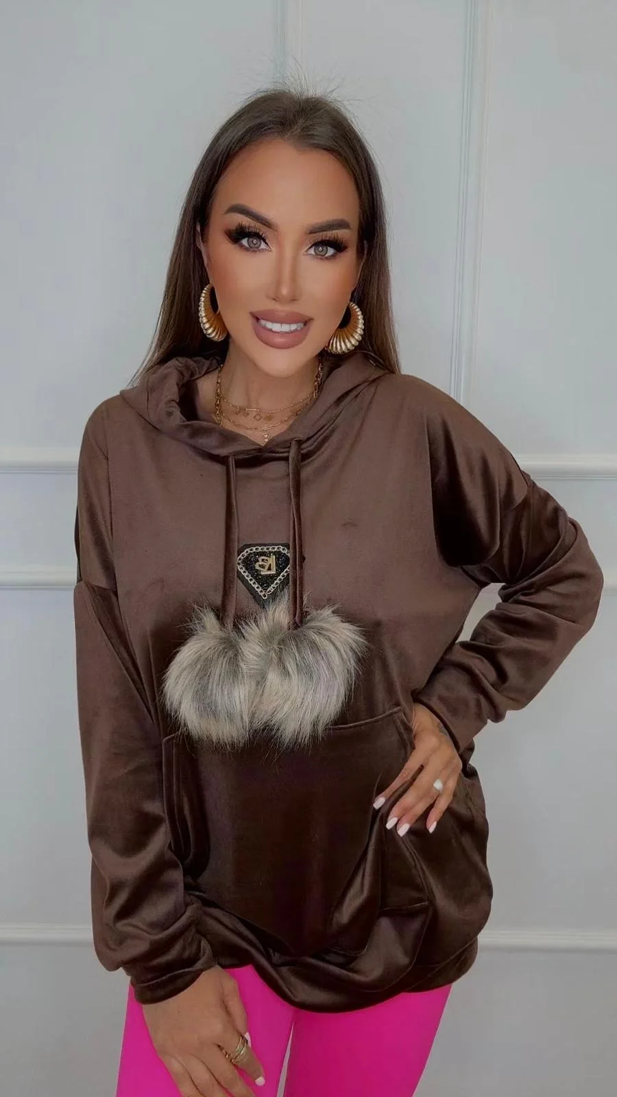 Bluza Lola Bianka bluza welurowa brązowa cieniutka z pięknymi pomponami, na przodzie kieszeń kangurka, kaptur