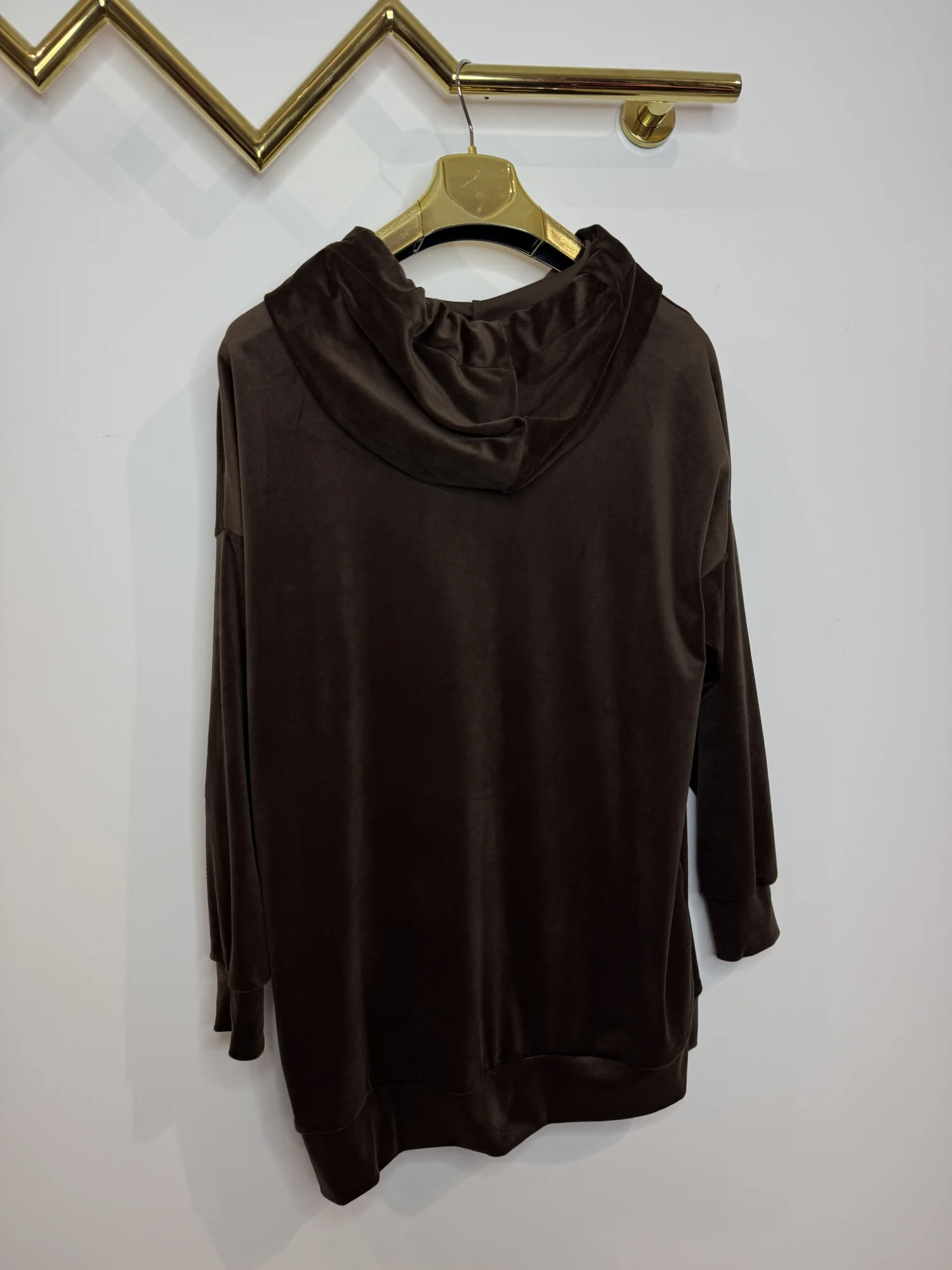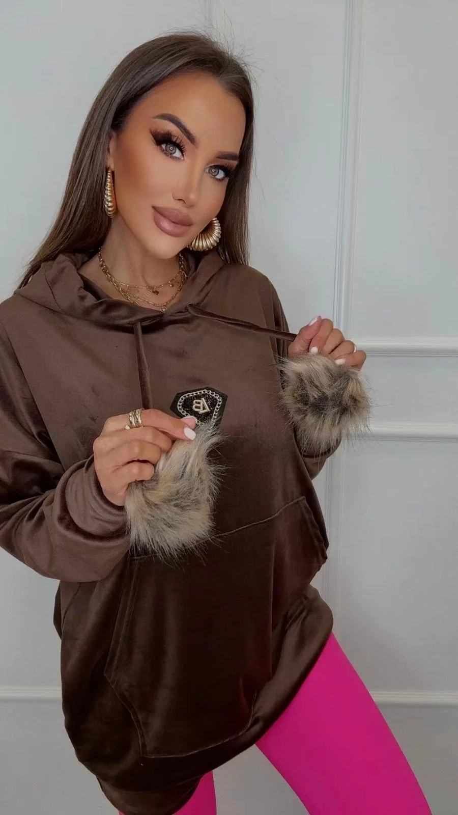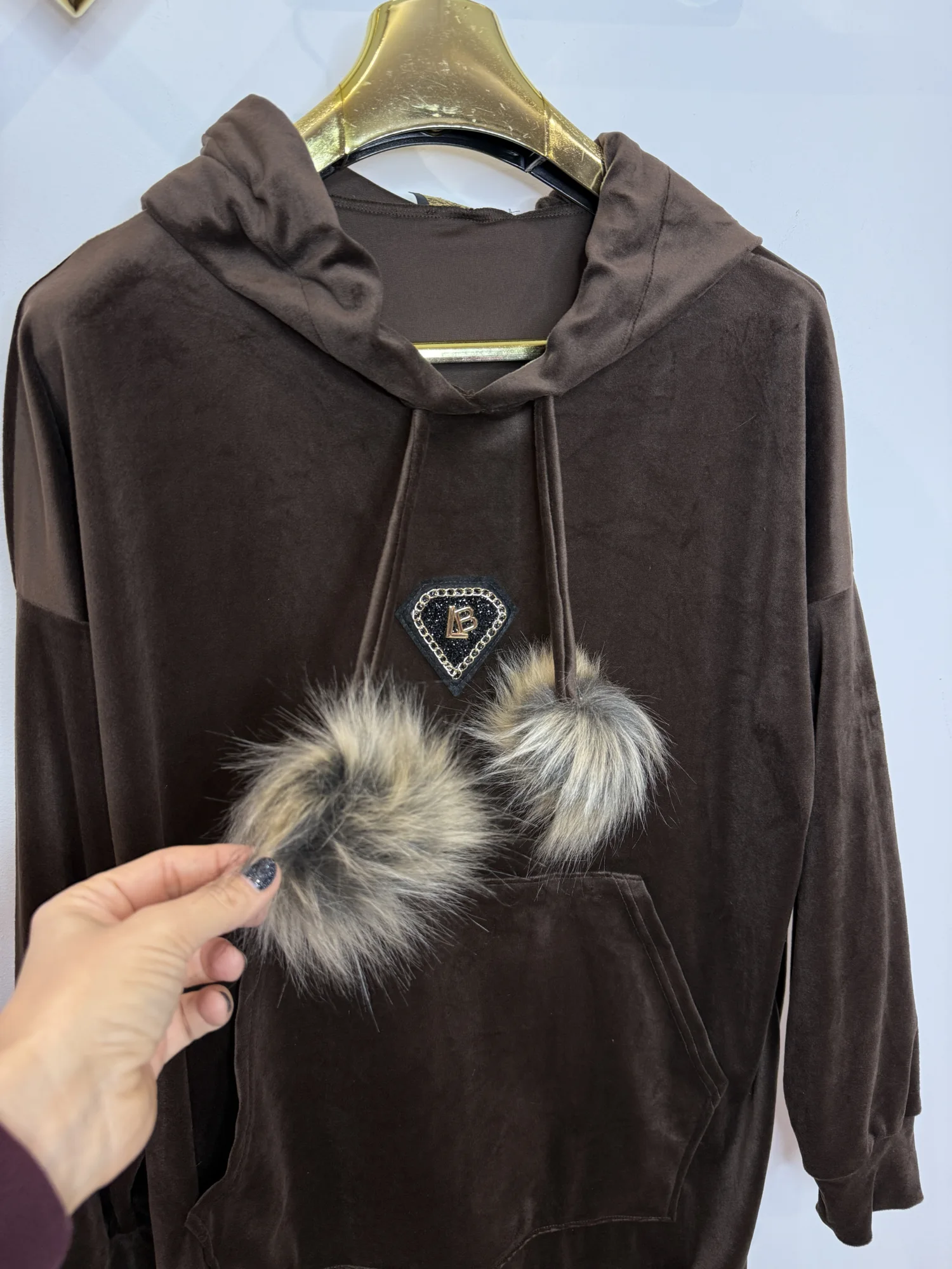 Bluza Lola Bianka bluza welurowa brązowa cieniutka z pięknymi pomponami, na przodzie kieszeń kangurka, kaptur