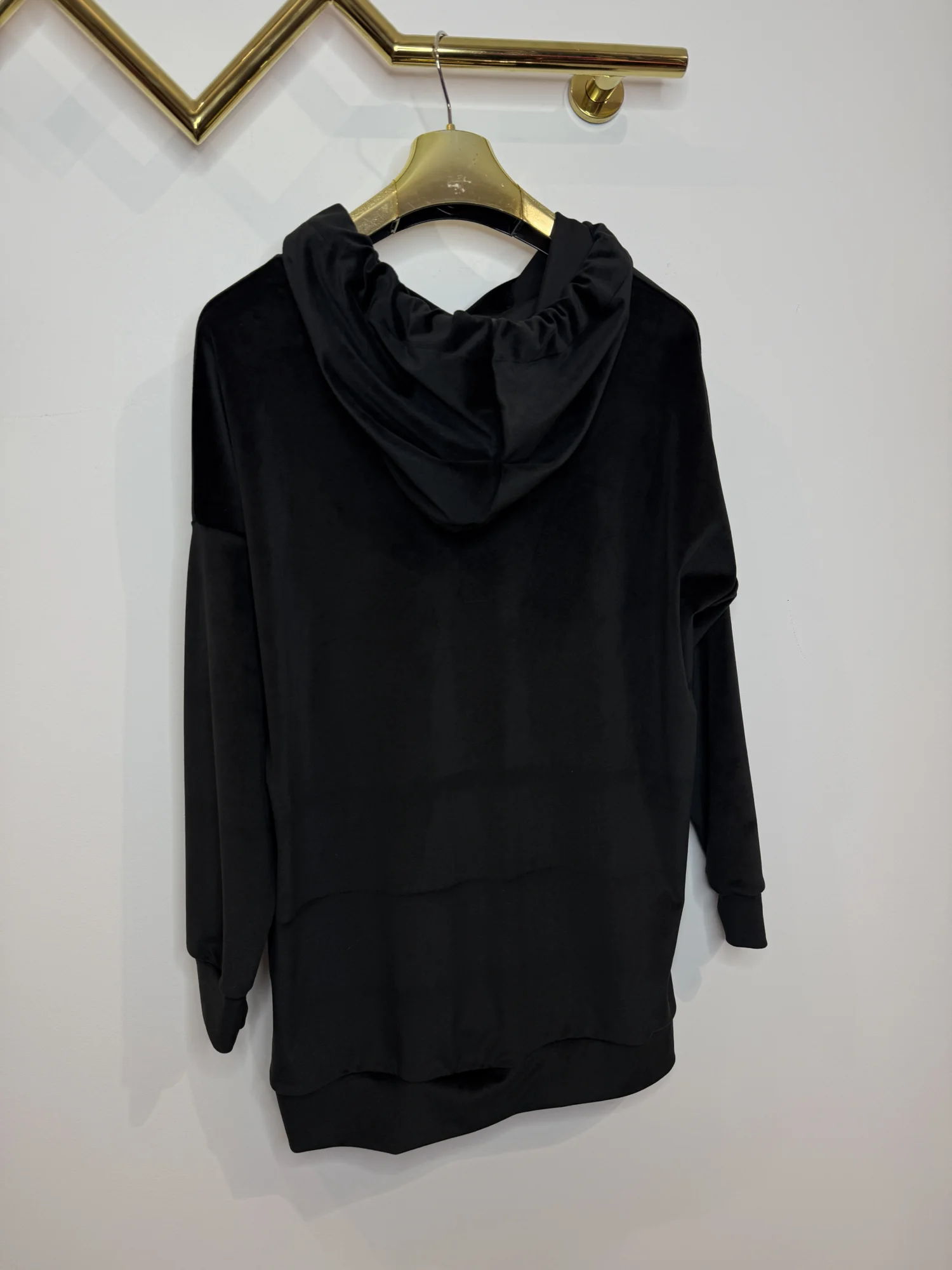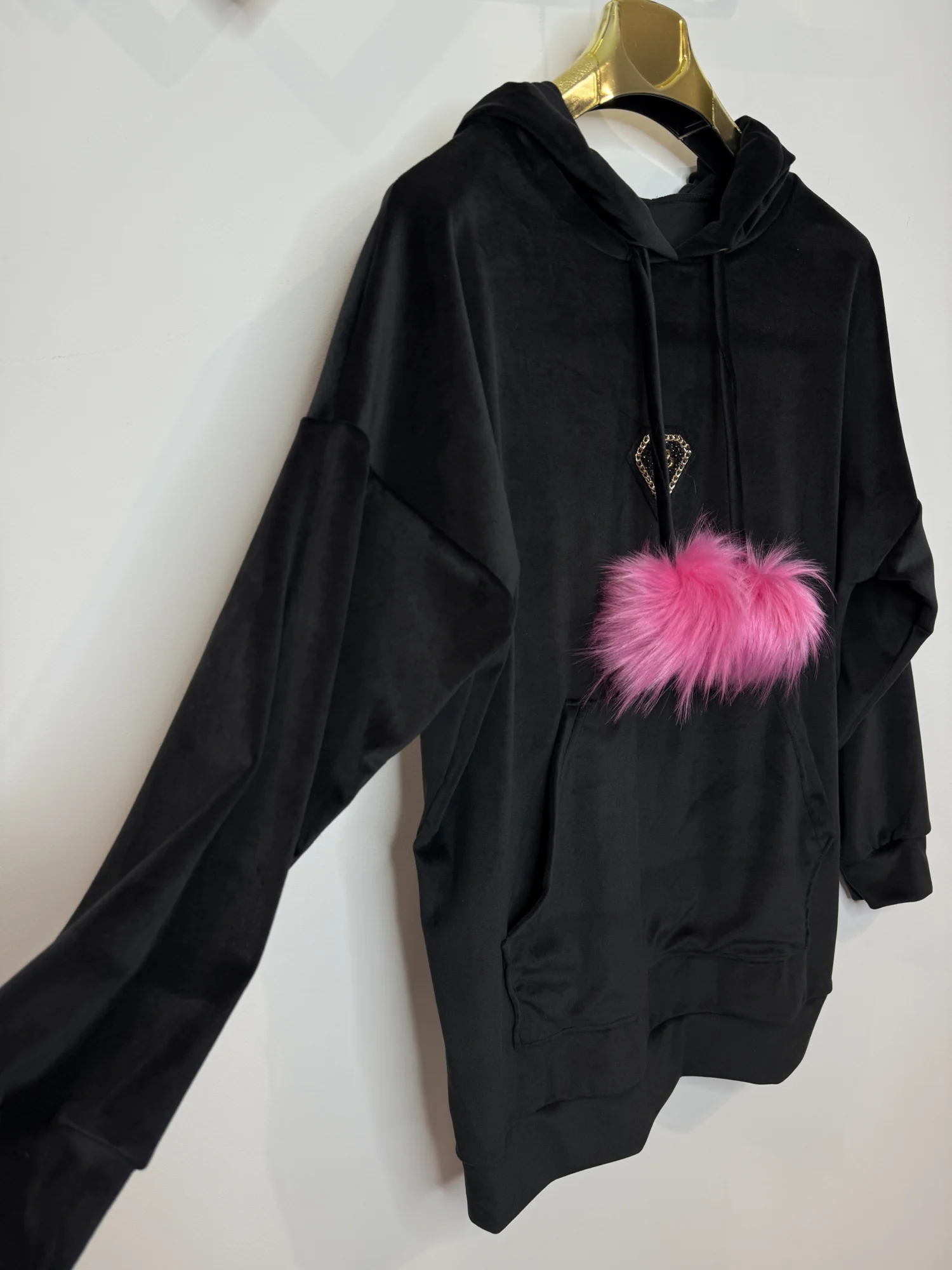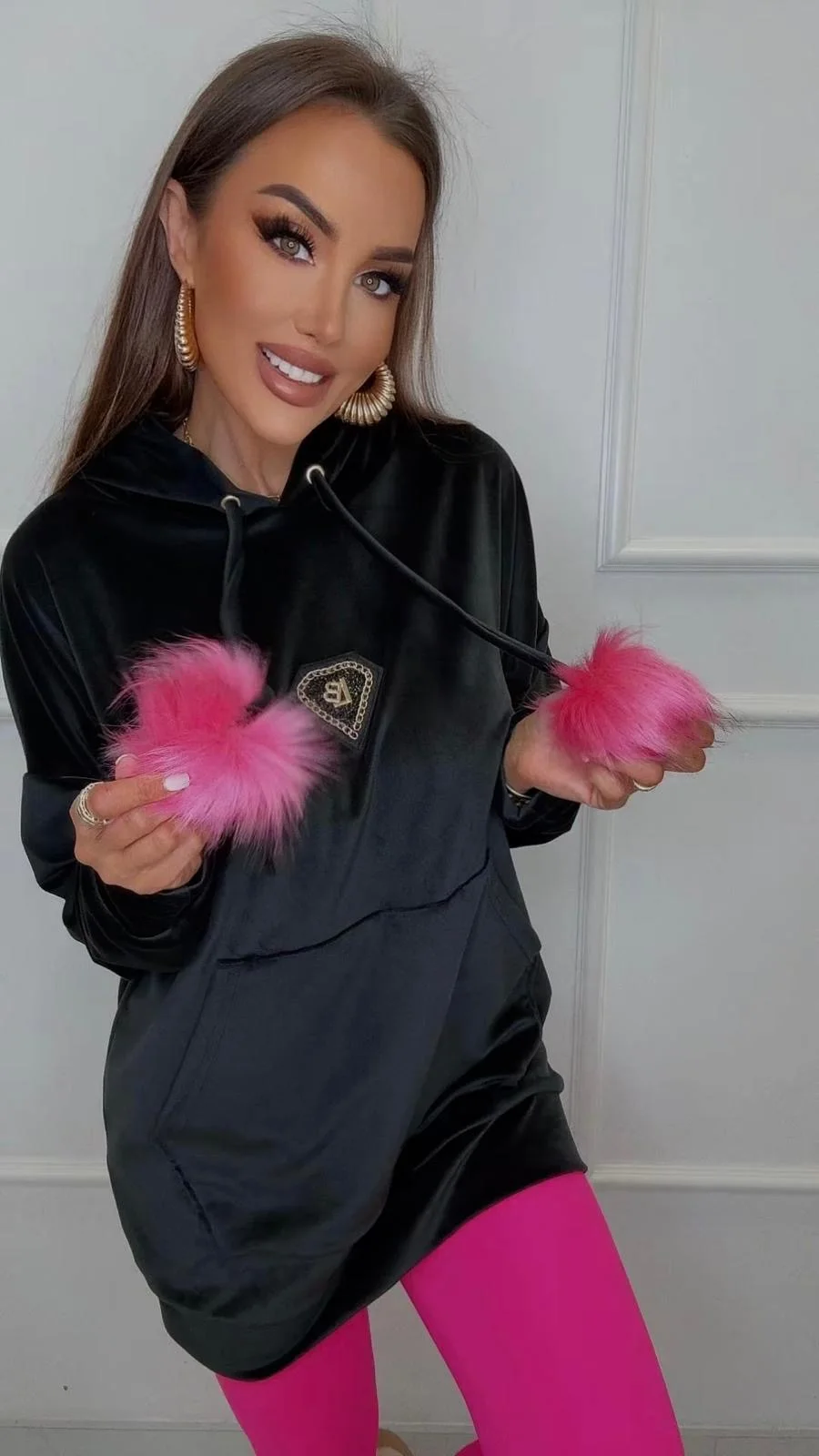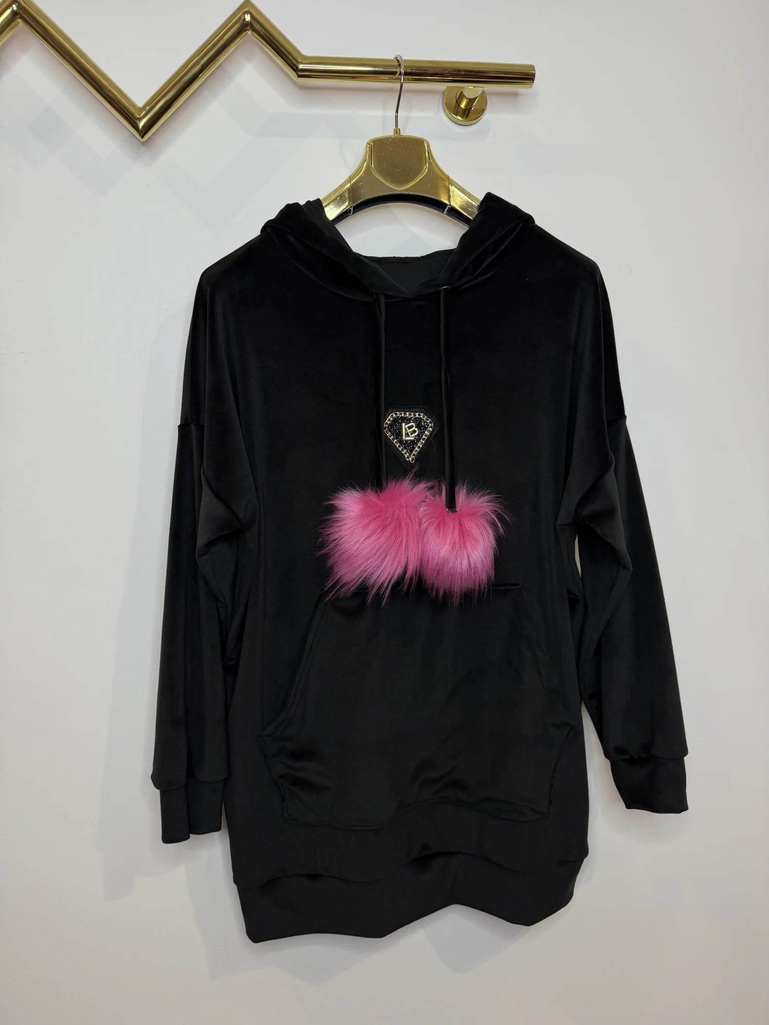 Bluza Lola Bianka bluza welurowa czarna cieniutka z pięknymi pomponami, na przodzie kieszeń kangurka, kaptur