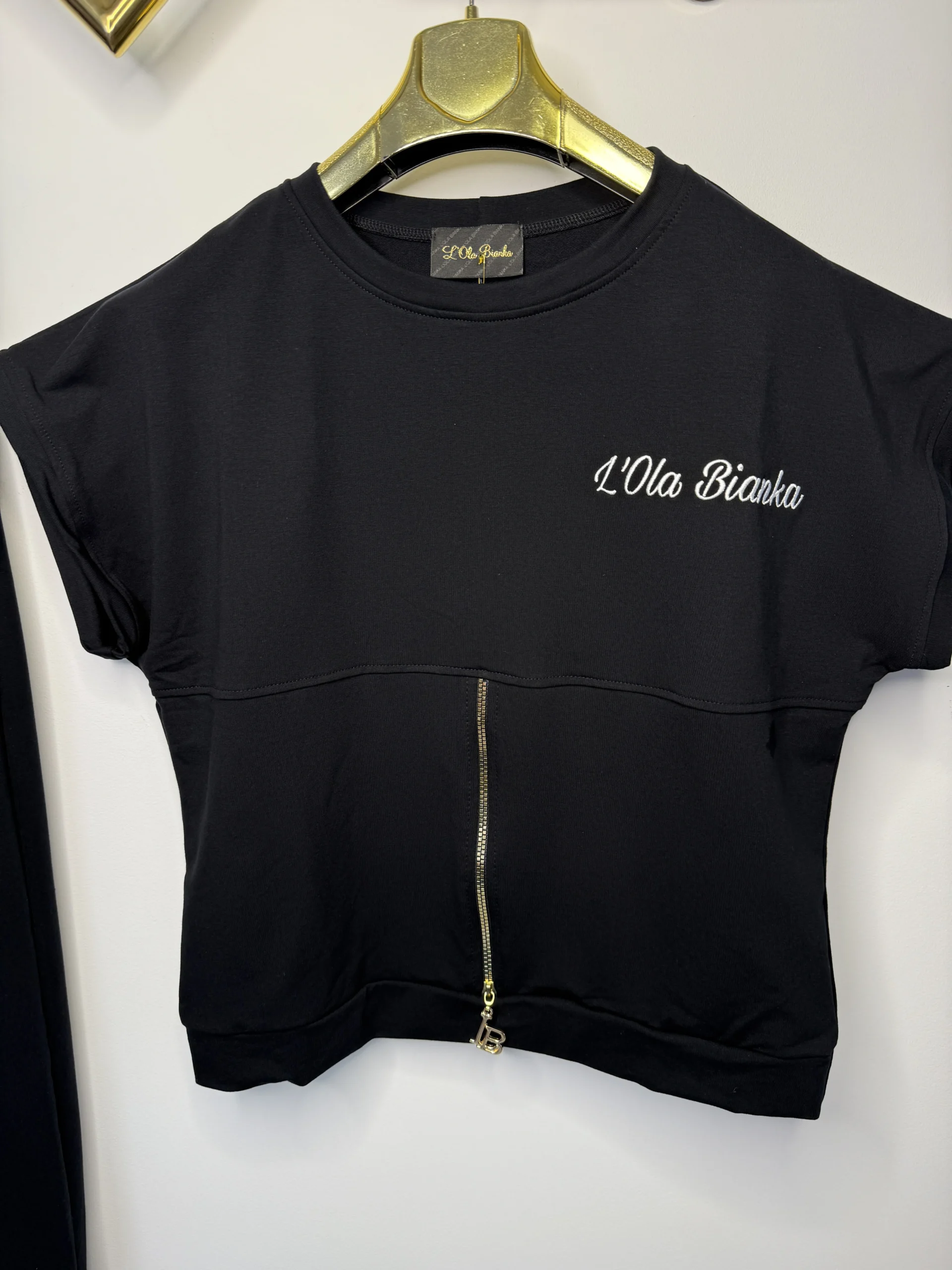 Bluza ma luźny fason i jest wkładana przez głowę. Posiada krótki rękaw, co nadaje jej nowoczesnego wyglądu. Na środku, u dołu, znajduje się zamek, który można rozpiąć, aby nadać stylizacji lekkości. Przód bluzy zdobi biały haft z logo LOLA BIANKA, podkreślający markowy charakter zestawu.
