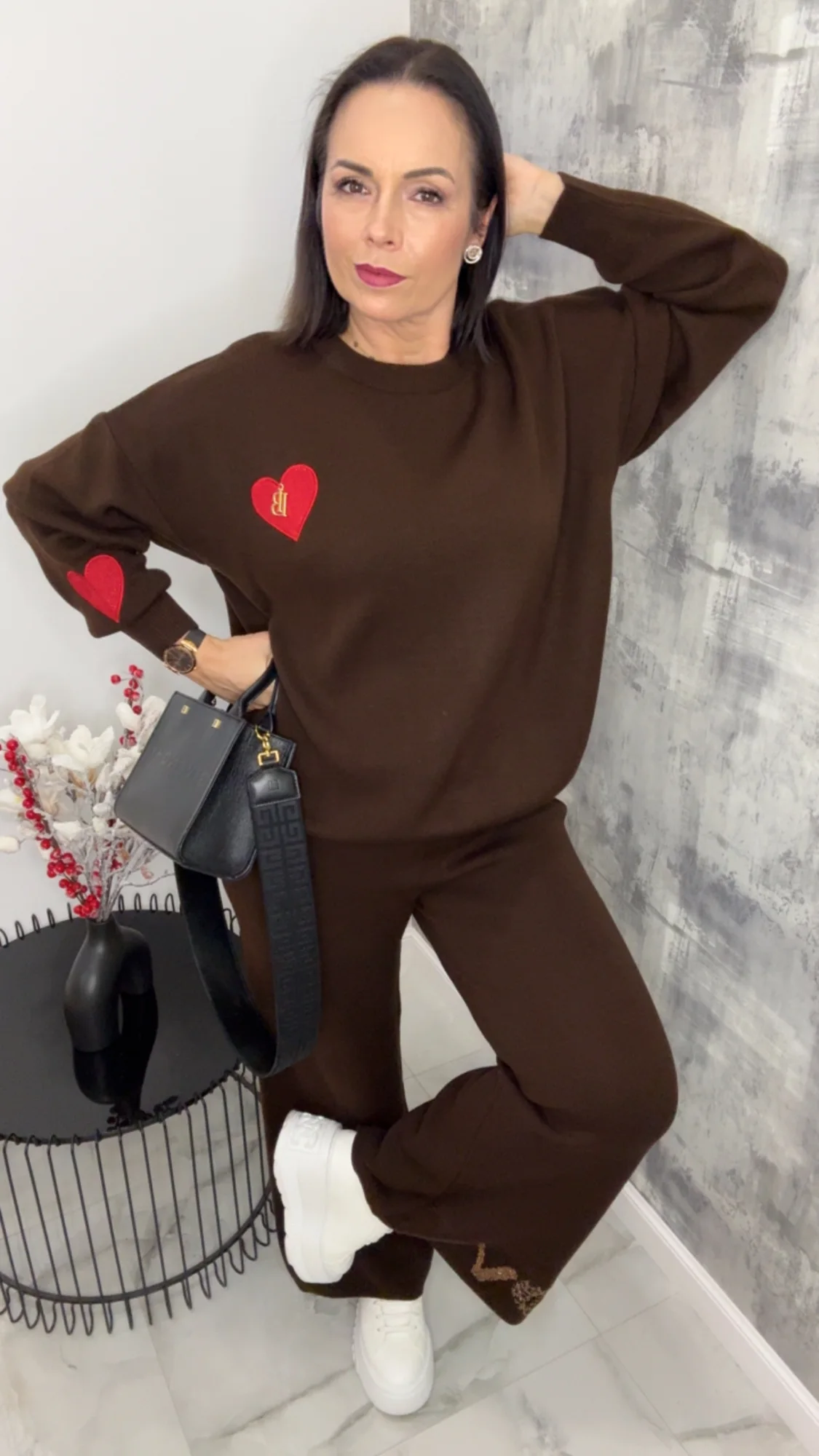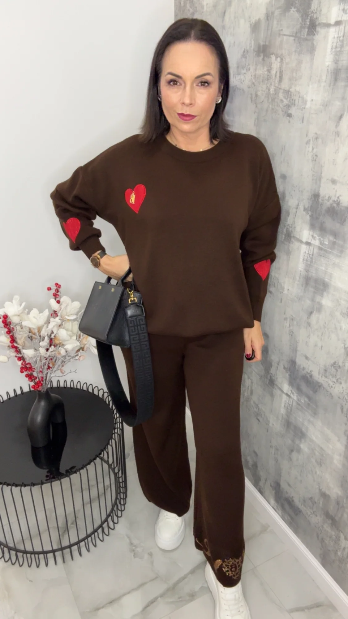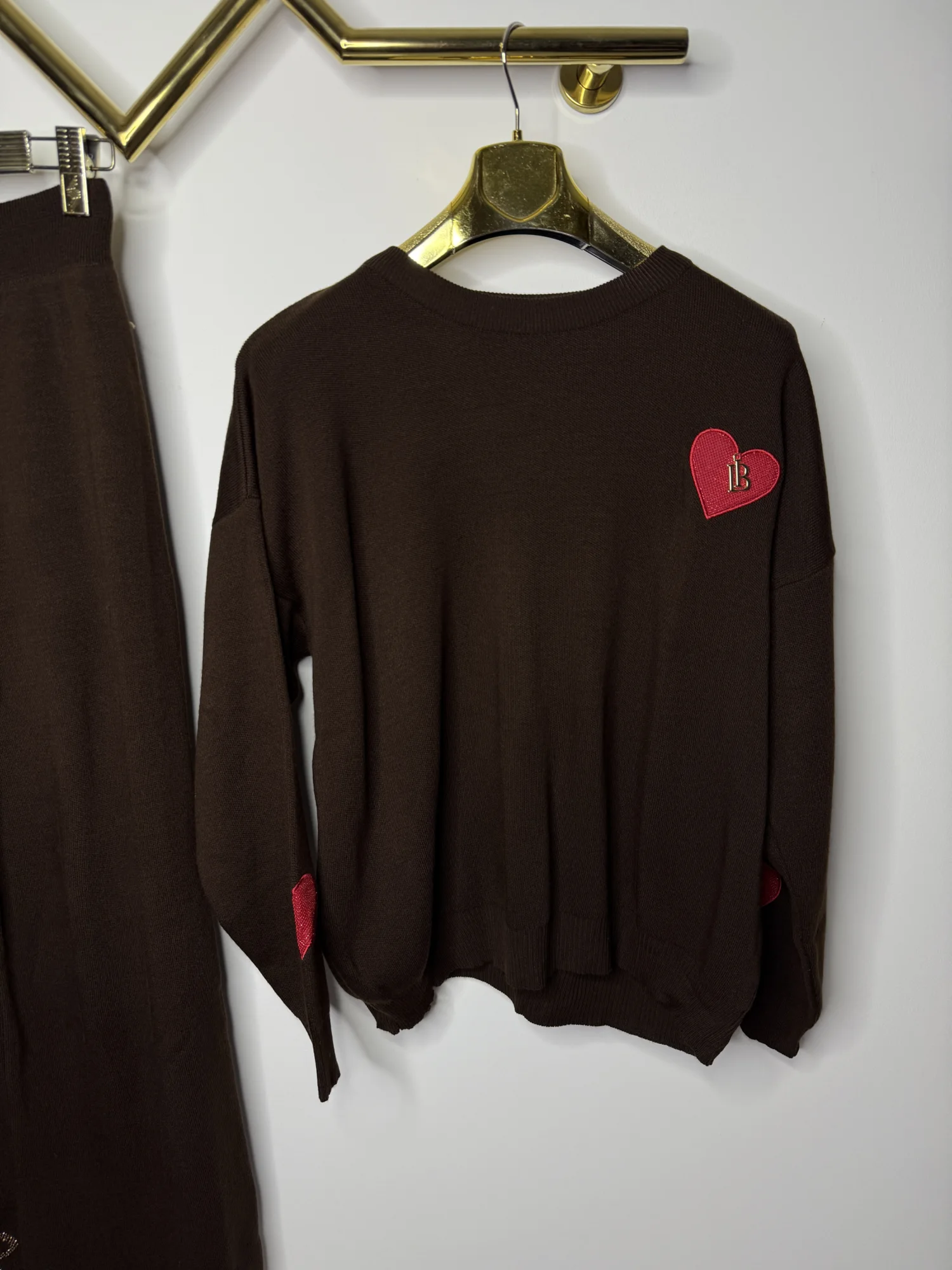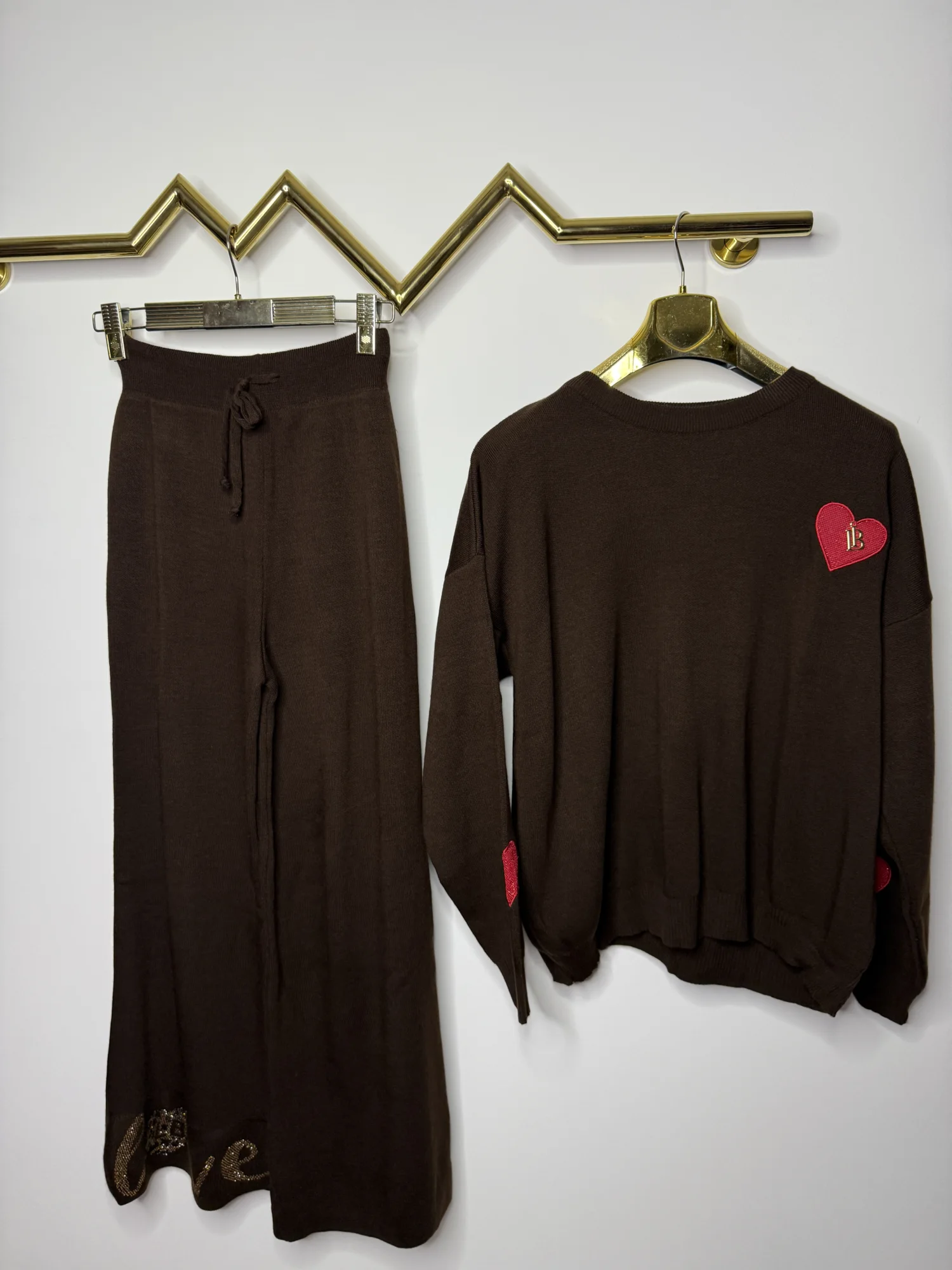 Komplet dzianinowy Lola Bianka czekoladowo brązowy to stylowy i wygodny zestaw 2-częściowy, który łączy modny wygląd z komfortem noszenia. W skład kompletu wchodzą: bluza z długim rękawem pięknie zdobiona detalami w postaci logowanych czerwonych serduszek i spodnie typu dzwony na gumce. To doskonały wybór dla kobiet, które lubią czuć się dobrze i wyglądać modnie każdego dnia.