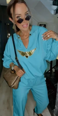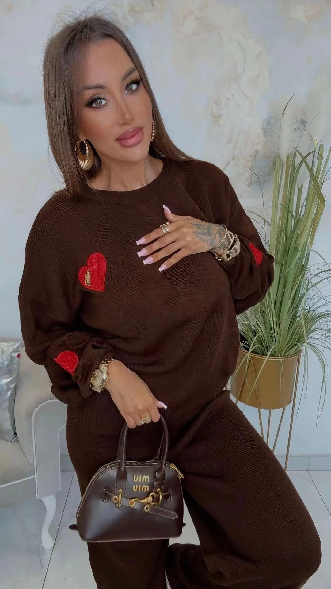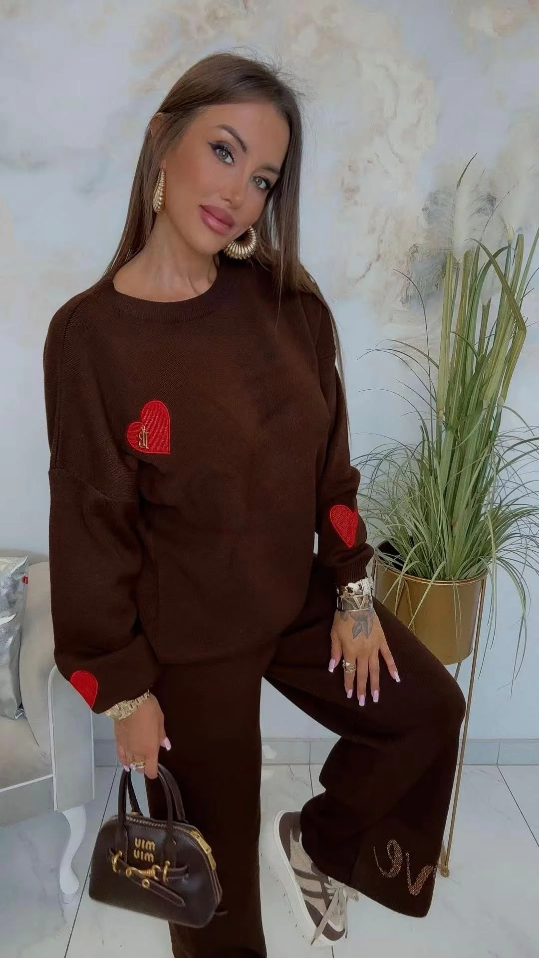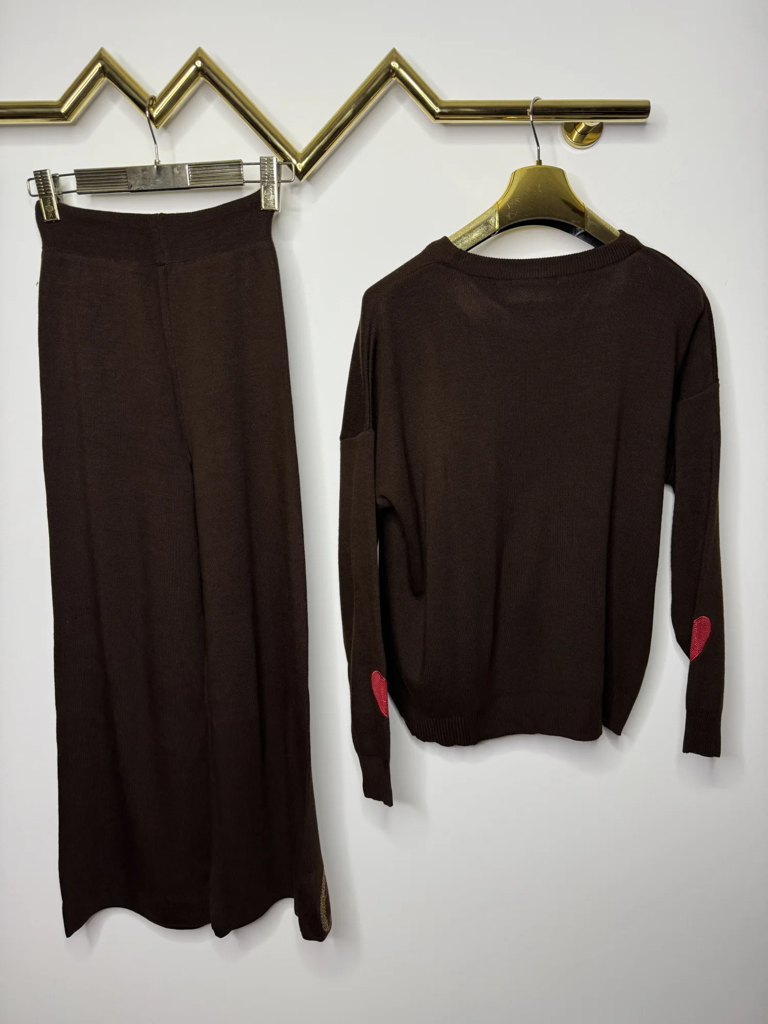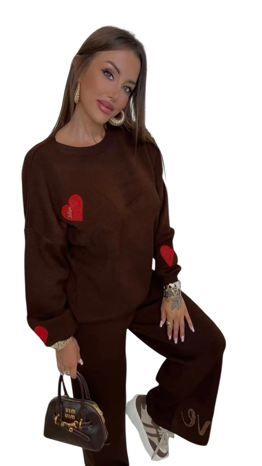 Komplet dzianinowy Lola Bianka czekoladowo brązowy to stylowy i wygodny zestaw 2-częściowy, który łączy modny wygląd z komfortem noszenia. W skład kompletu wchodzą: bluza z długim rękawem pięknie zdobiona detalami w postaci logowanych czerwonych serduszek i spodnie typu dzwony na gumce. To doskonały wybór dla kobiet, które lubią czuć się dobrze i wyglądać modnie każdego dnia.