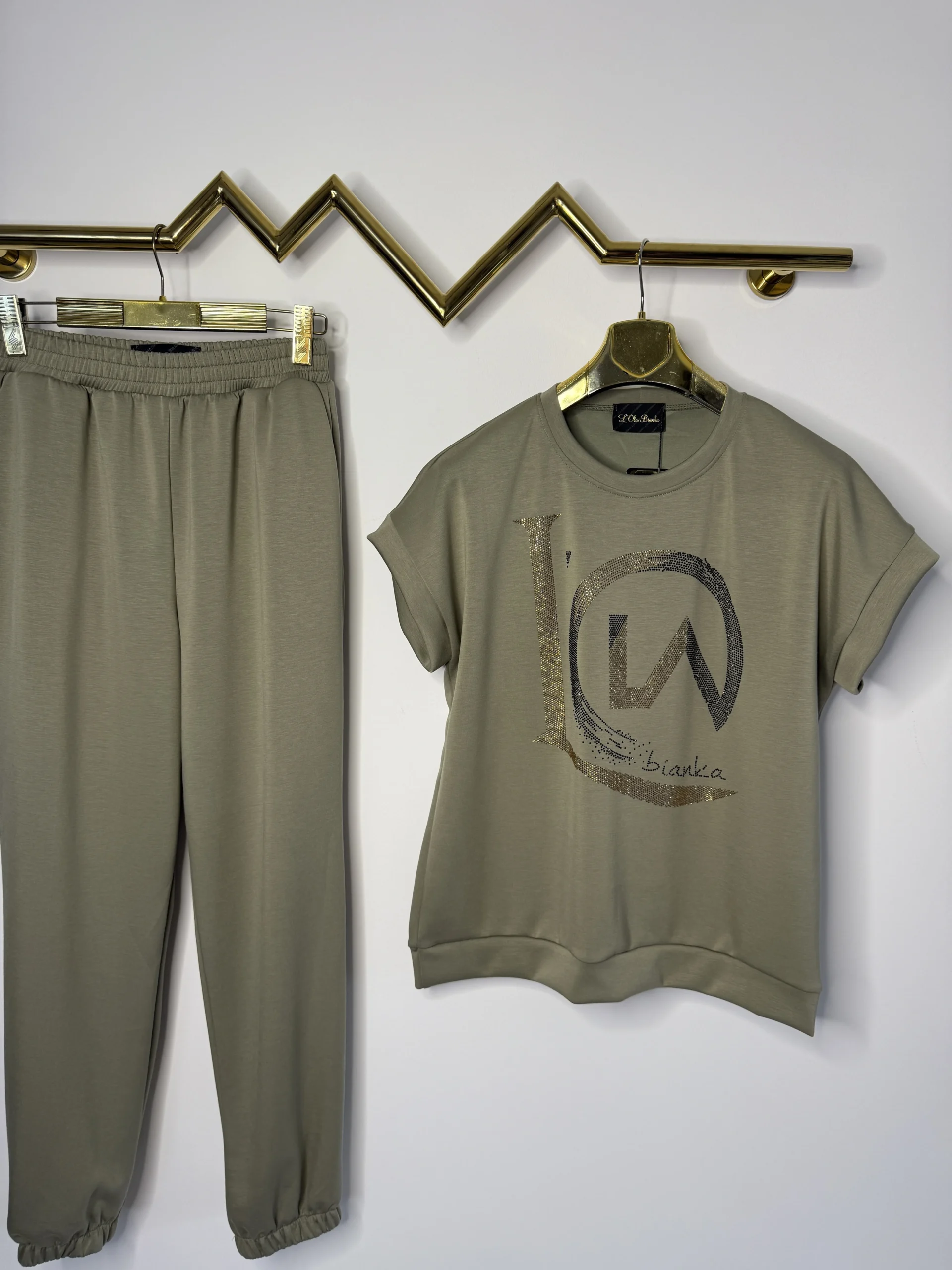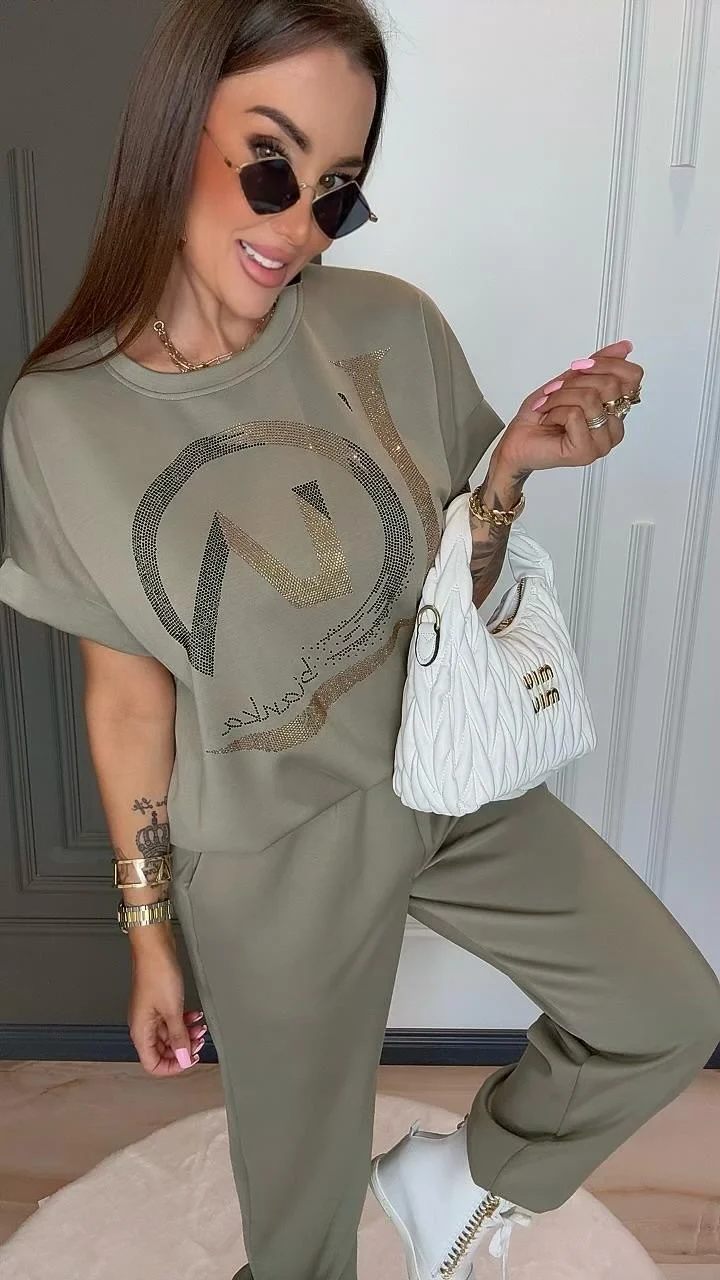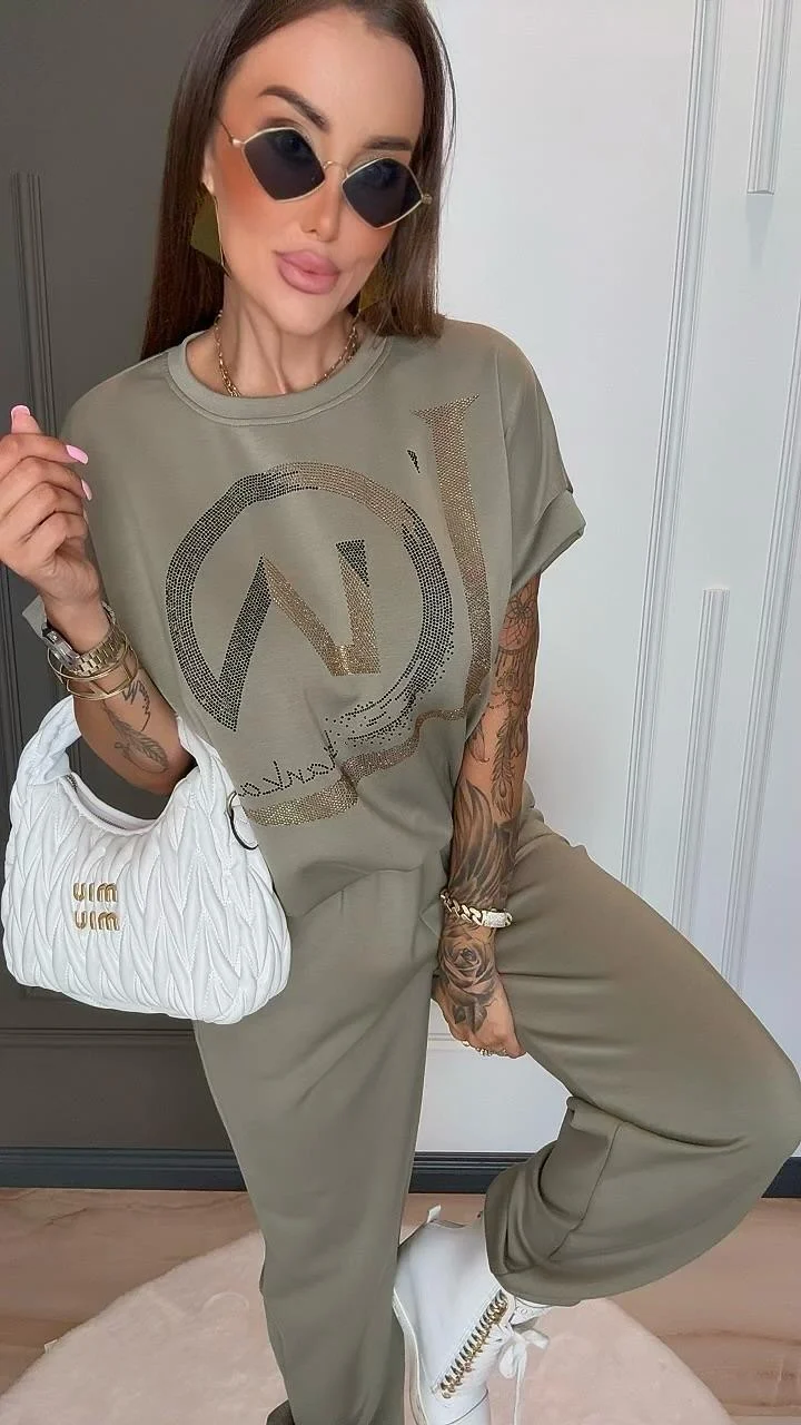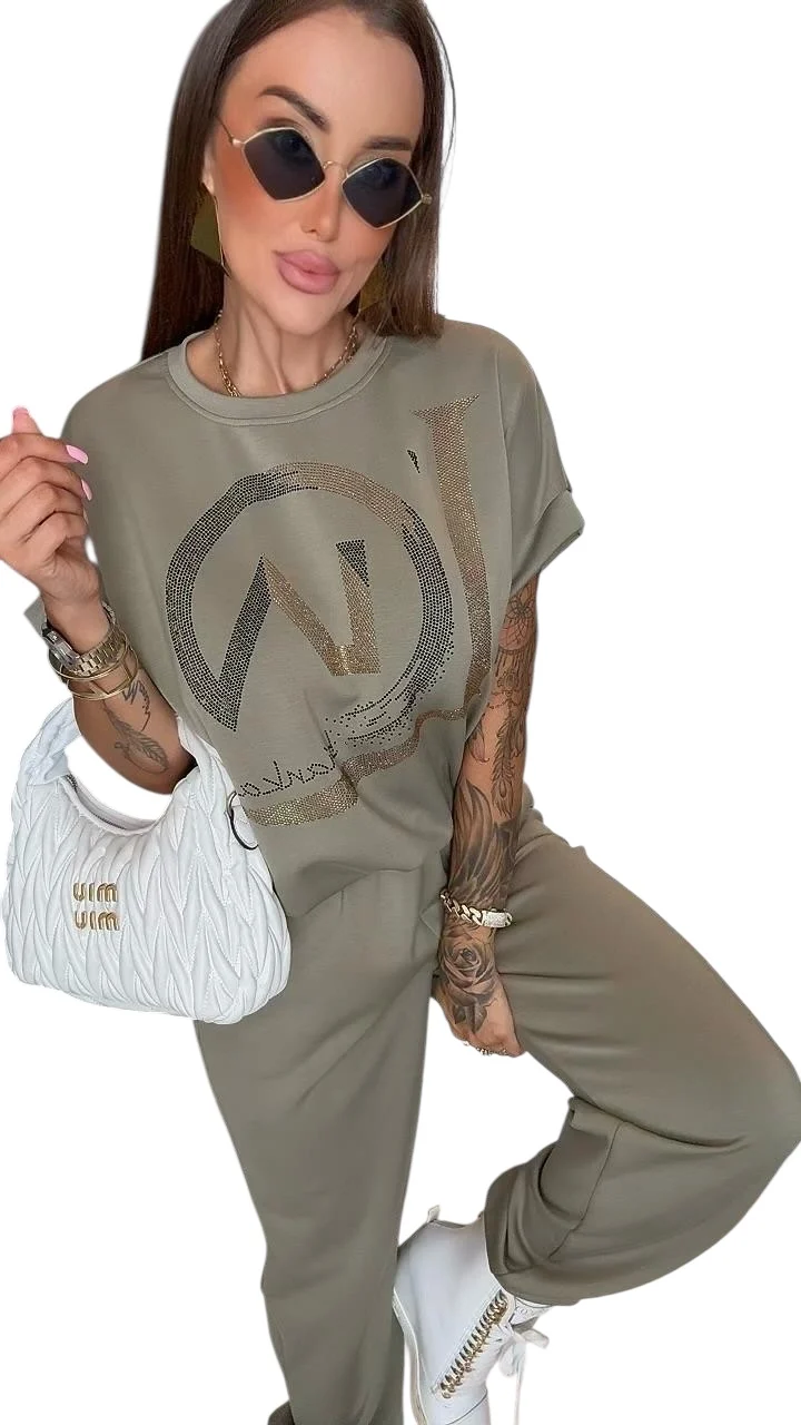 Dres damski LOLA BIANKA khaki, bluza z krótkim rękawem i spodnie na gumce z kieszeniami. Rozmiar uniwersalny M/L. Styl sportowy i elegancki w jednym.
