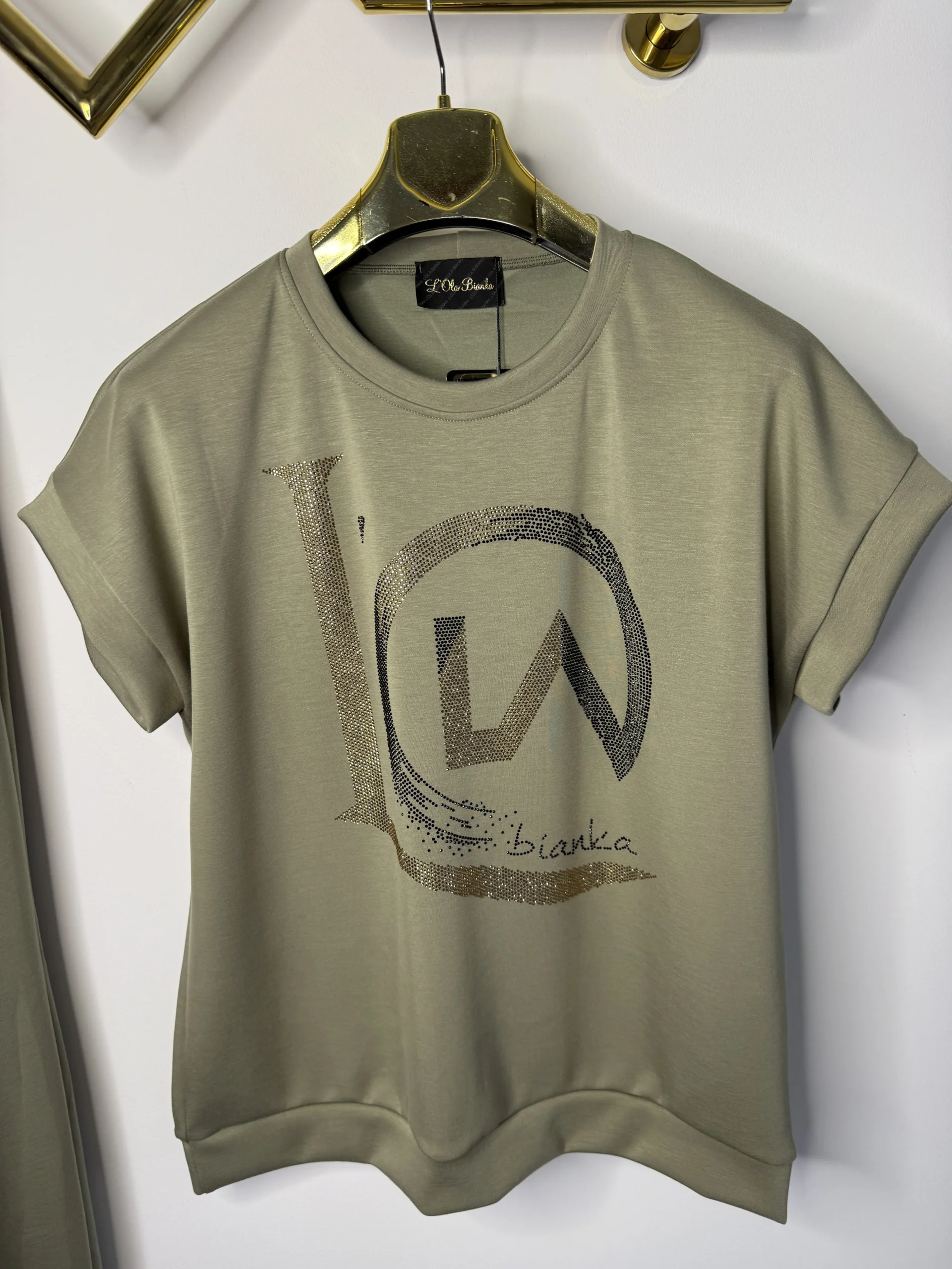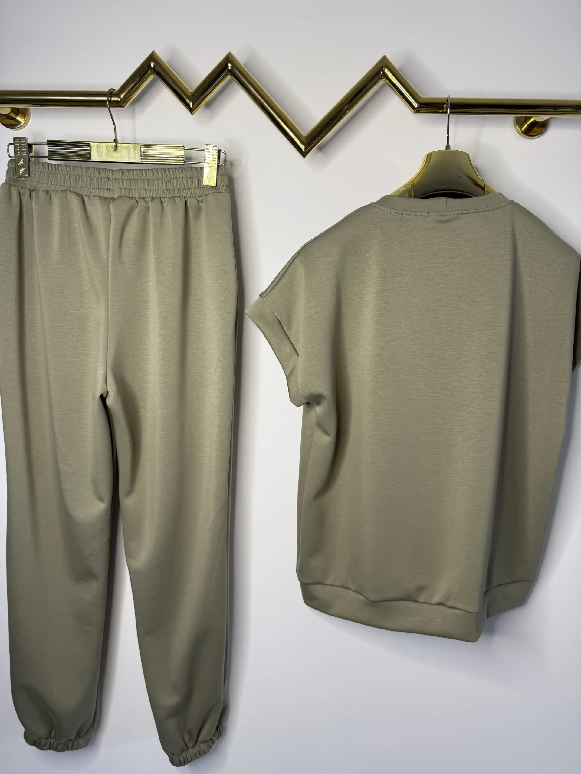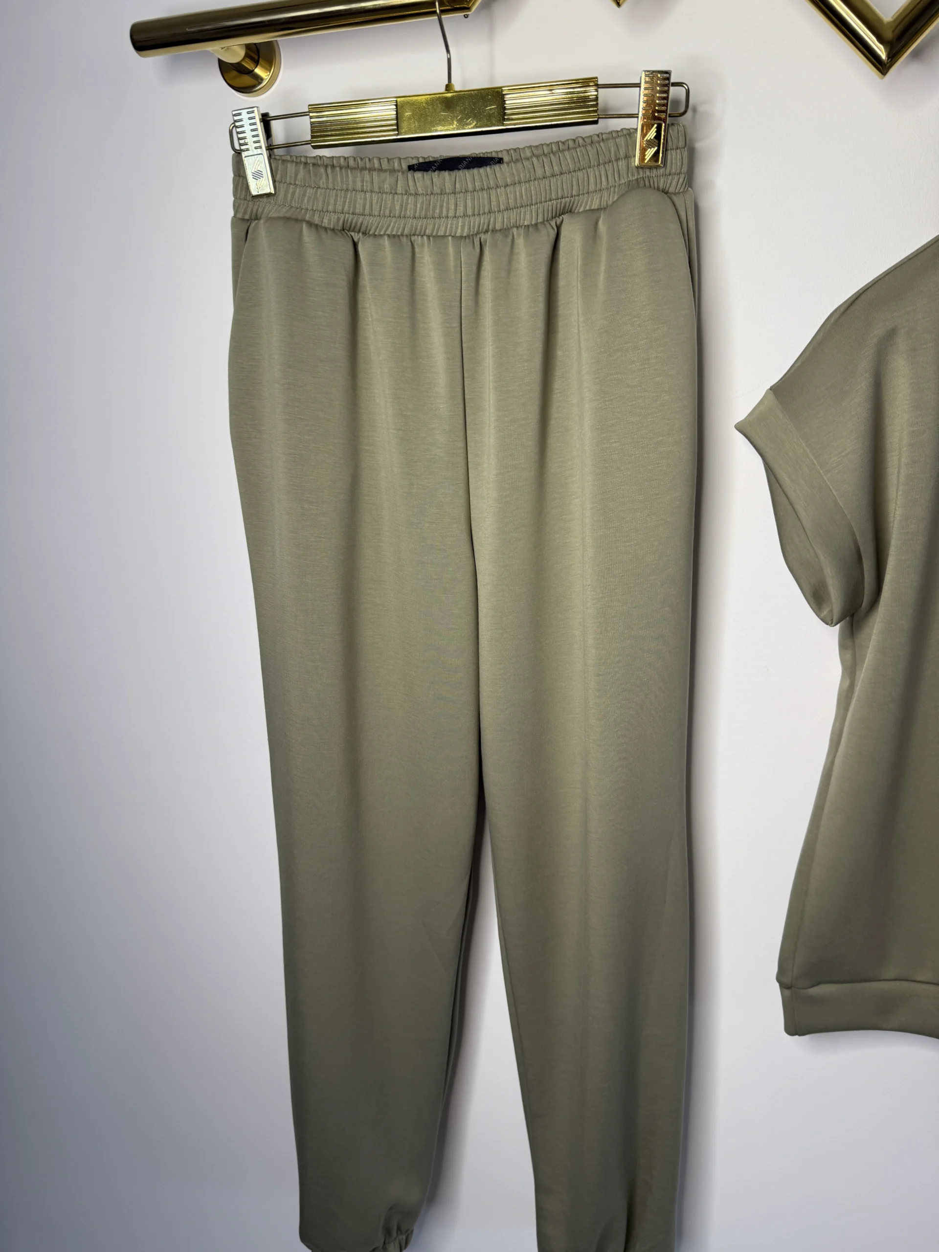 Dres damski LOLA BIANKA khaki, bluza z krótkim rękawem i spodnie na gumce z kieszeniami. Rozmiar uniwersalny M/L. Styl sportowy i elegancki w jednym.