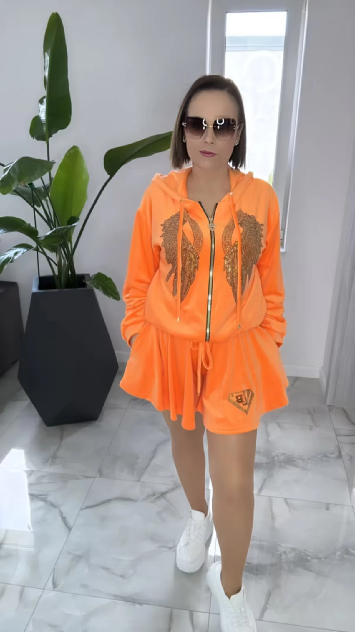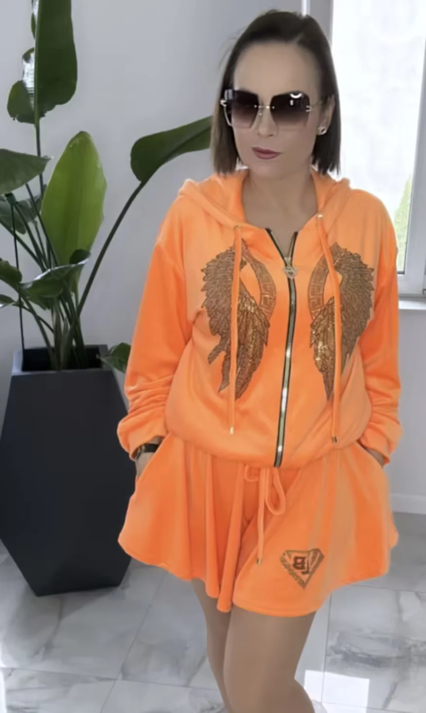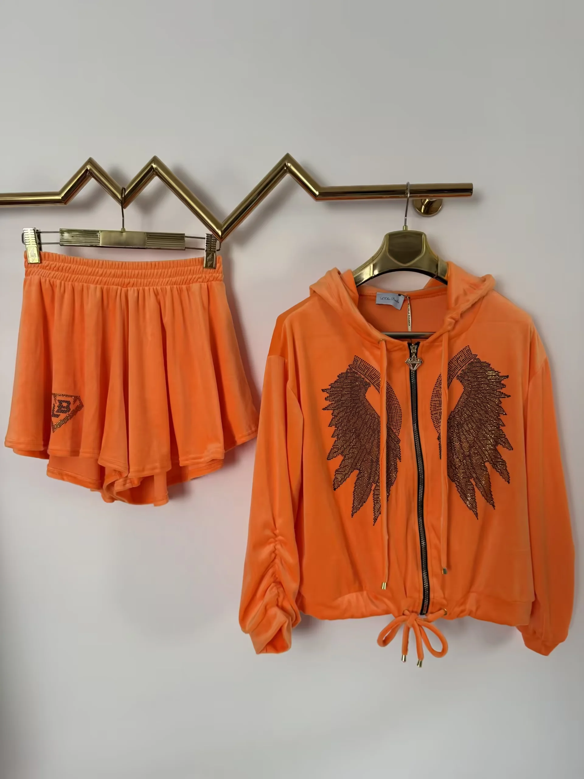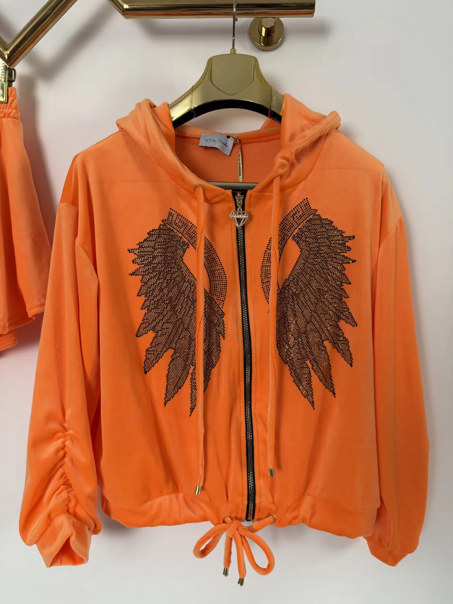 Dres Lola Bianka komplet welurowy pomarańczowy letni w rozmiarze uniwersalnym, bluza z kapturem zapinana na zamek do tego spodenki
