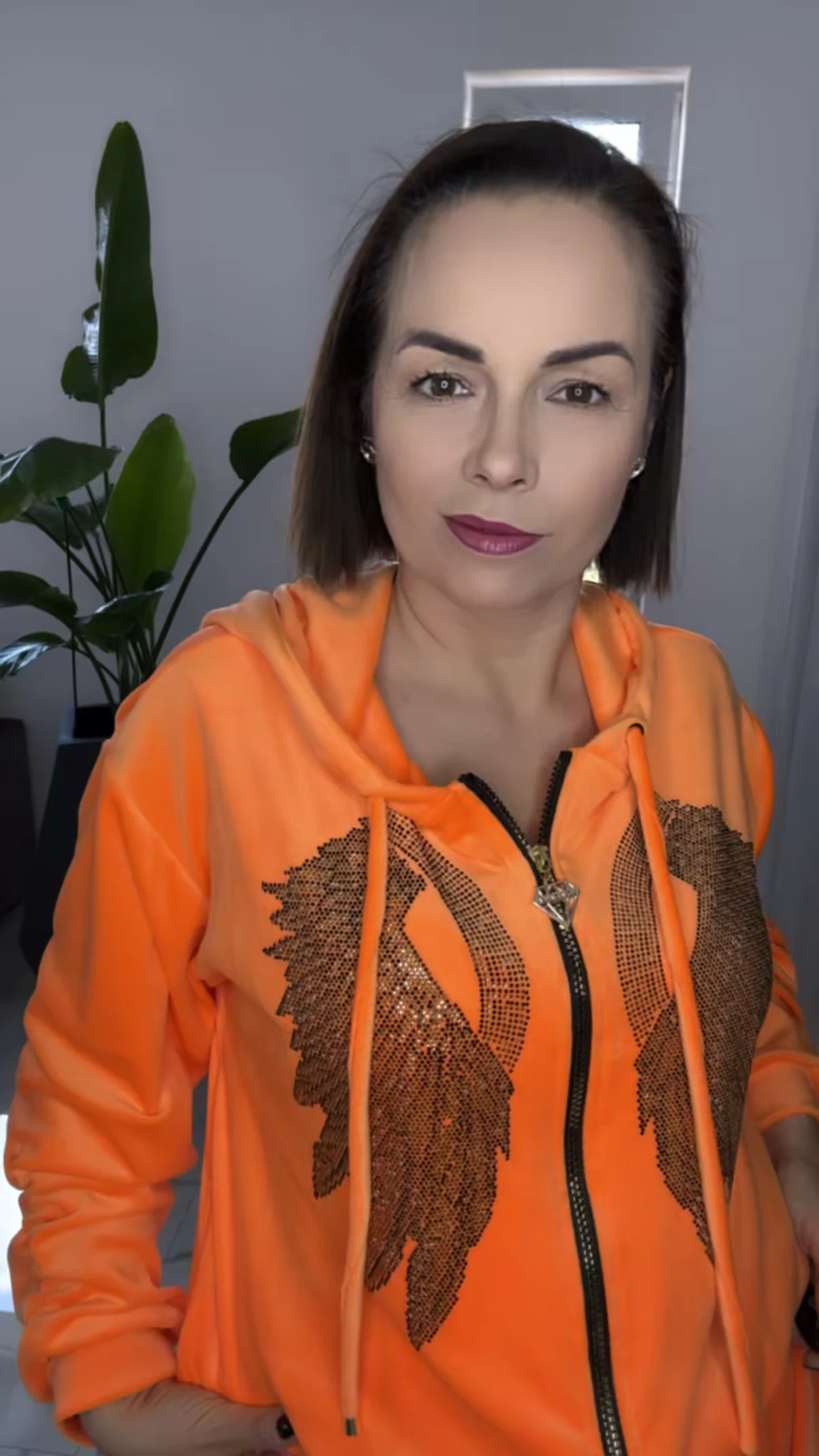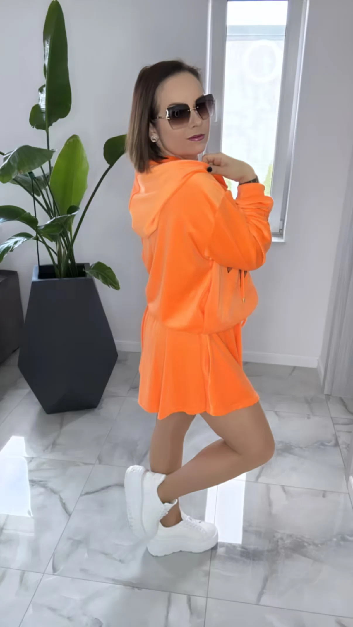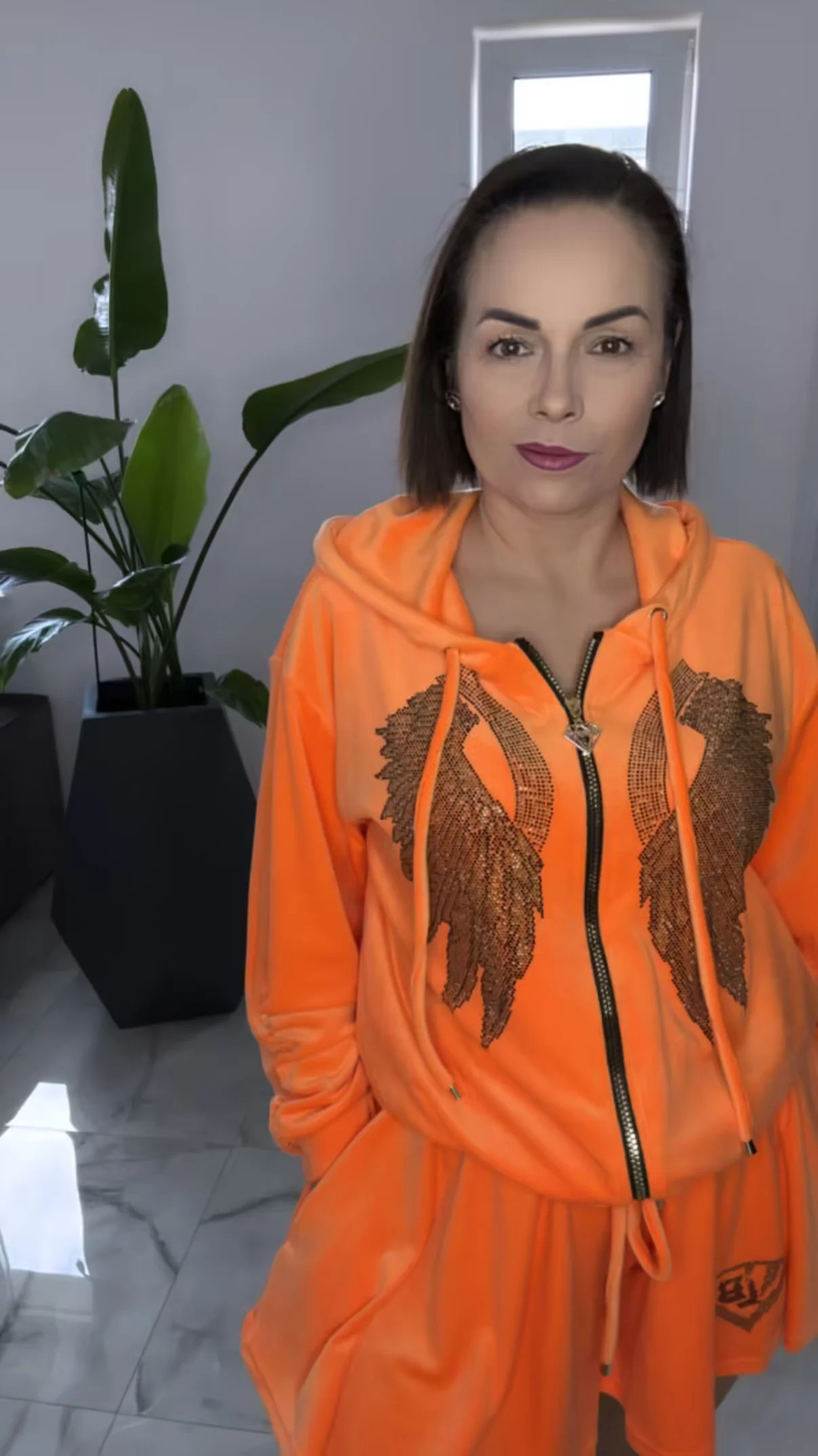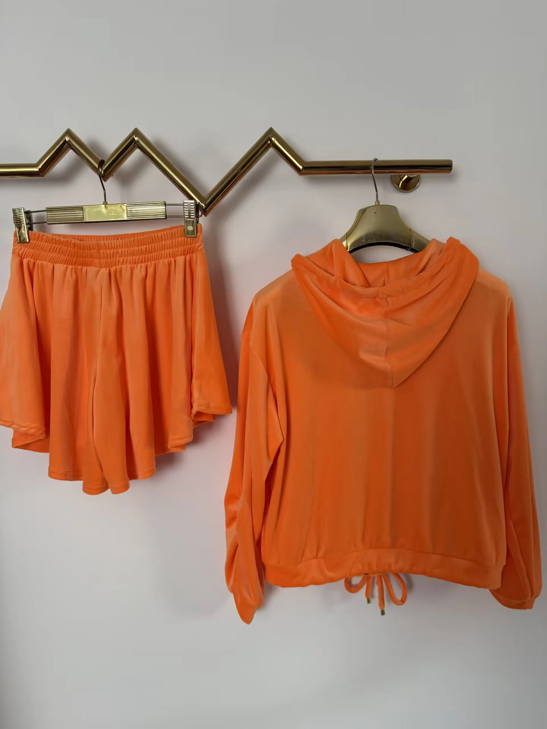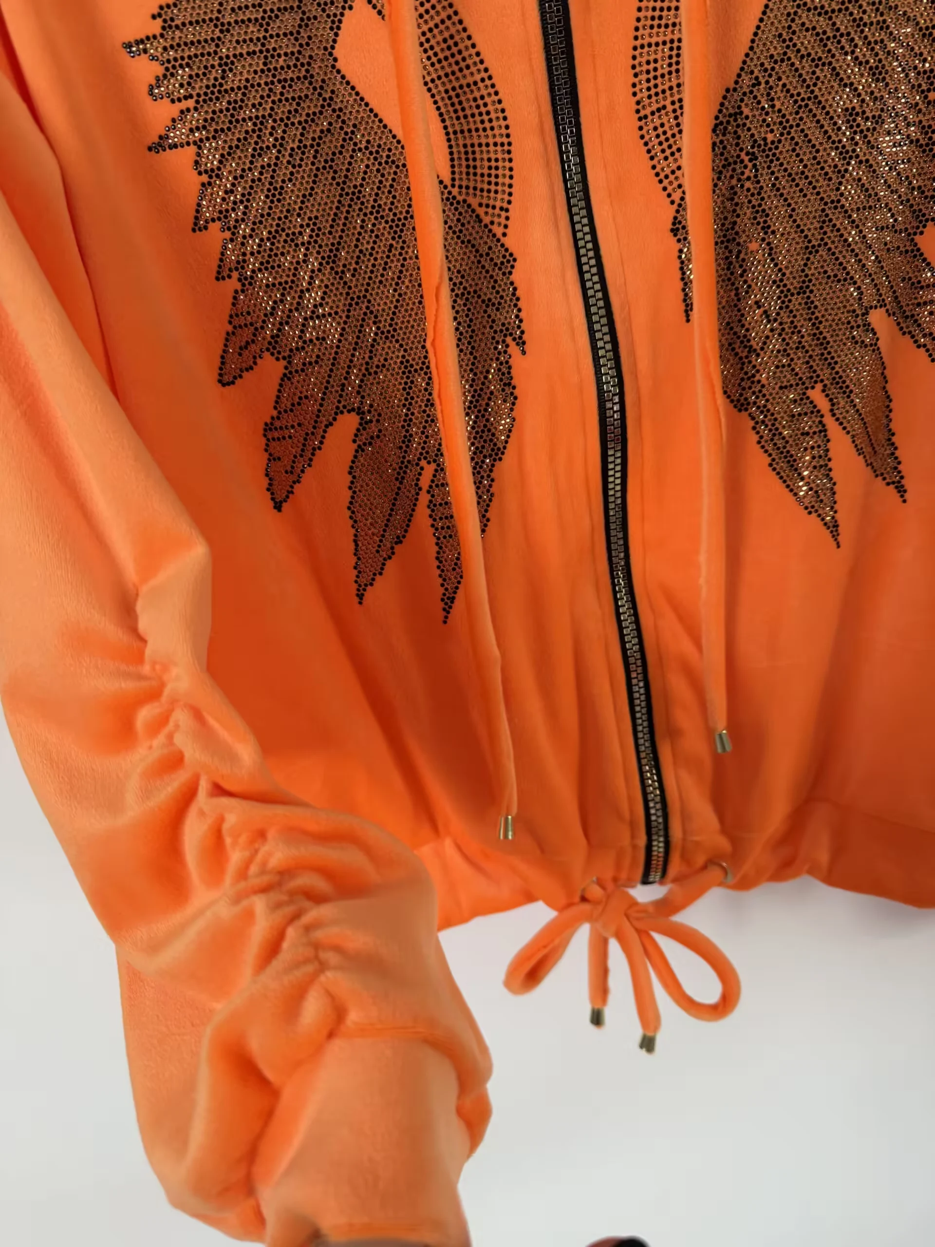 Dres Lola Bianka komplet welurowy pomarańczowy letni w rozmiarze uniwersalnym, bluza z kapturem zapinana na zamek do tego spodenki