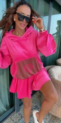 Bluza ma praktyczny kaptur i jest zapinana na zamek. Nie posiada kieszeni, dzięki czemu całość prezentuje się lekko i zgrabnie. Na przodzie znajduje się logo LOLA BIANKA, które podkreśla markowy charakter kompletu.