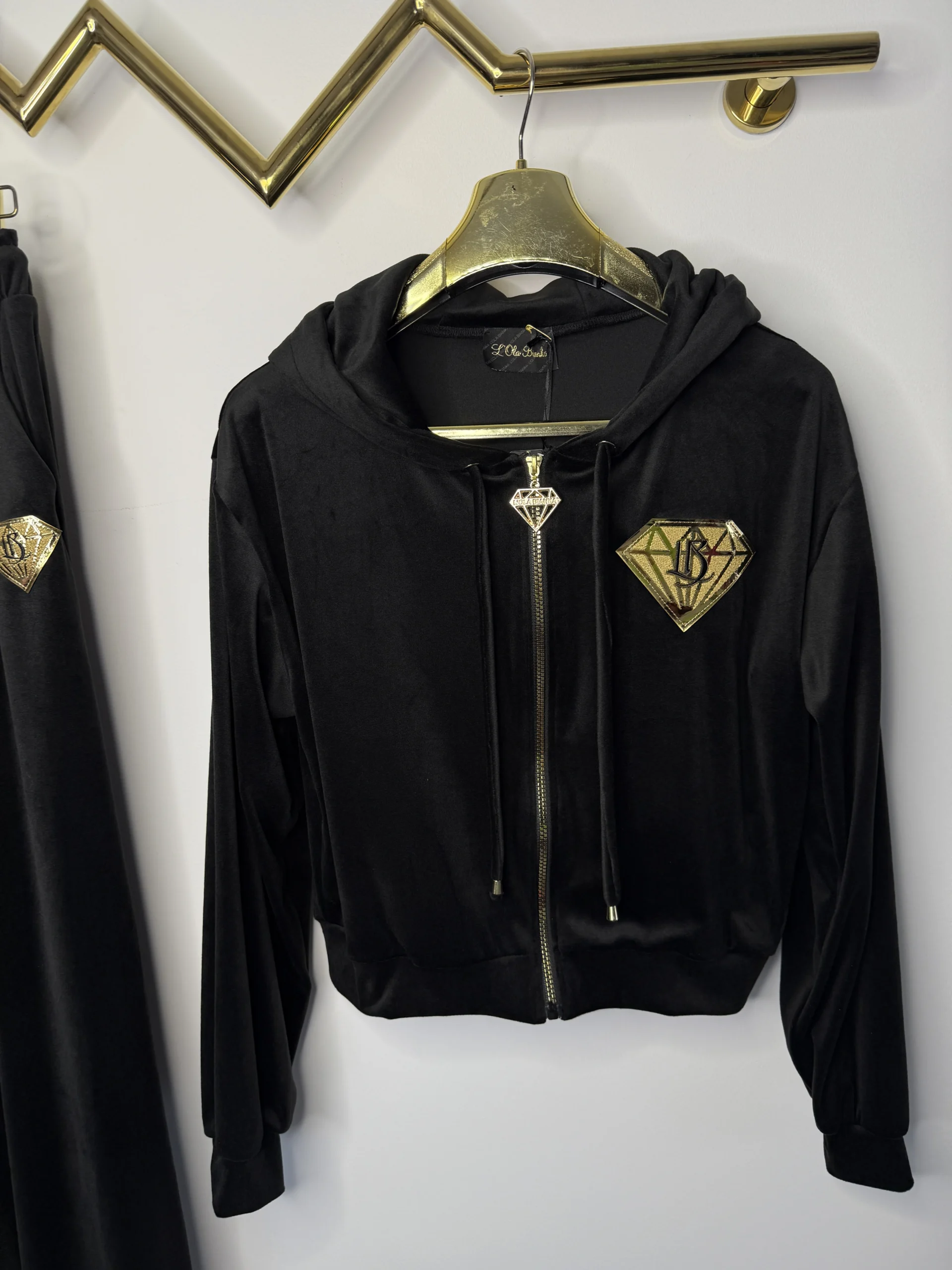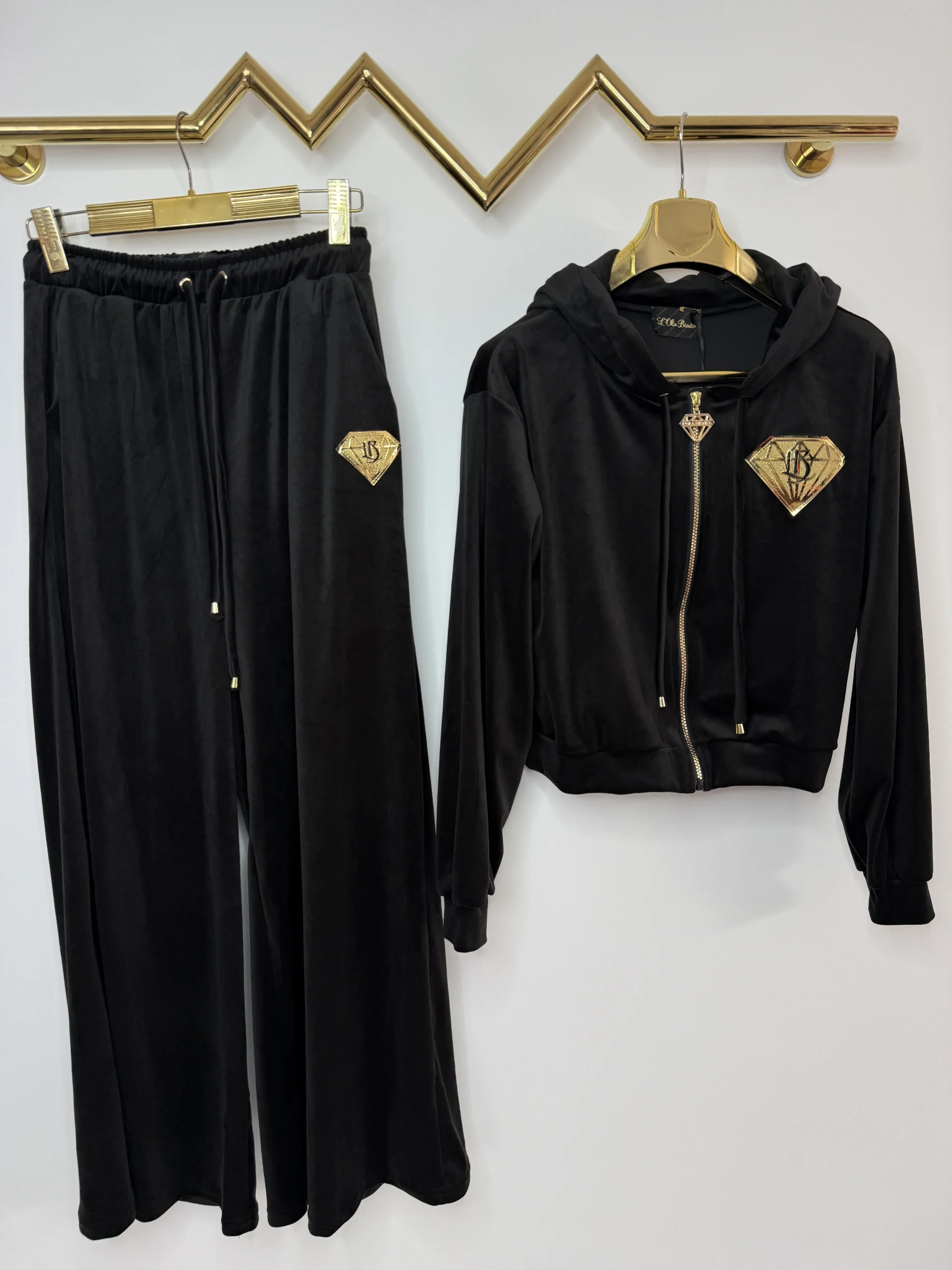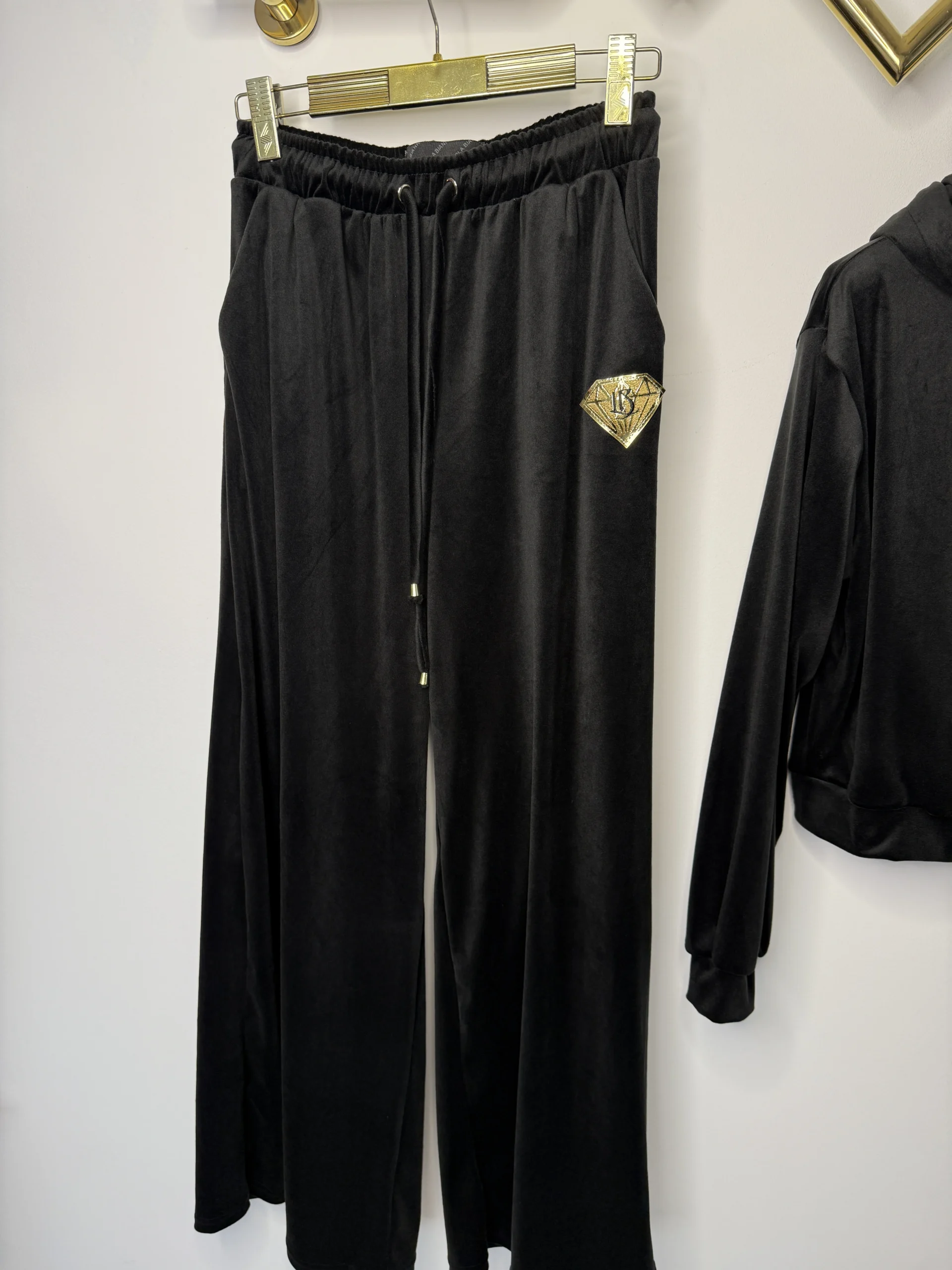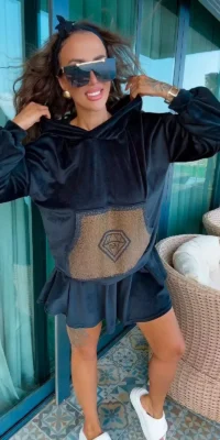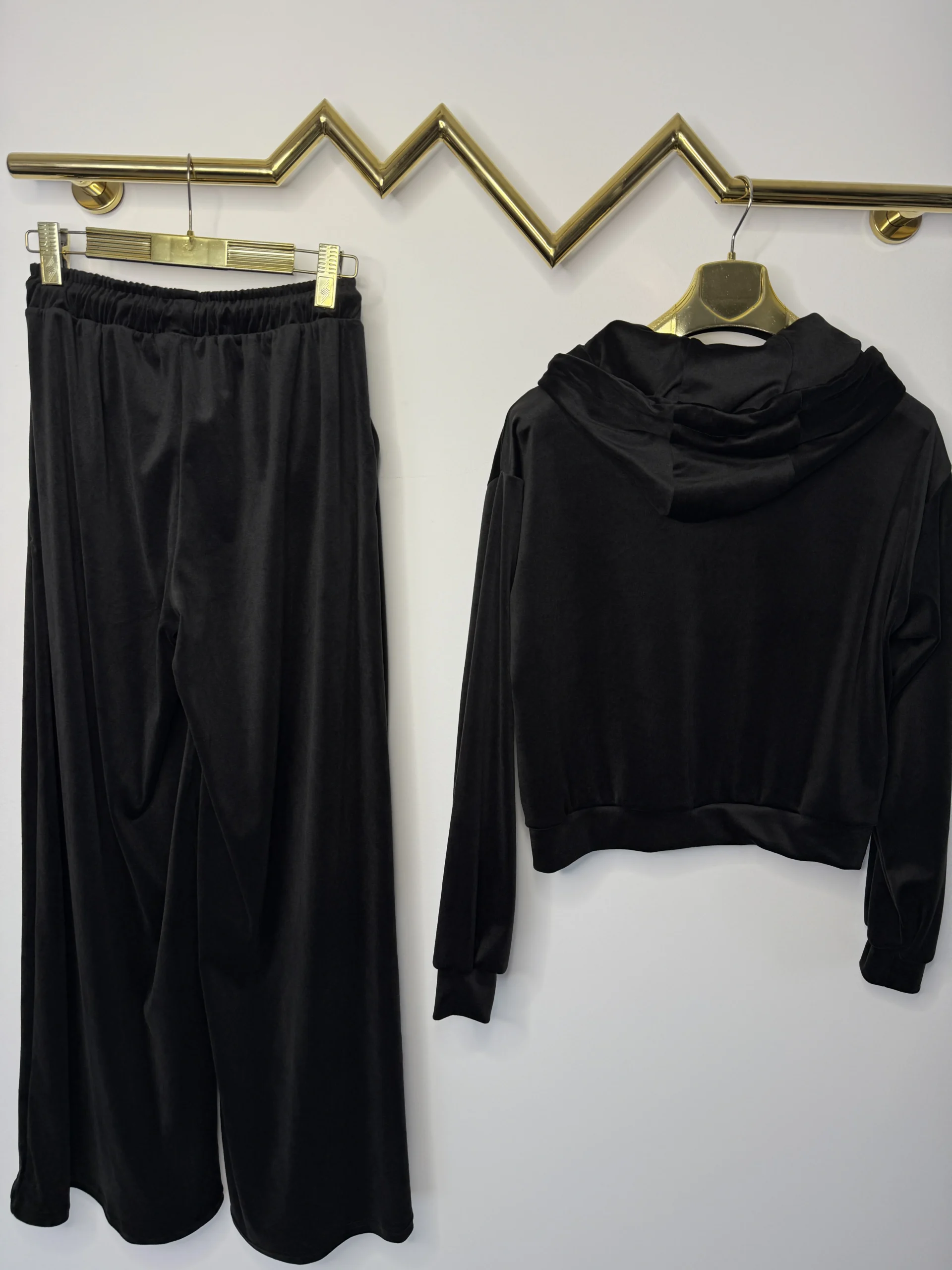 Czarny welurowy dres damski LOLA BIANKA. Bluza z kapturem na zamek i spodnie dzwony na gumce. Rozmiar uniwersalny S,M,L Miękki i wygodny.
