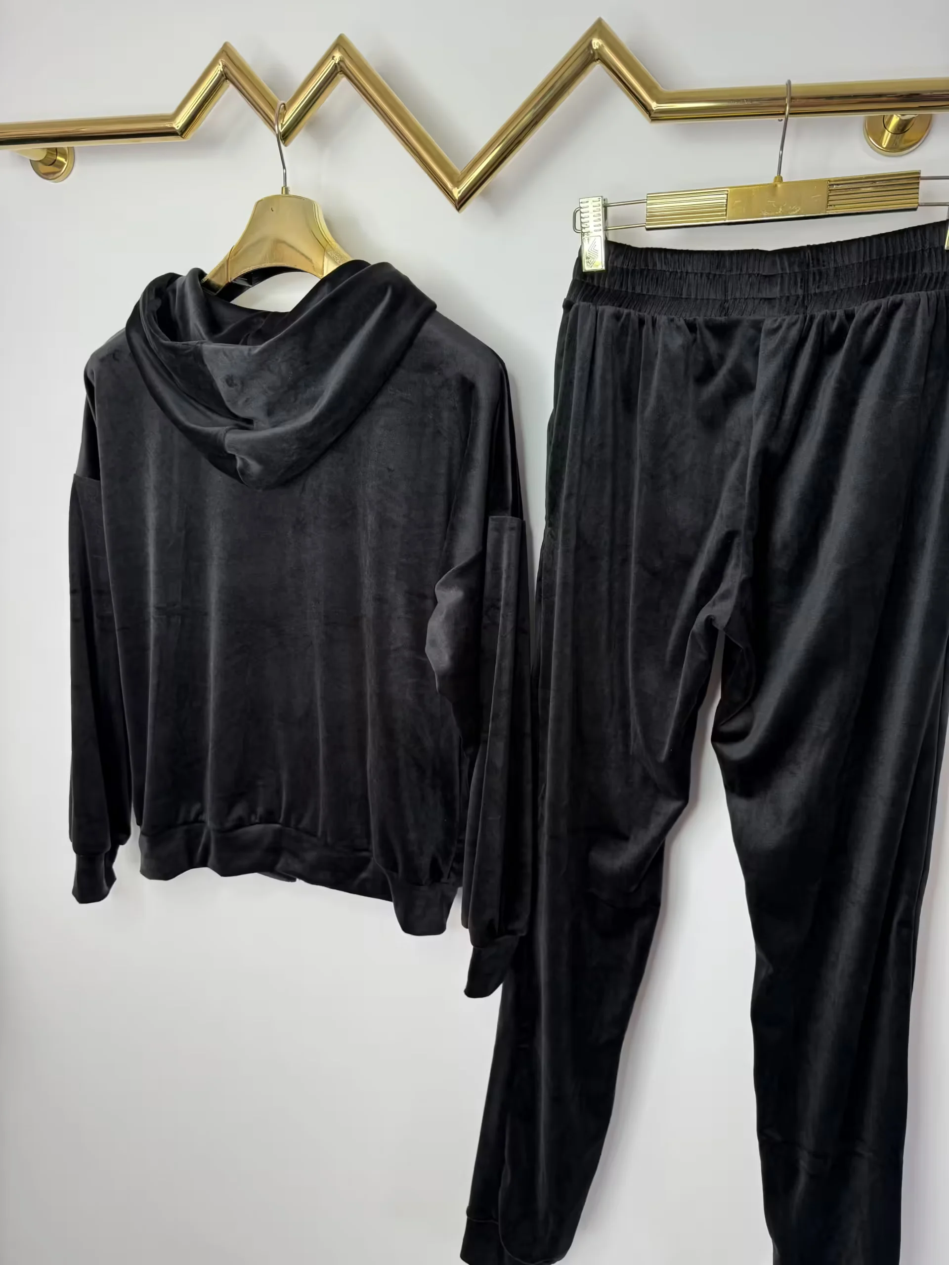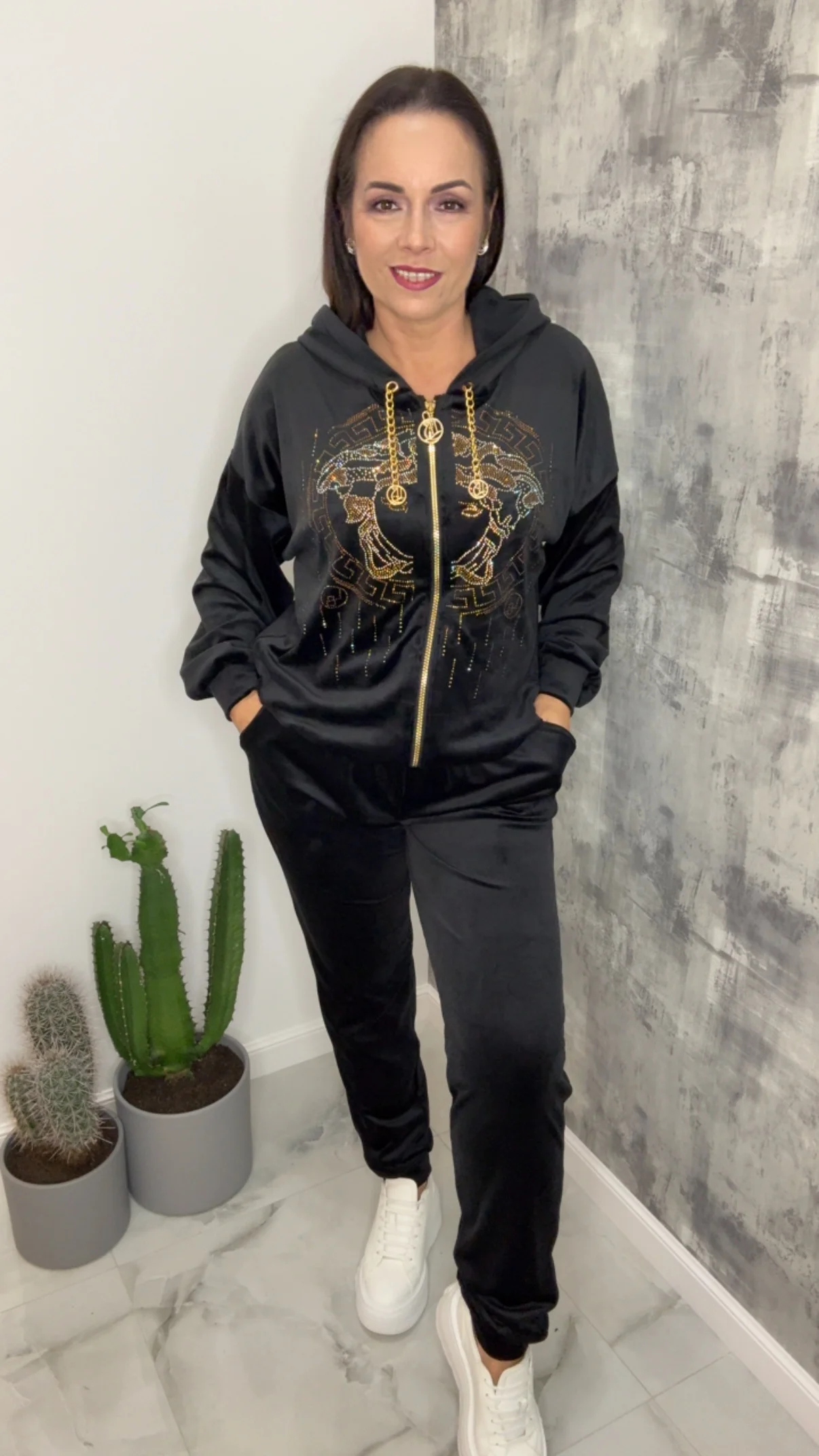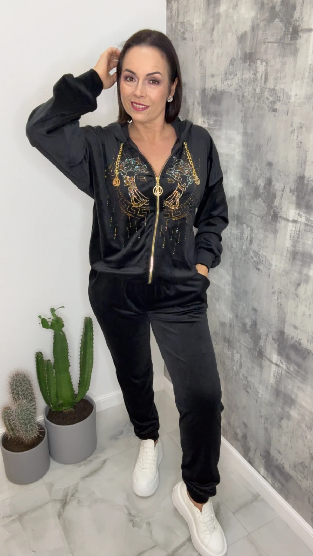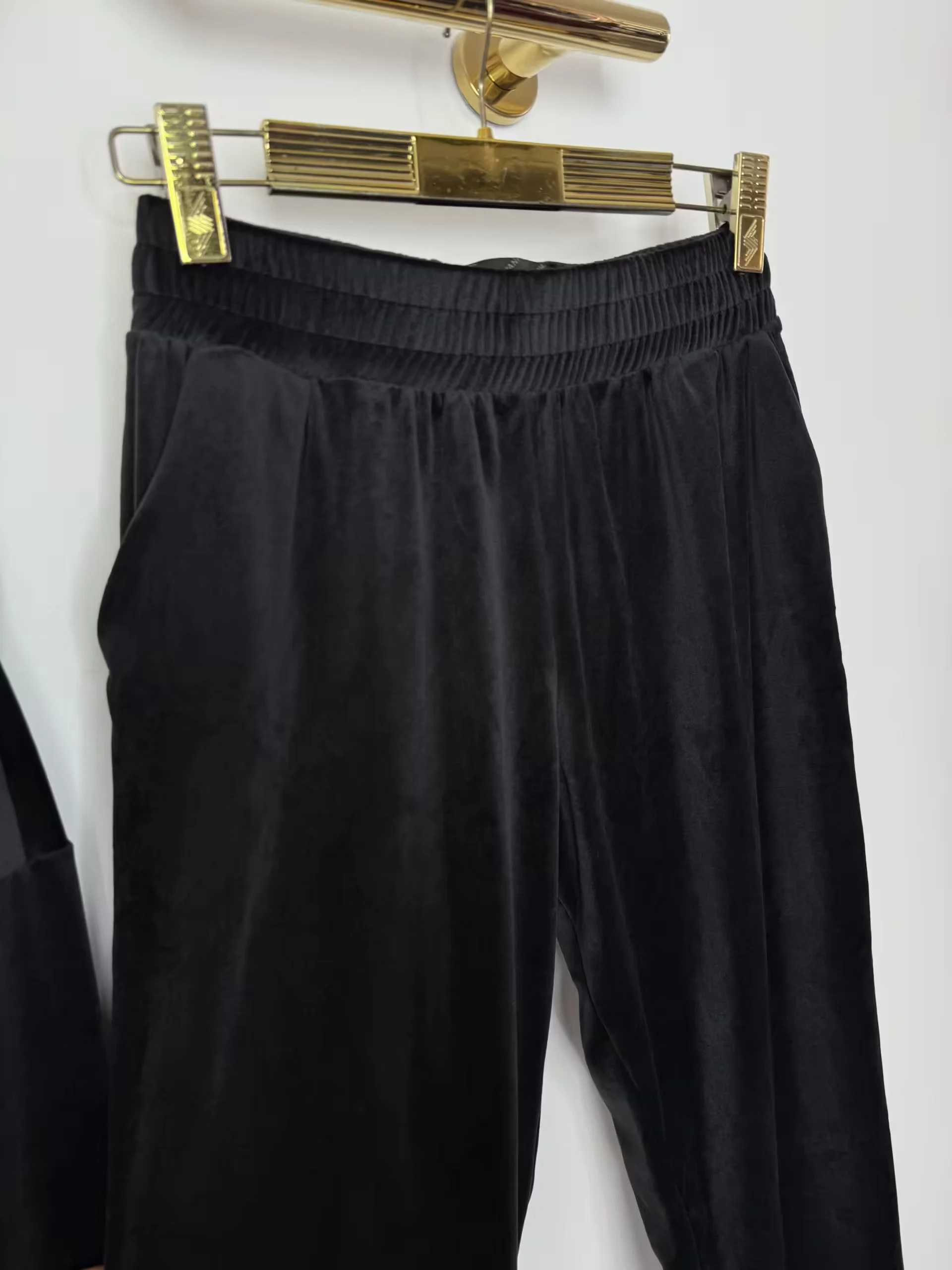 Odkryj niezwykle kobiecy i stylowy komplet welurowy Lola Bianka w klasycznym czarnym kolorze. Wykonany z miękkiego, przyjemnego w dotyku weluru, zapewnia maksymalny komfort noszenia. Idealny zarówno na co dzień, jak i na wyjątkowe okazje.