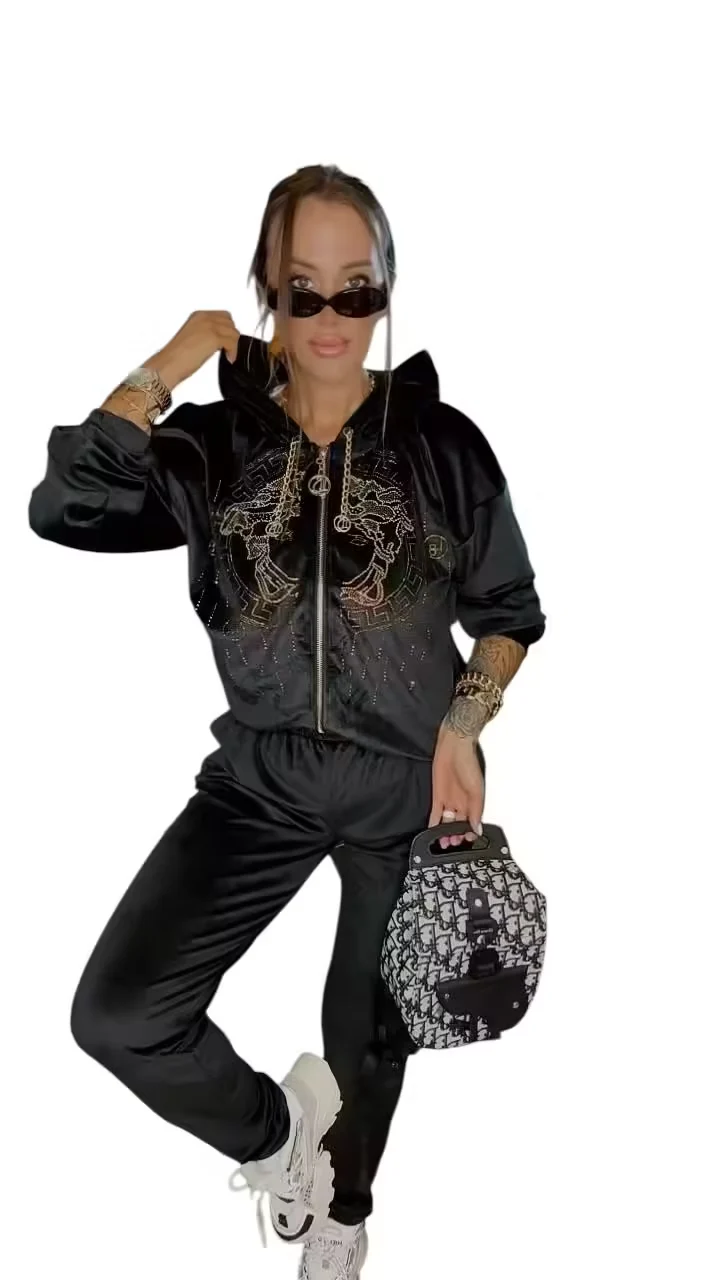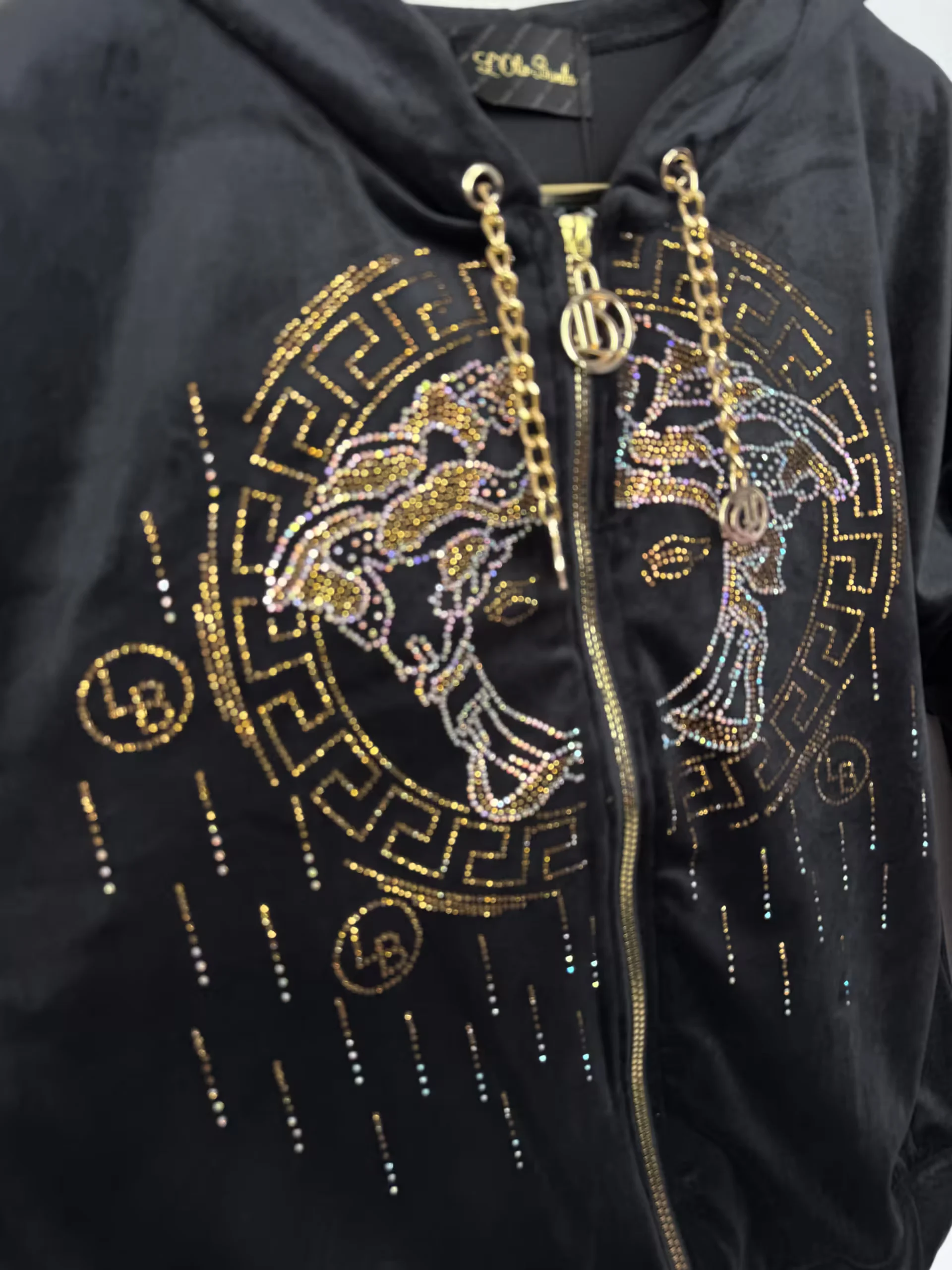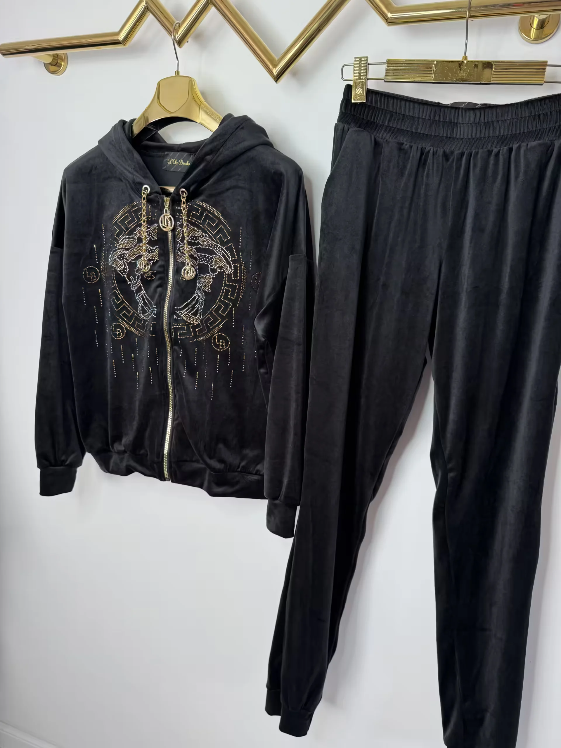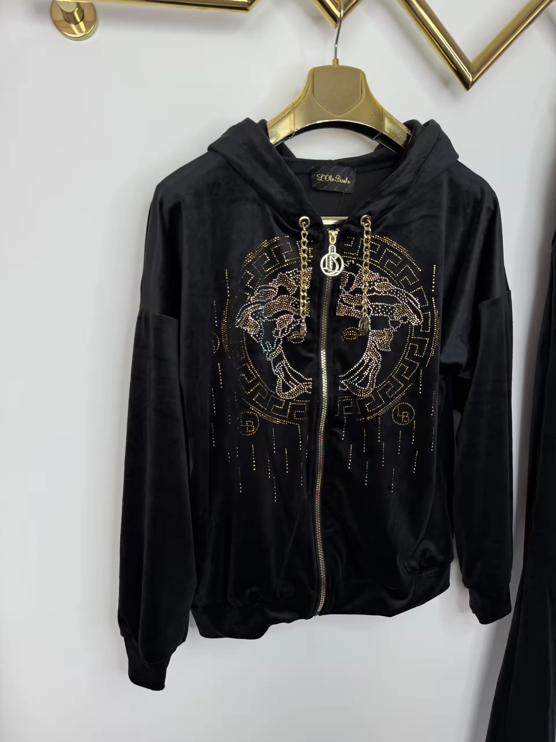 Odkryj niezwykle kobiecy i stylowy komplet welurowy Lola Bianka w klasycznym czarnym kolorze. Wykonany z miękkiego, przyjemnego w dotyku weluru, zapewnia maksymalny komfort noszenia. Idealny zarówno na co dzień, jak i na wyjątkowe okazje.