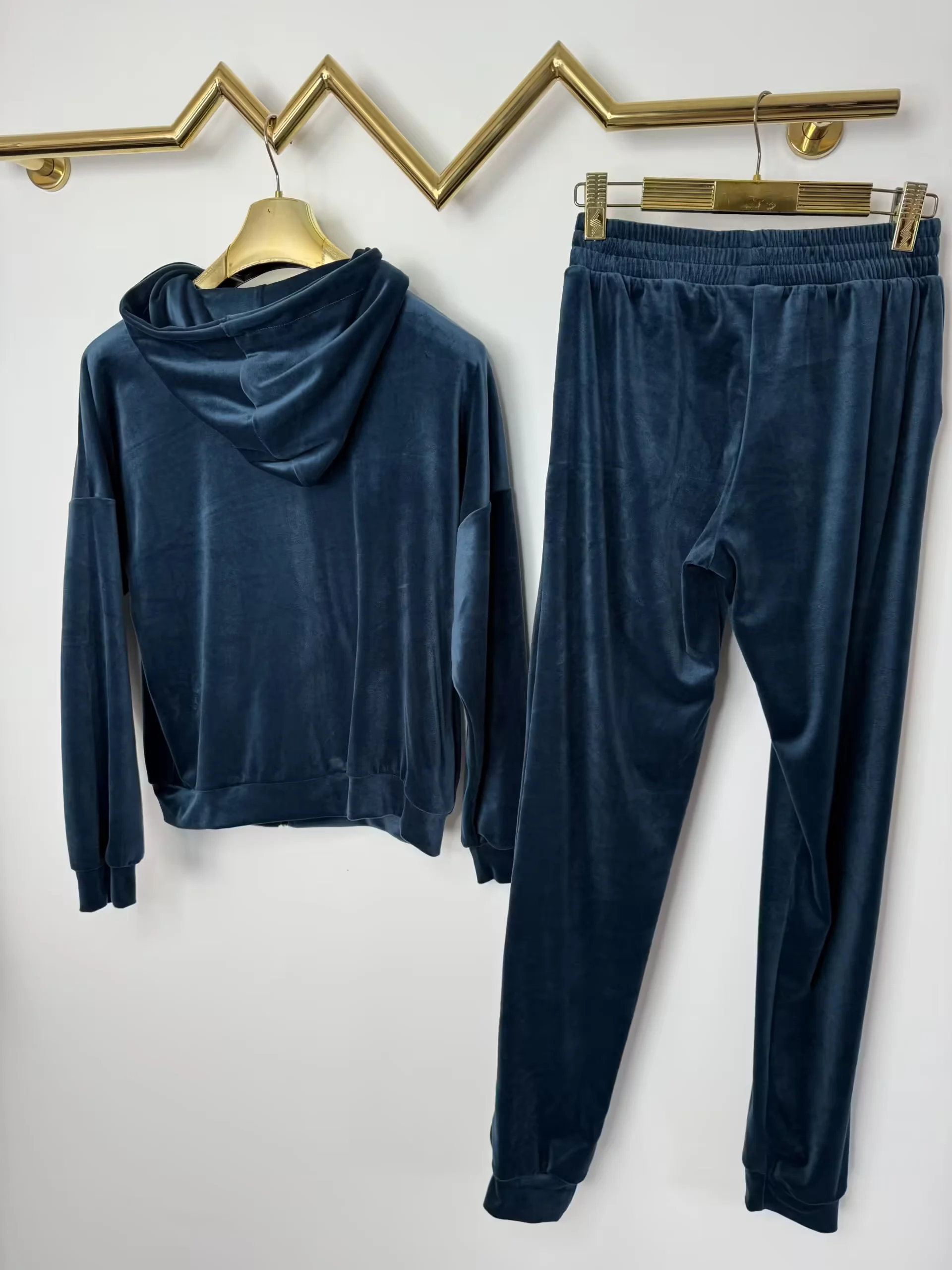 Komplet składa się z bluzy z kapturem zapinanej na zamek oraz spodni na elastycznej gumce, uzupełnionych o praktyczne kieszenie po bokach.