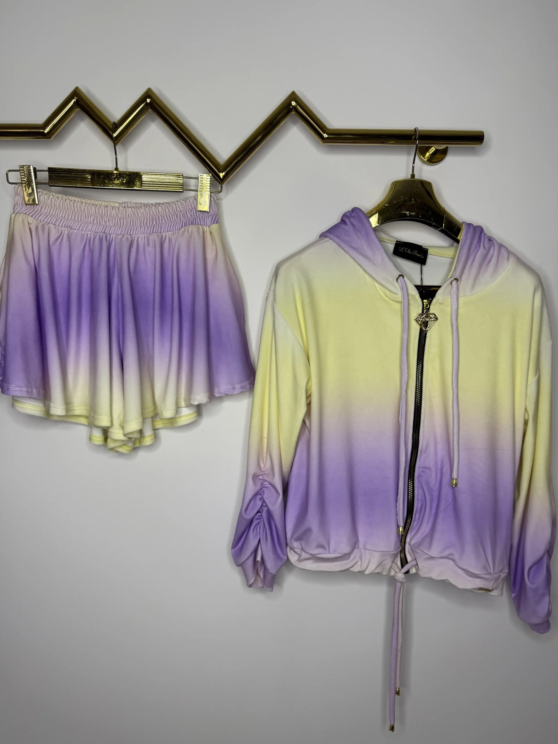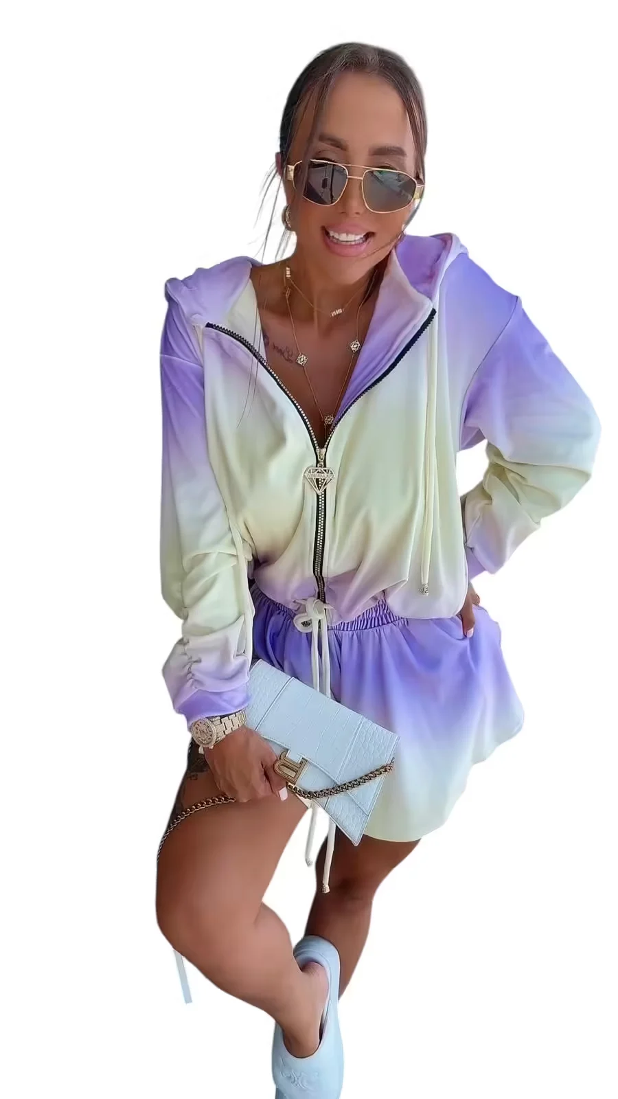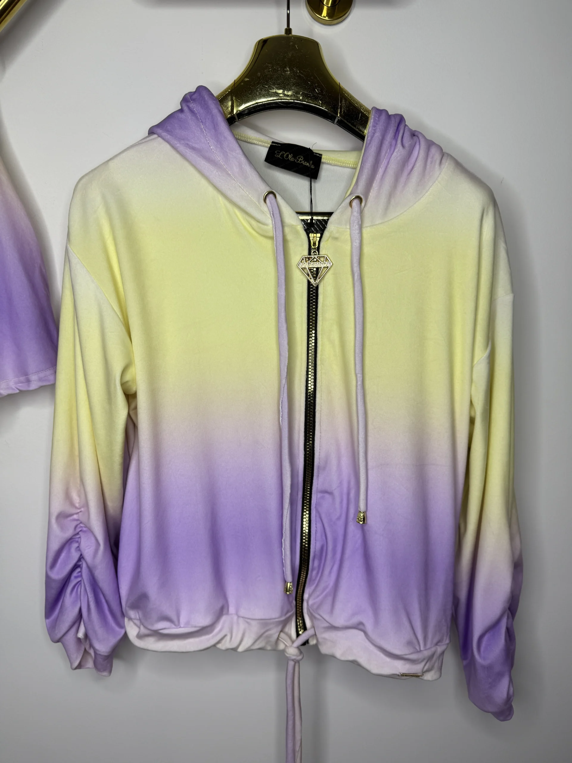 Dres welurowy Lola Bianka ombre w rozmiarze uniwersalnym pasujący na M i L. Piękny kolor żółto fioletowy przechodzący z bluzy na spodenki.