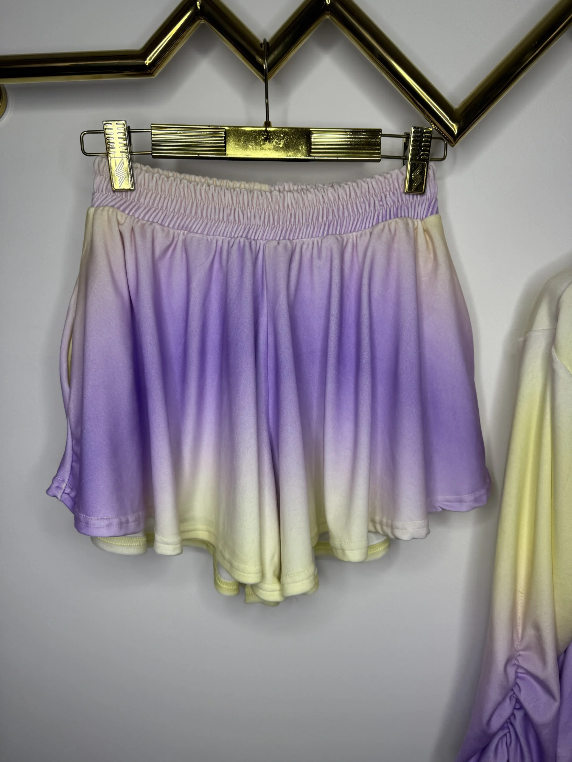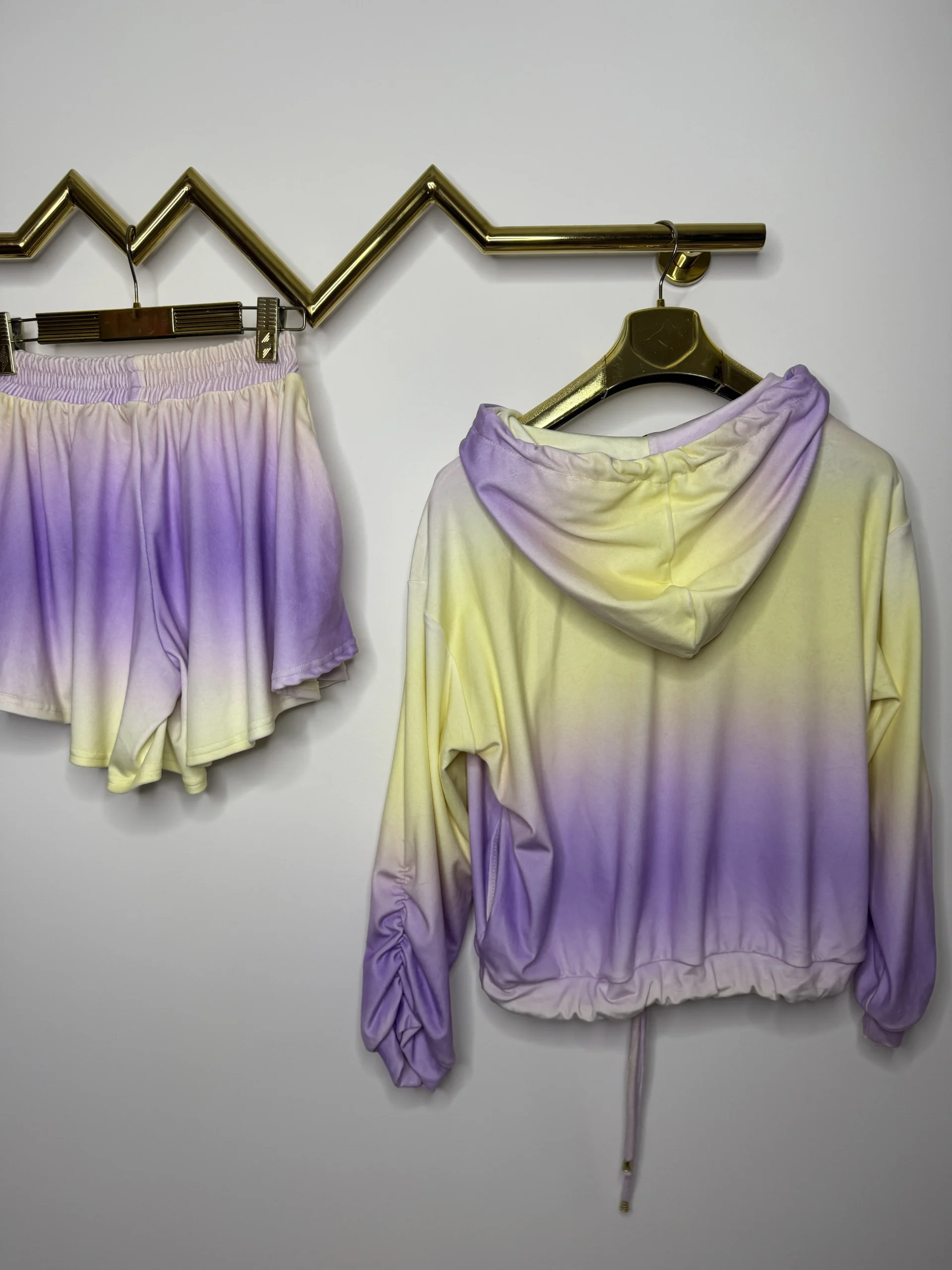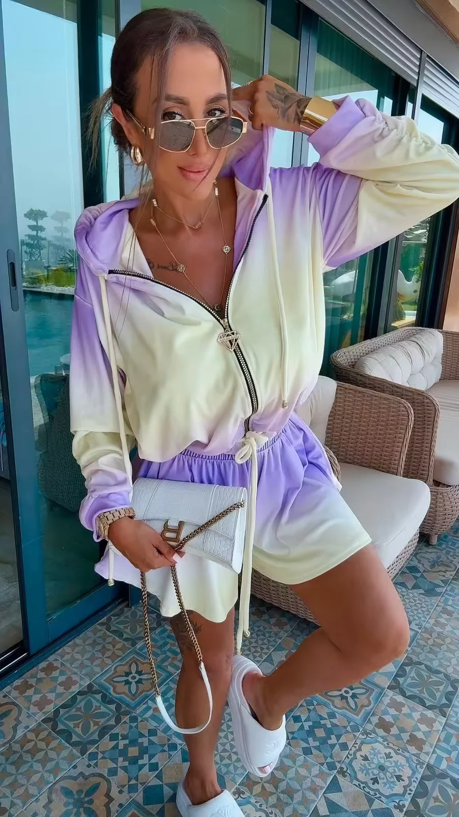 Dres welurowy Lola Bianka ombre w rozmiarze uniwersalnym pasujący na M i L. Piękny kolor żółto fioletowy przechodzący z bluzy na spodenki.