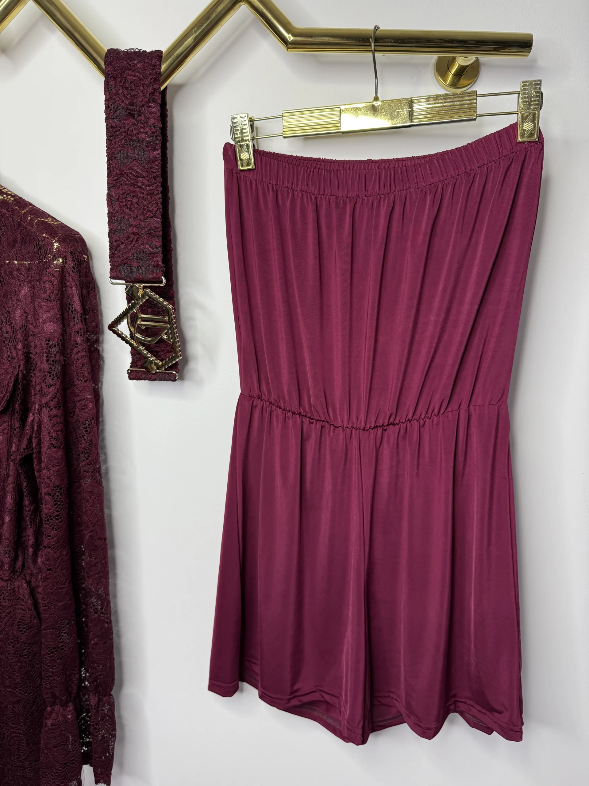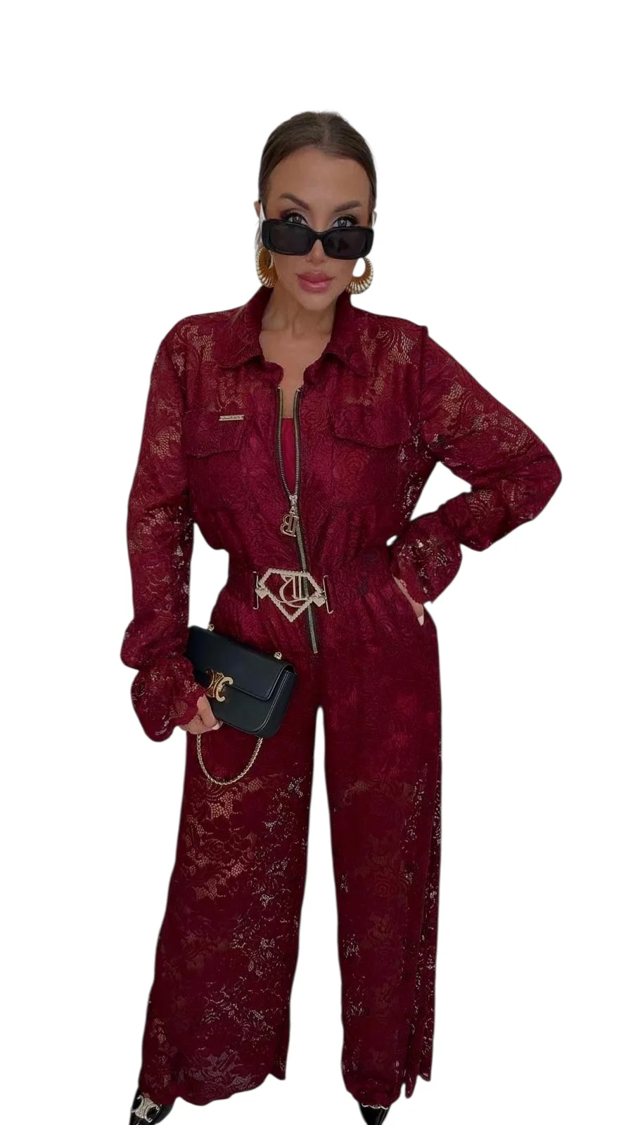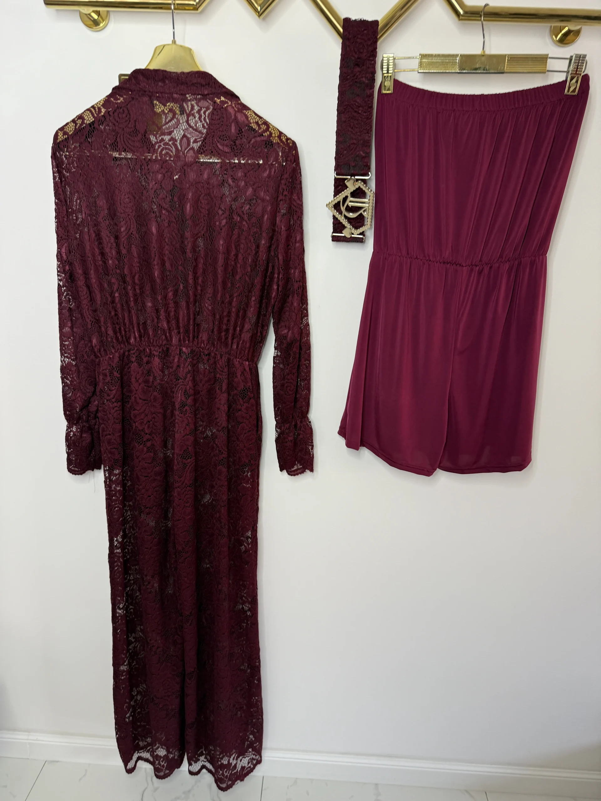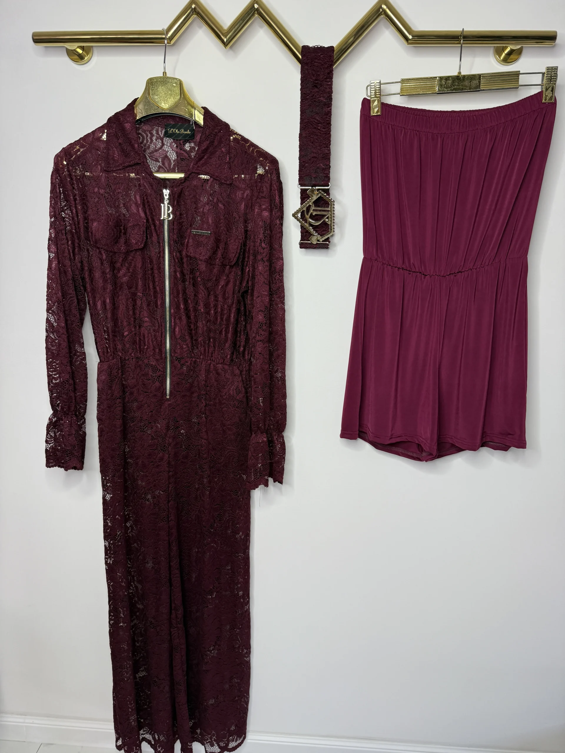 Kombinezon bordowy Lola Bianka koronkowy w zestawie z paskiem z klamrą.