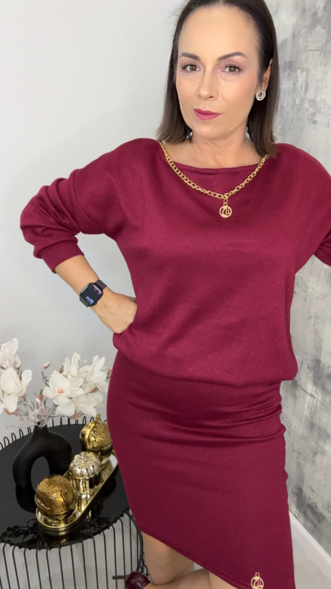 Bluza wkładana przez głowę, dekolt łódka zdobiony łańcuszkiem-więc nie potrzebujesz biżuterii-jeśli nie chcesz możesz odczepić
