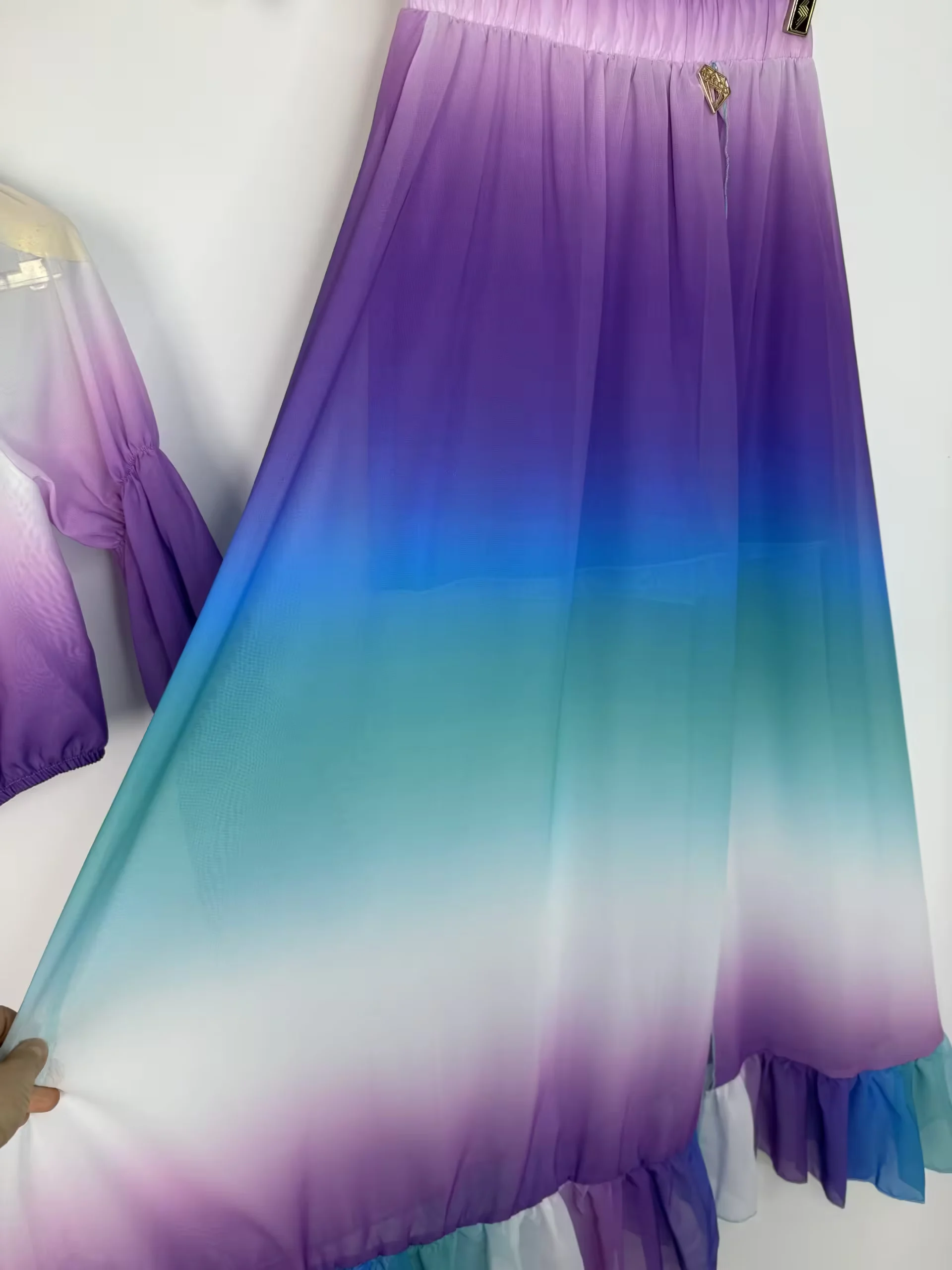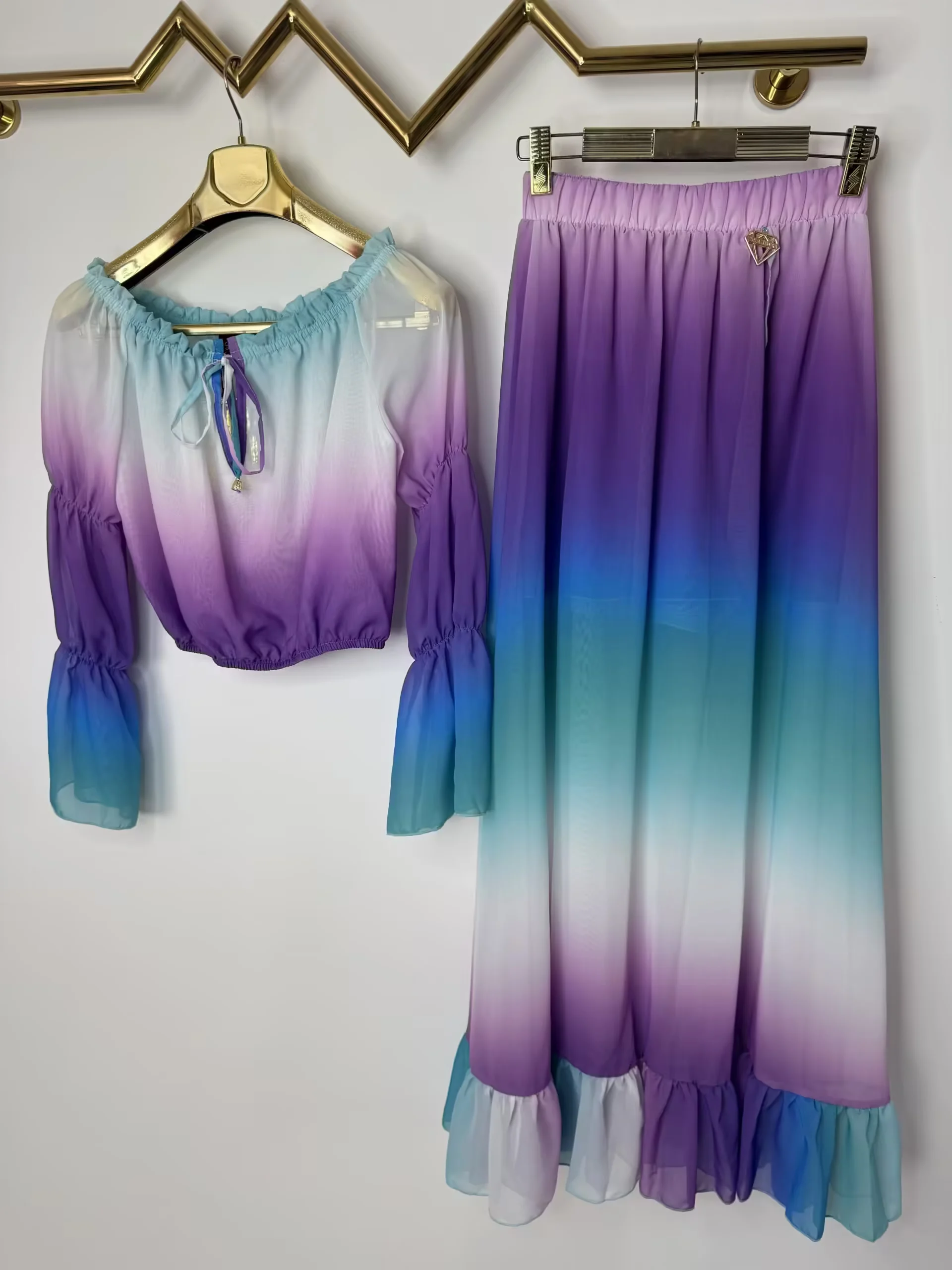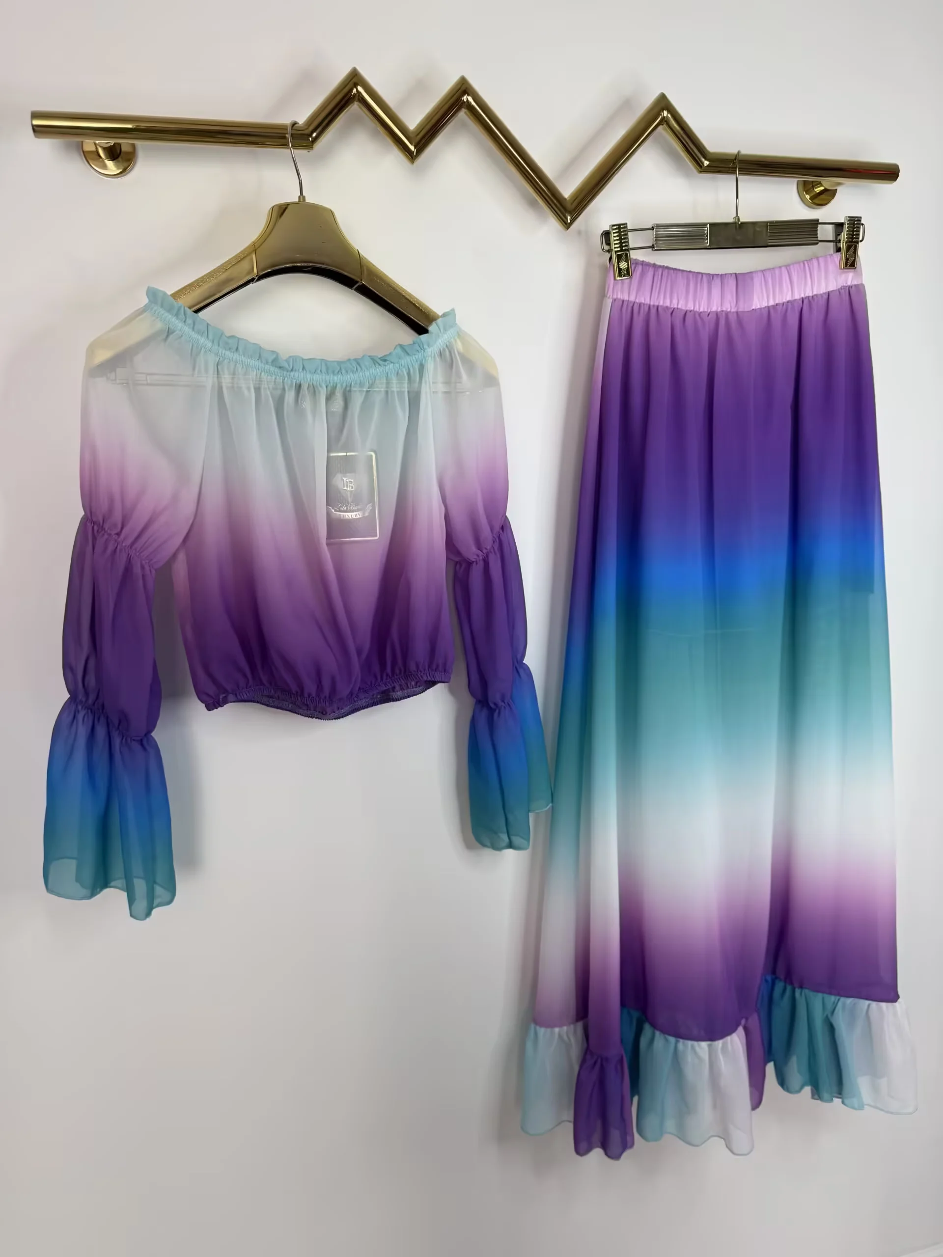 Komplet letni Lola Bianka top spódnica w cudownym princie ombre, delikatny w dotyku szyfonowy materiał jakość na najwyższym poziomie