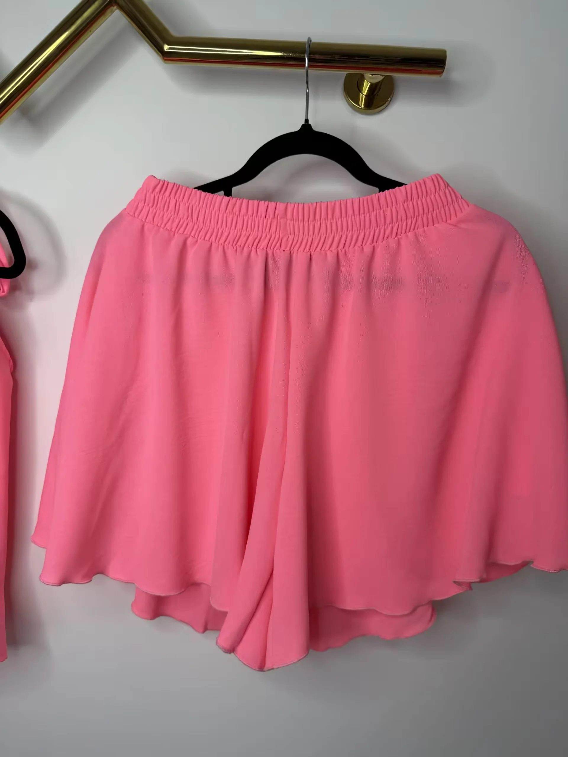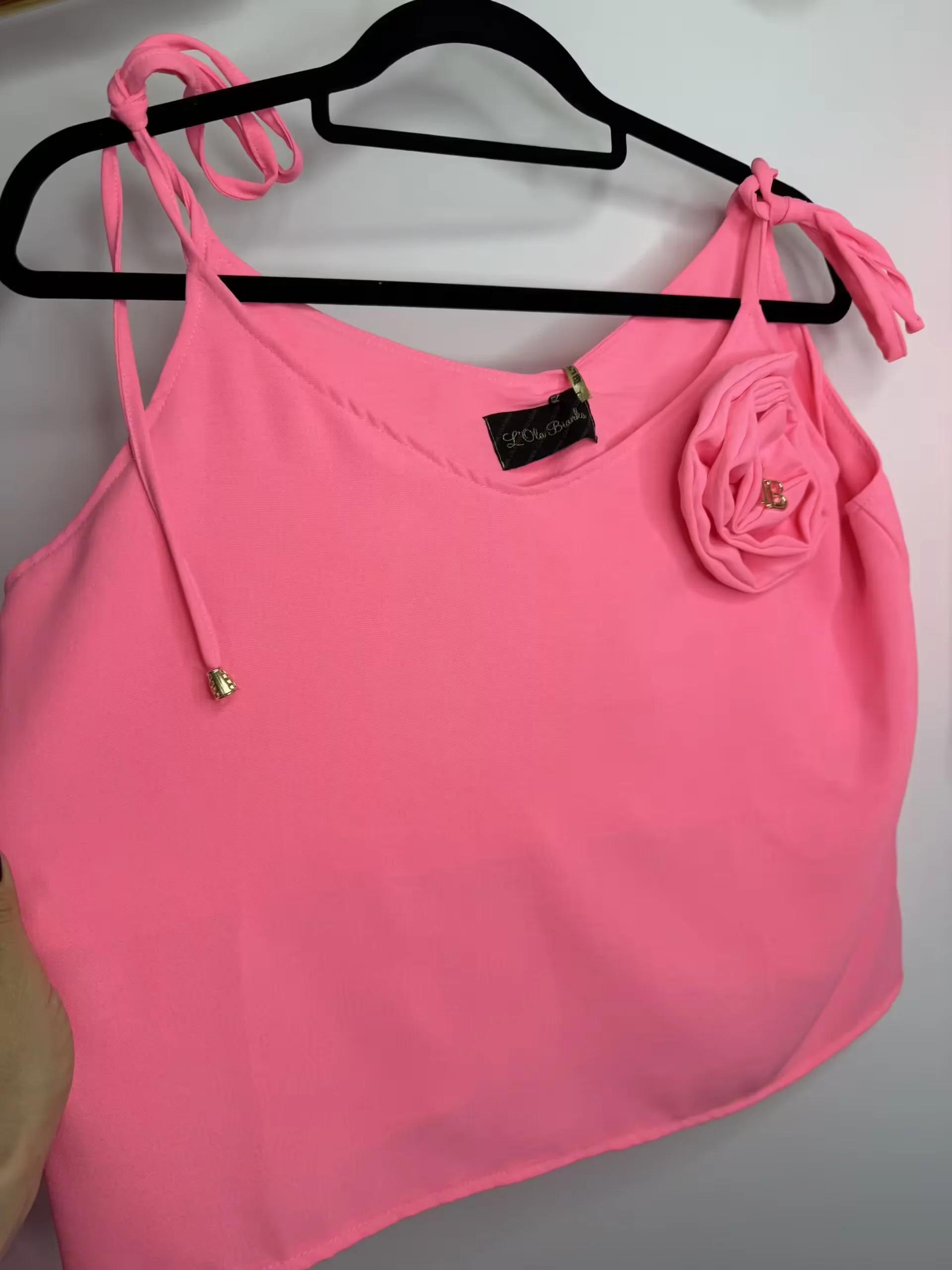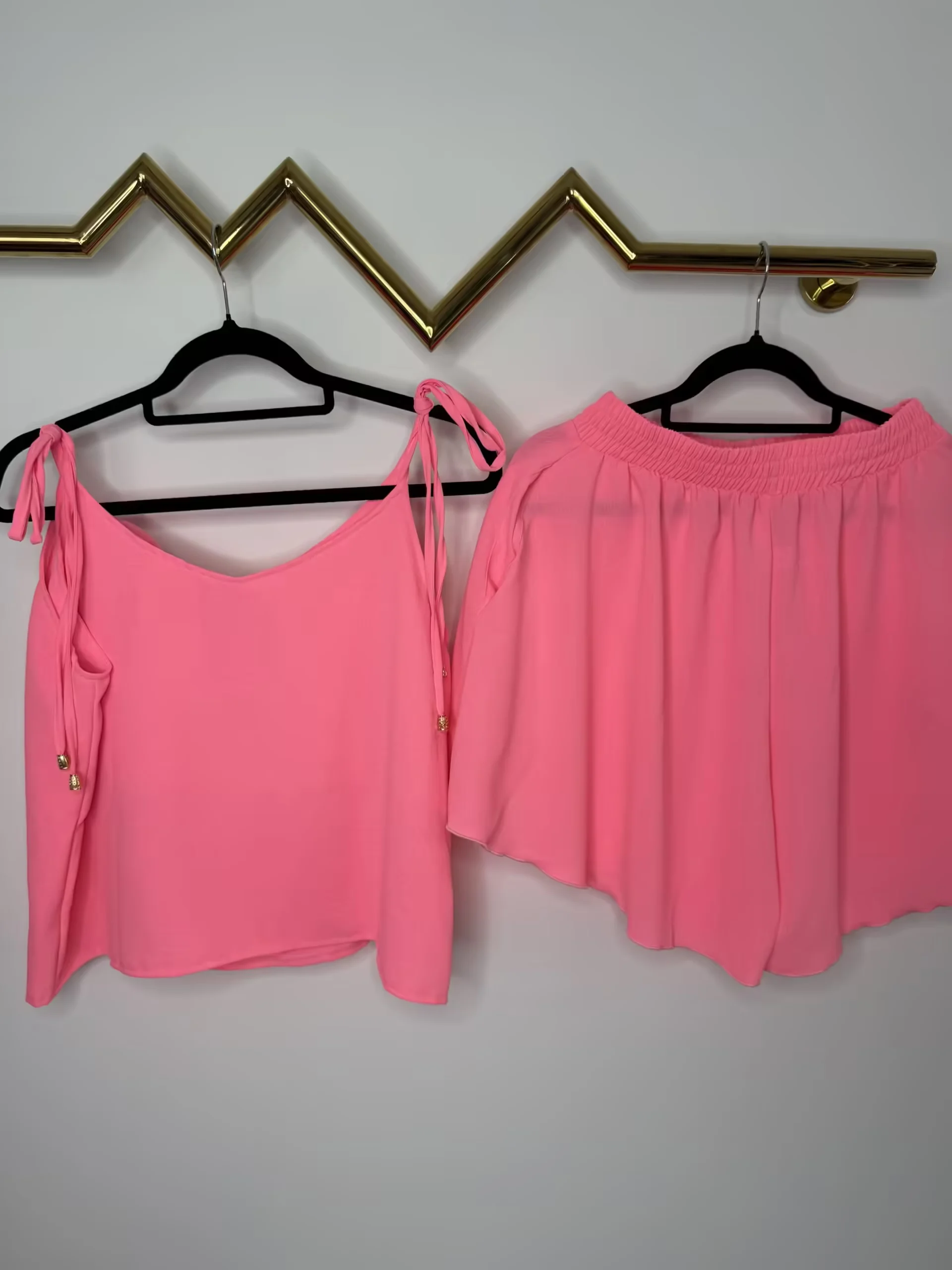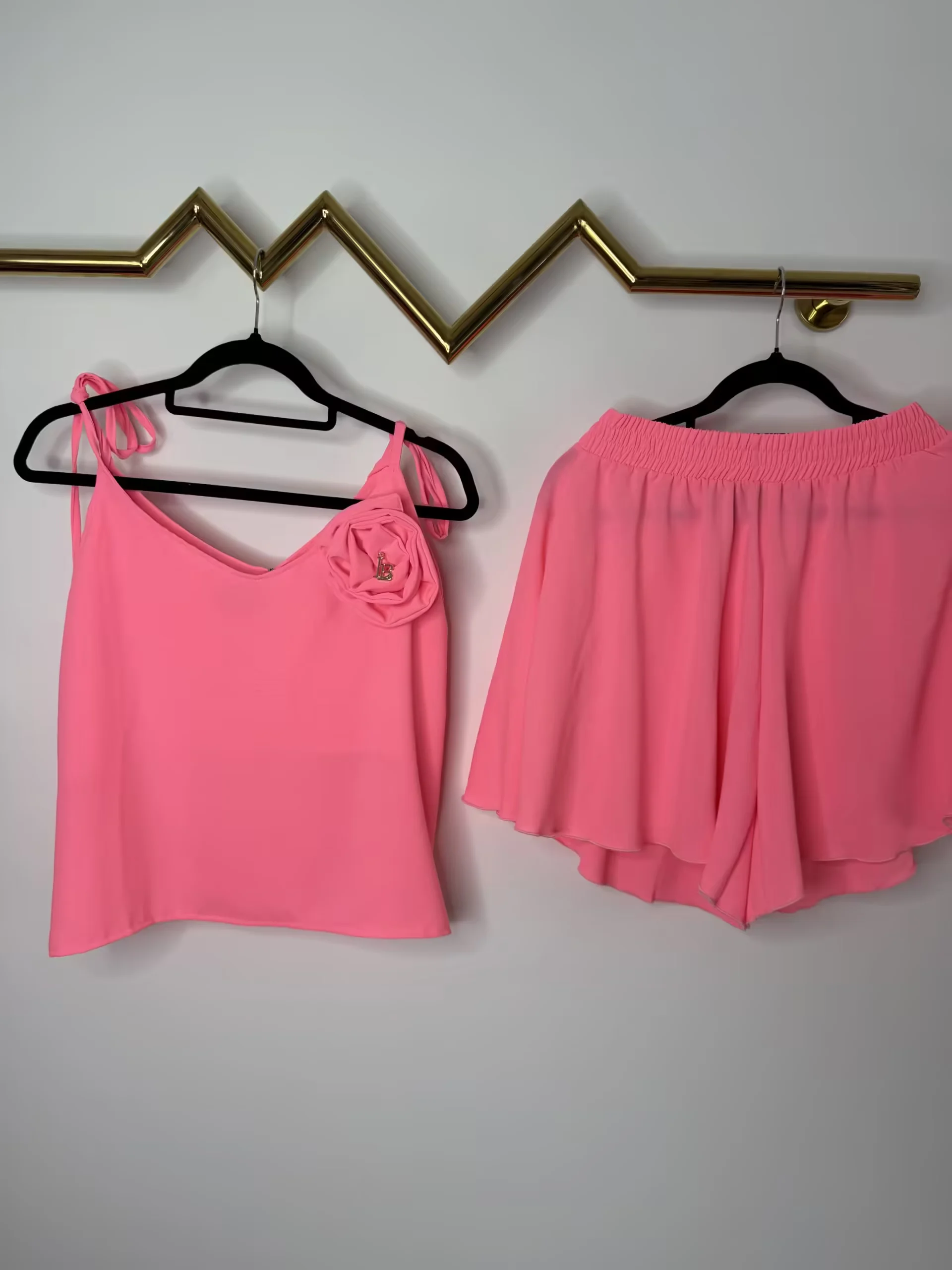 przepiękny koralowy i bardzo wygodny leciutki komplet na gorące dni tego lata, bluzka wiązana na ramionach z piękną różą i do tego spodenki na gumce po bokach z kieszeniami-zestaw idealny