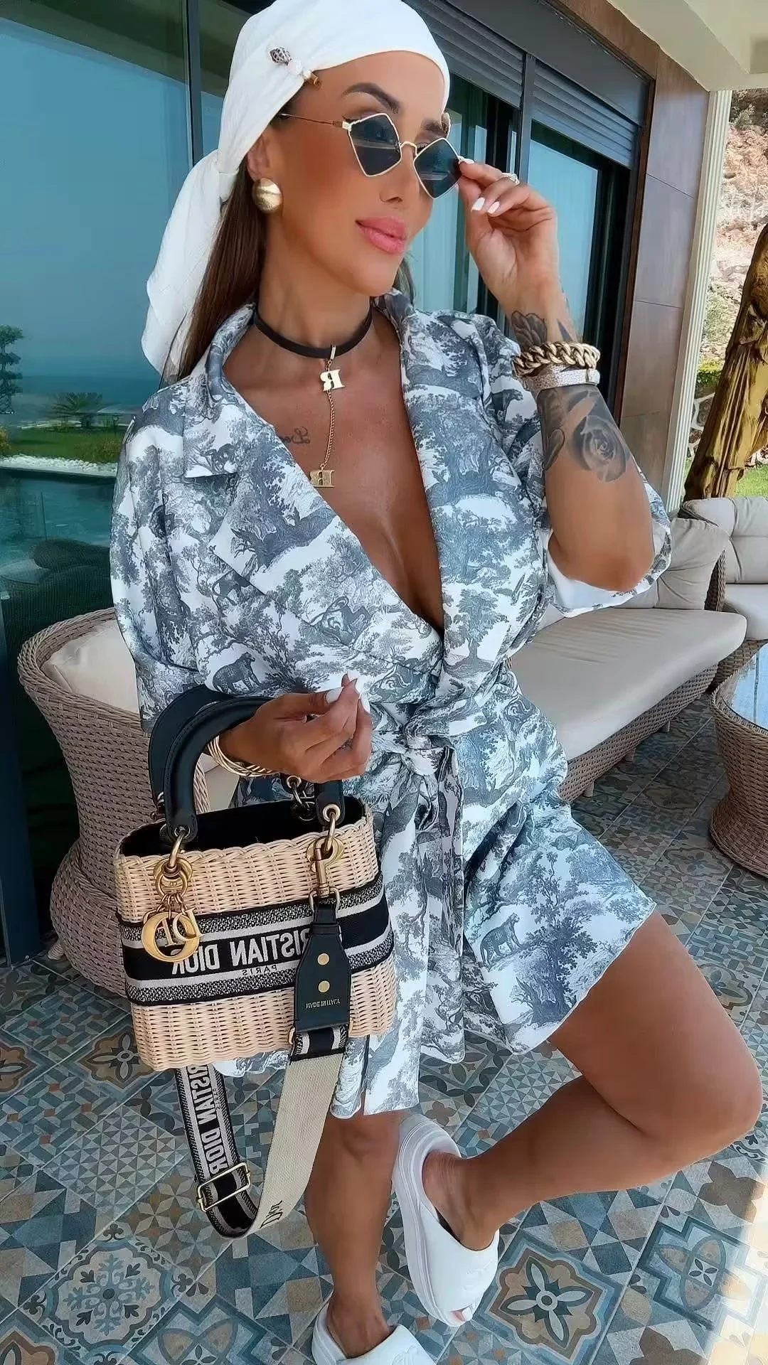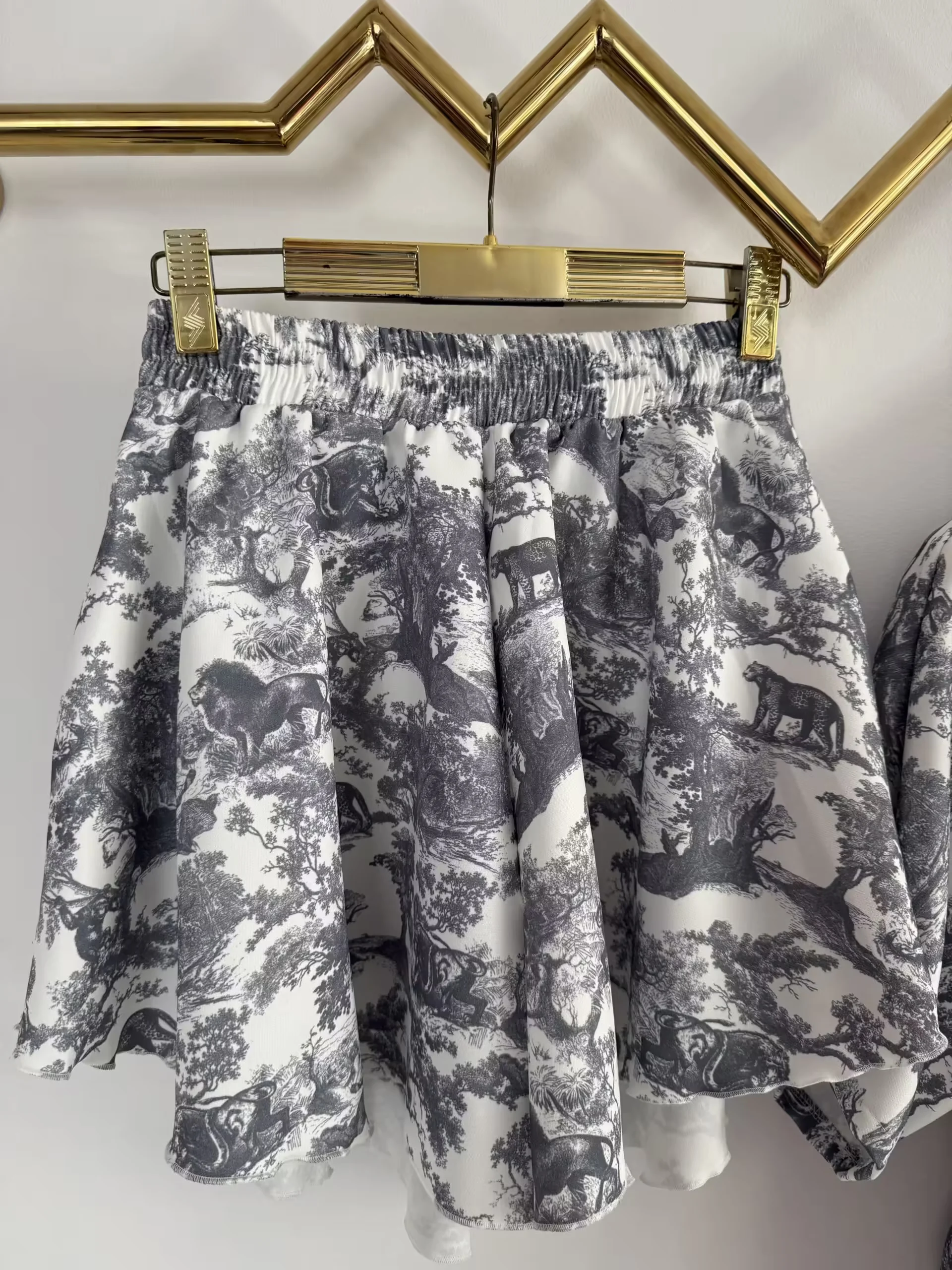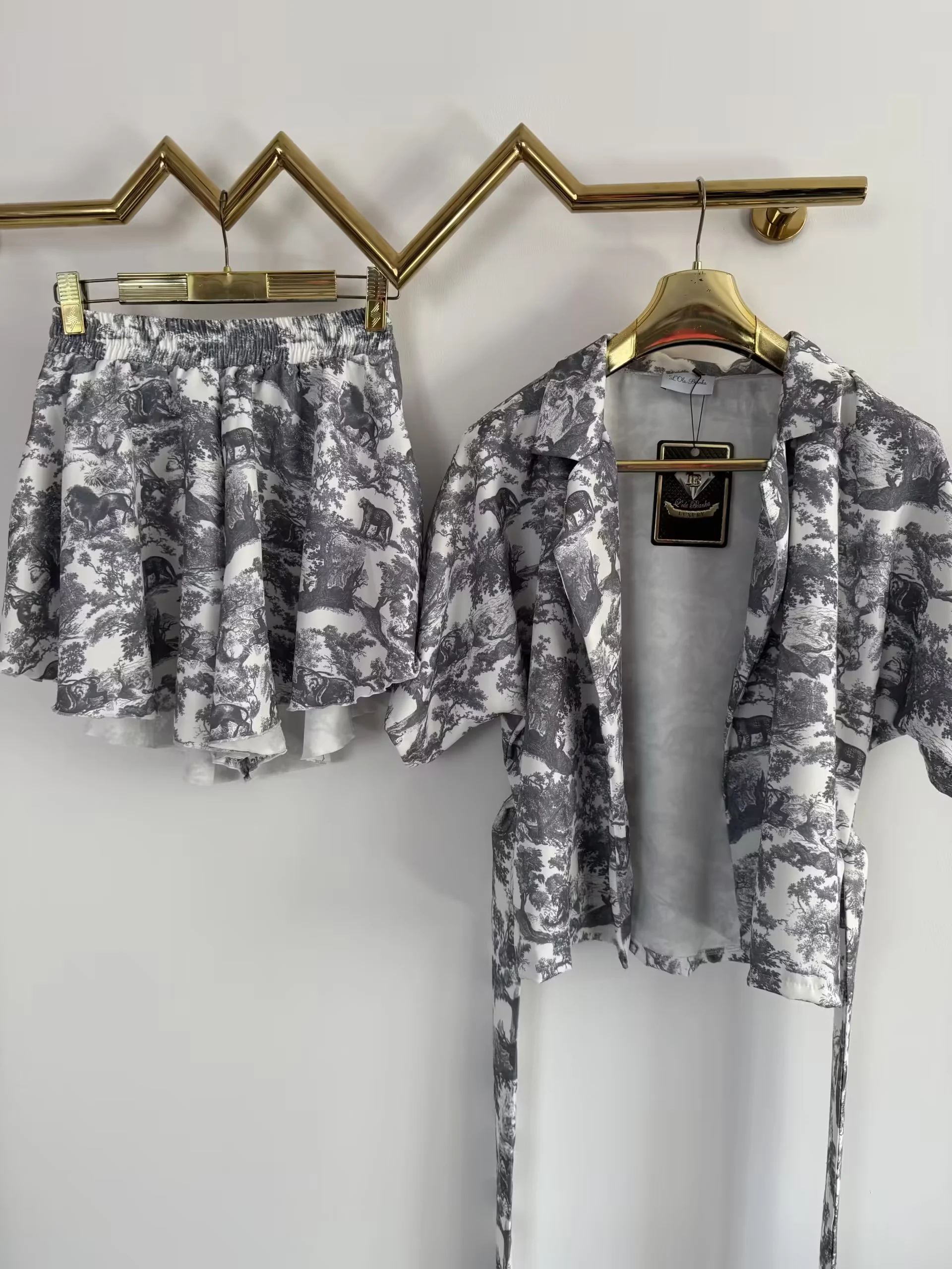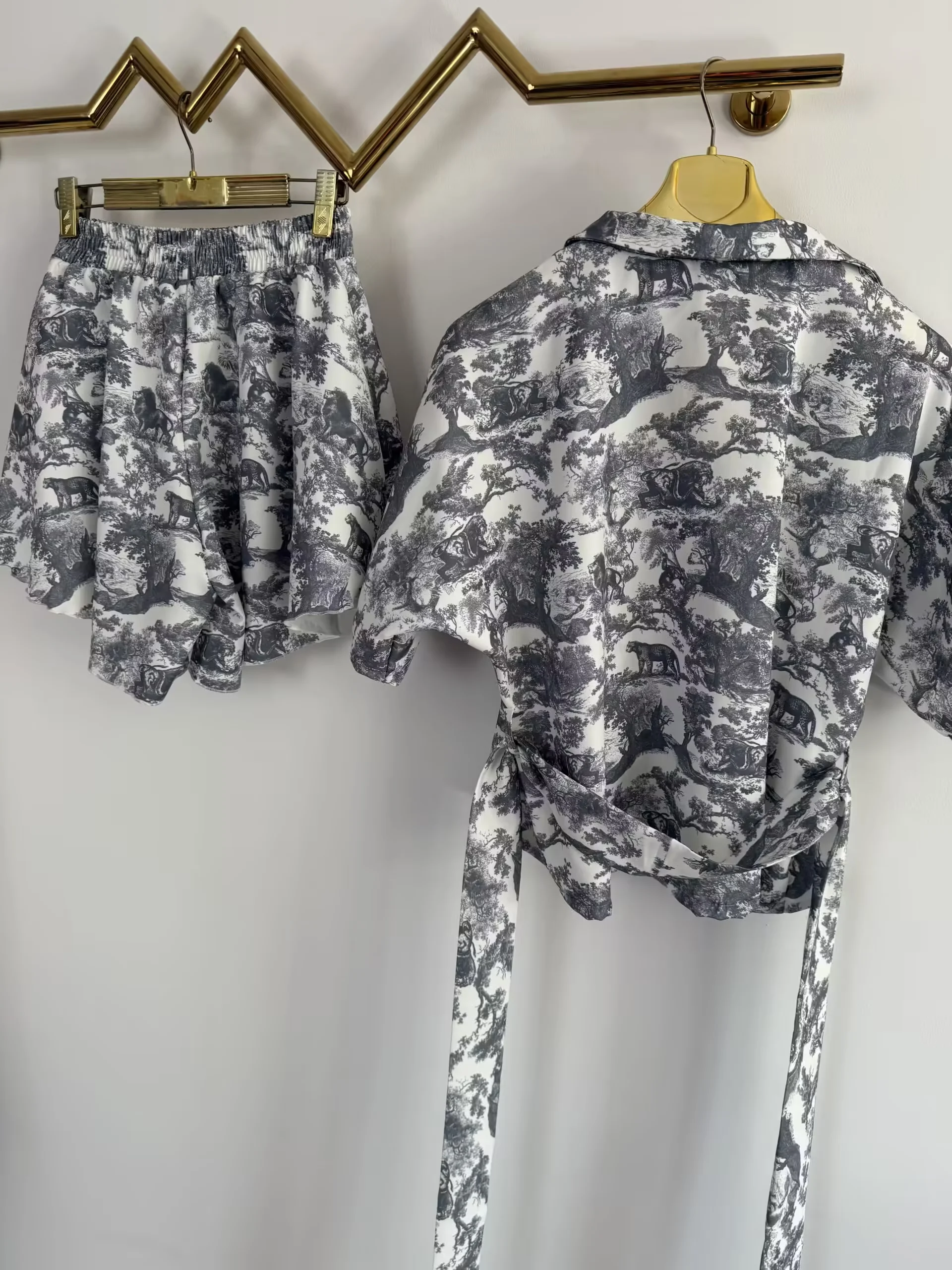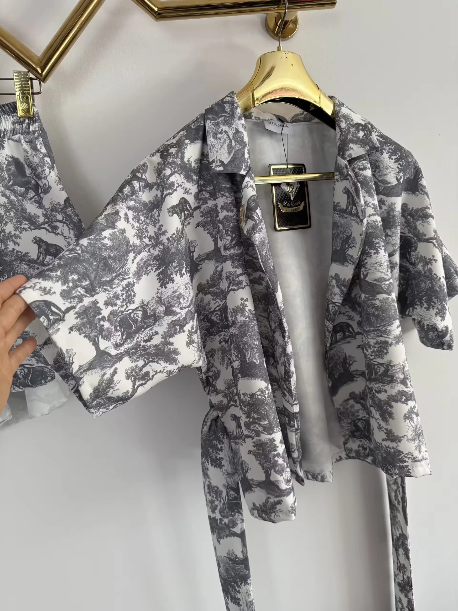 Przepiękny zestaw 3 częściowy : bluzka z krótkim rękawem-krój marynarki krótkiej, spodenki i pasek, zestaw z bardzo gładkiego i przyjemnego do ciała materiału, cudny print, gatunek premium