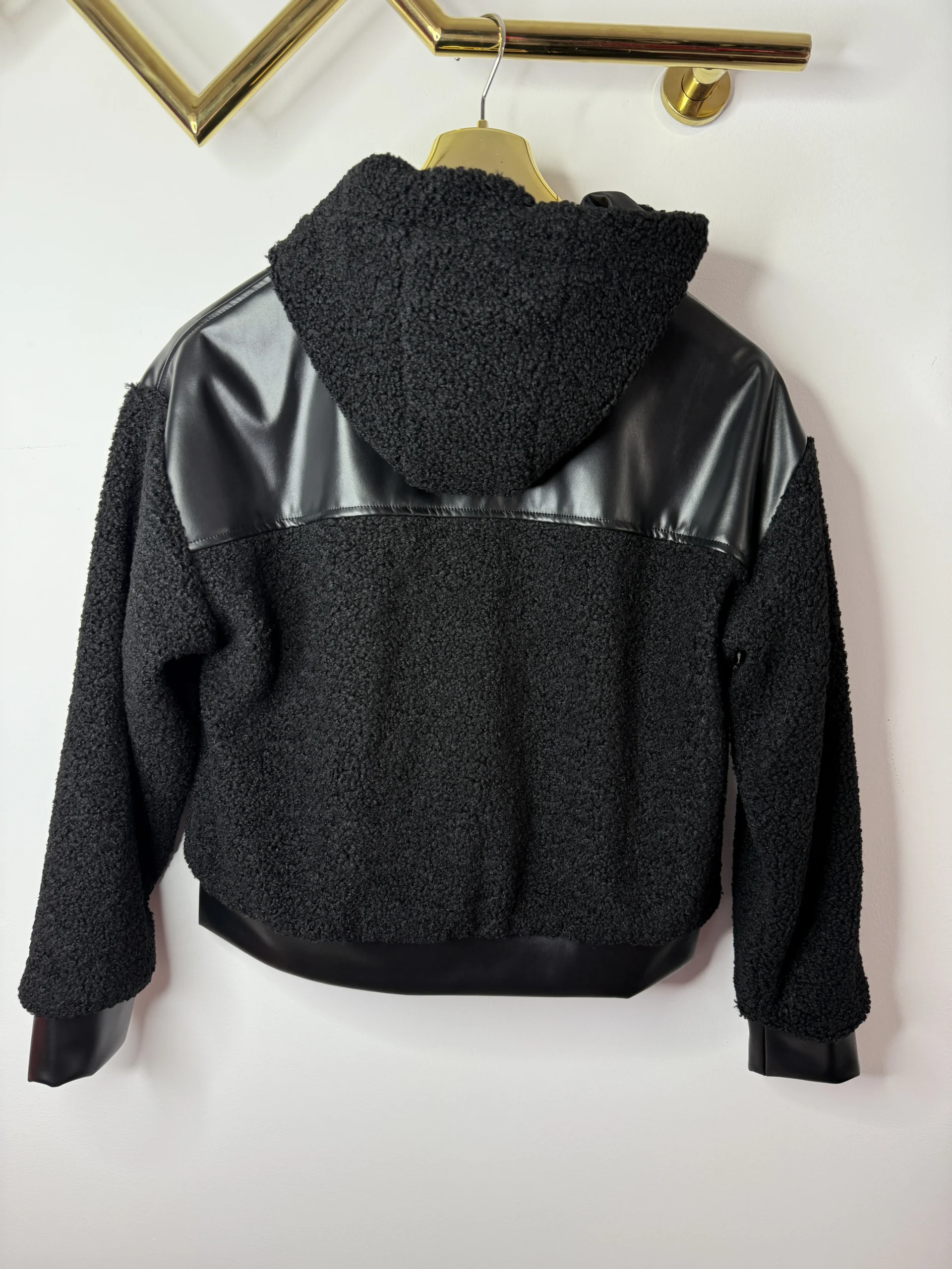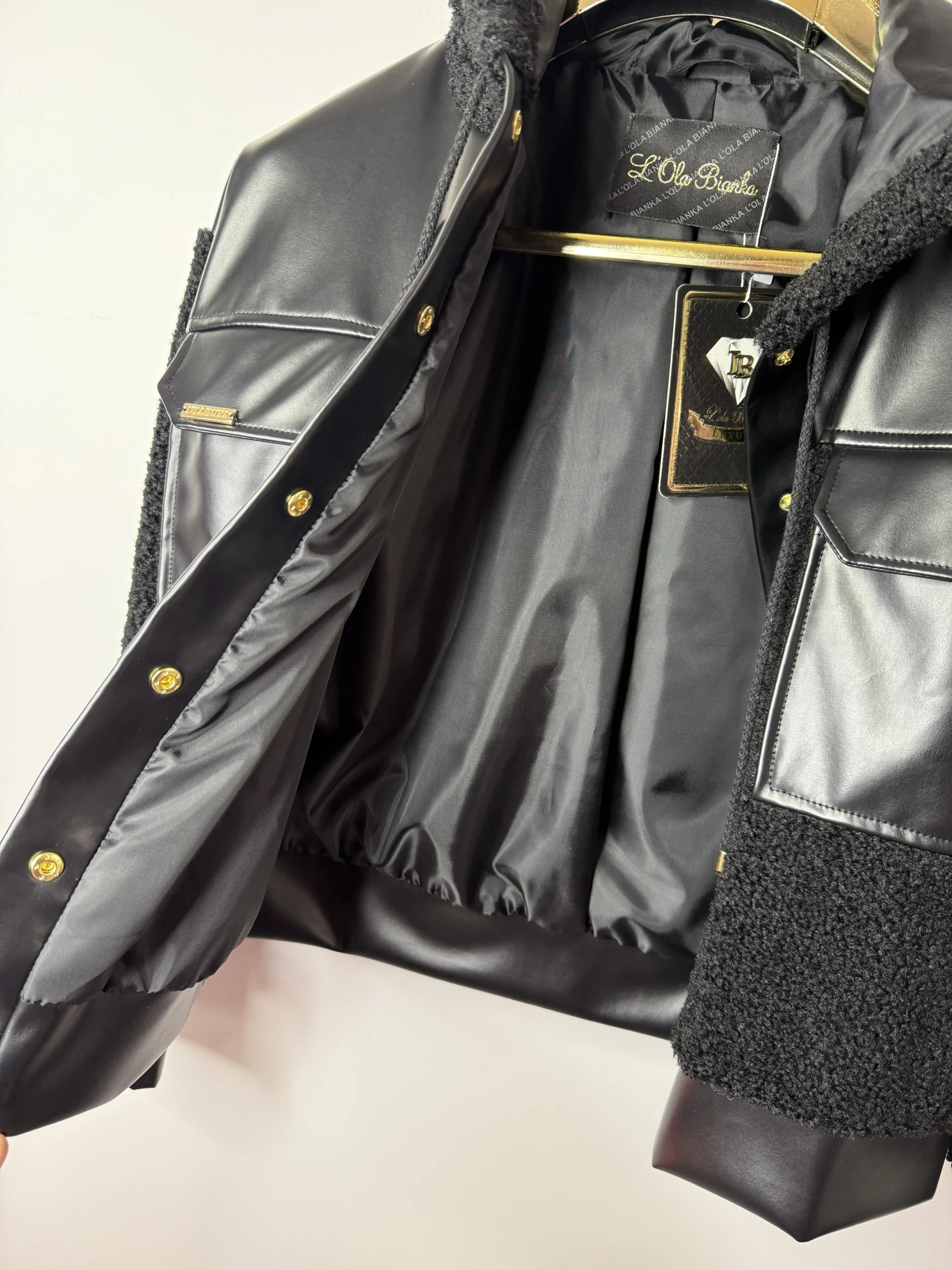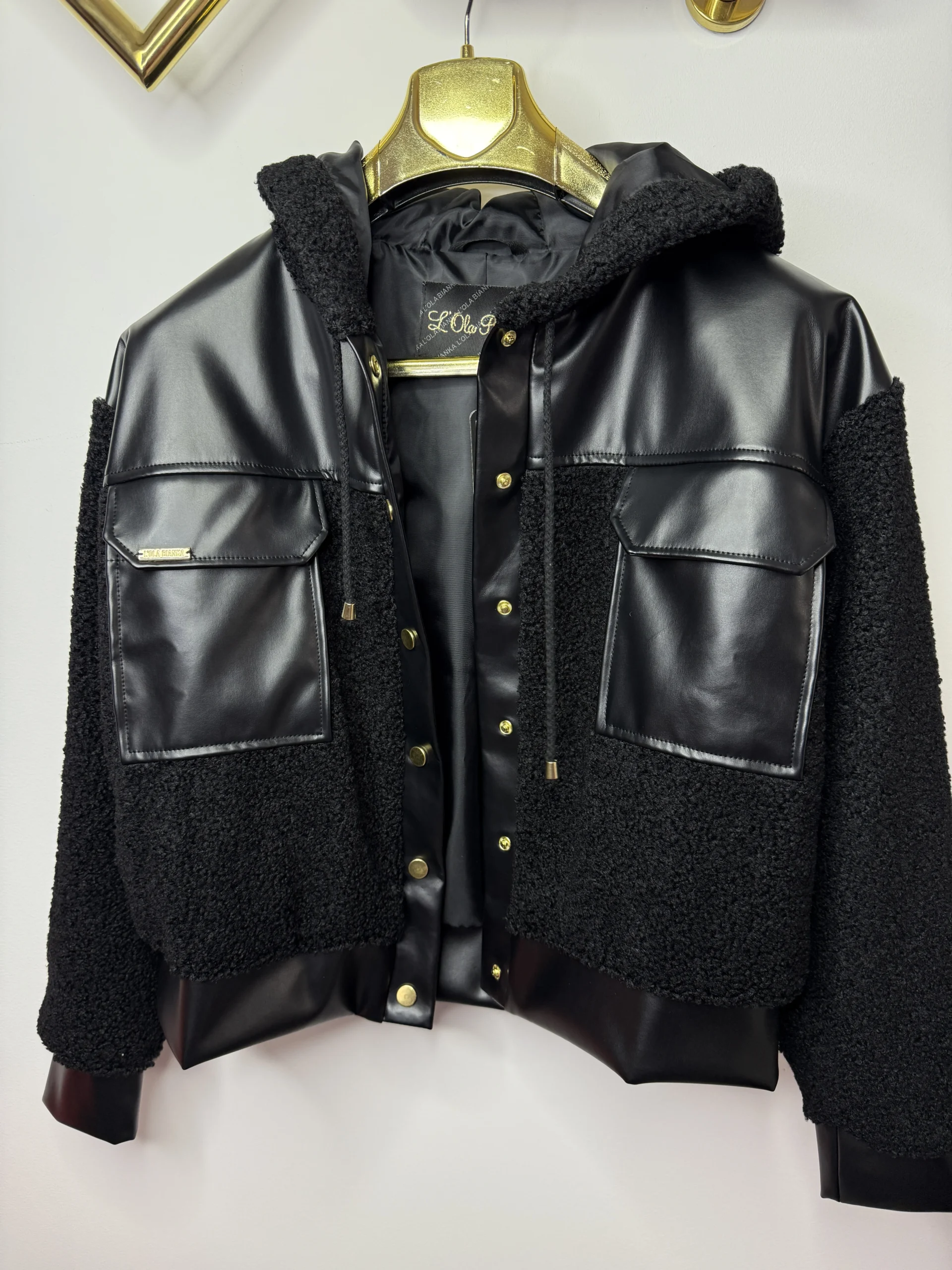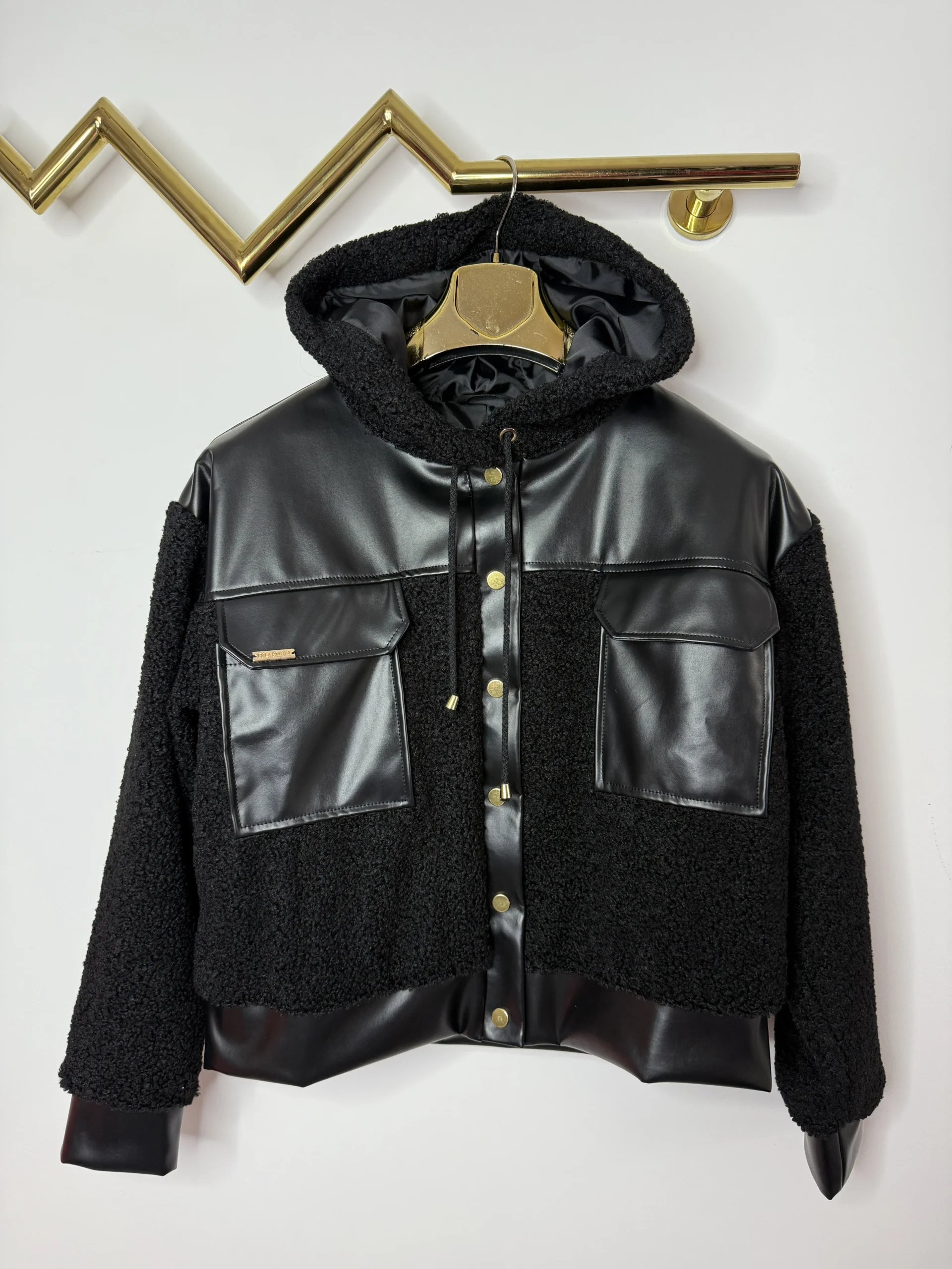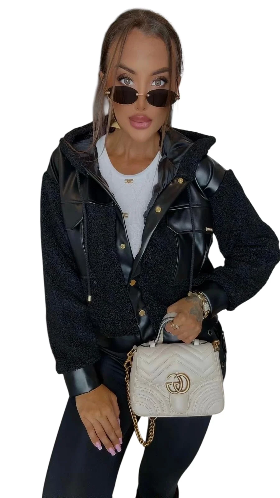 Kurtka Lola Bianka bomberka czarna w rozmiarze uniwersalnym pasującym na SML, z kapturem to nowoczesna propozycja dla kobiet, które lubią łączyć miejski styl z nutą elegancji i komfortu. Ten model o długości do bioder zachwyca połączeniem miękkiego misia Teddy Bear z efektowną ekoskórą, tworząc unikalny design idealny na jesień.