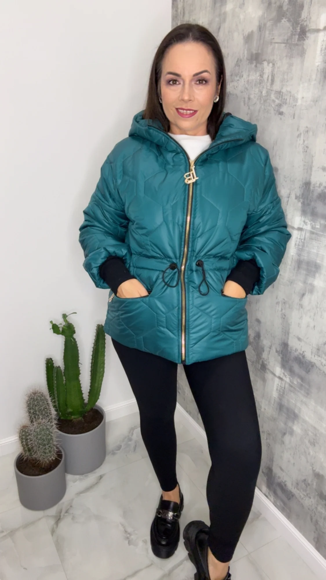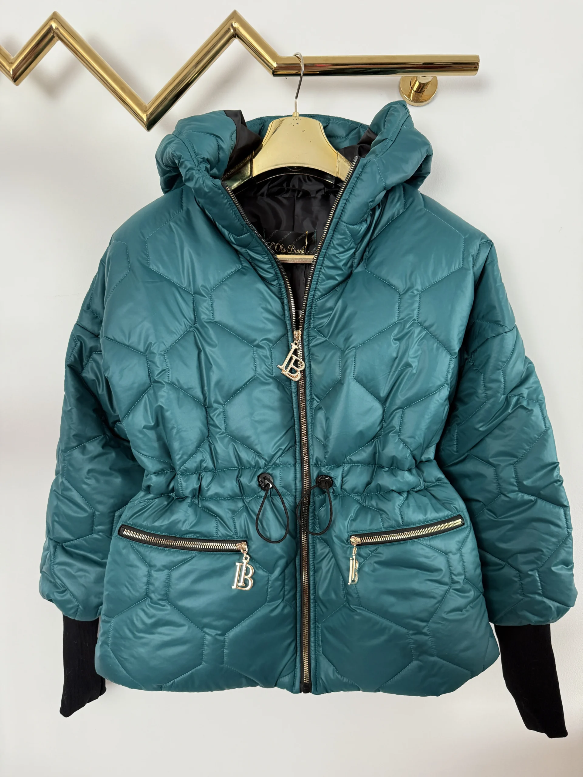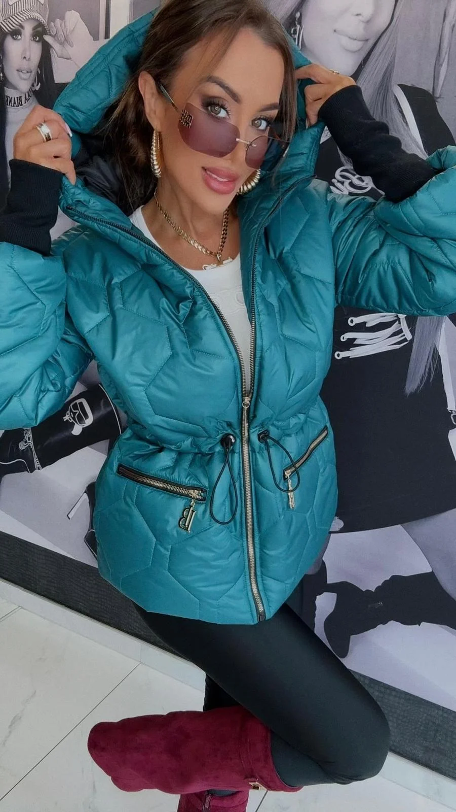 Kurtka Lola Bianka pikowana w kolorze morskim, z kapturem zapinana na zamek, rękawki zwężane bawełniane, rozmiar na metce UNI-odpowiedni na S,M,L, w pasie troczki do ściągnięcia i podkreślenia talii, piękne pikowanie, ocieplana