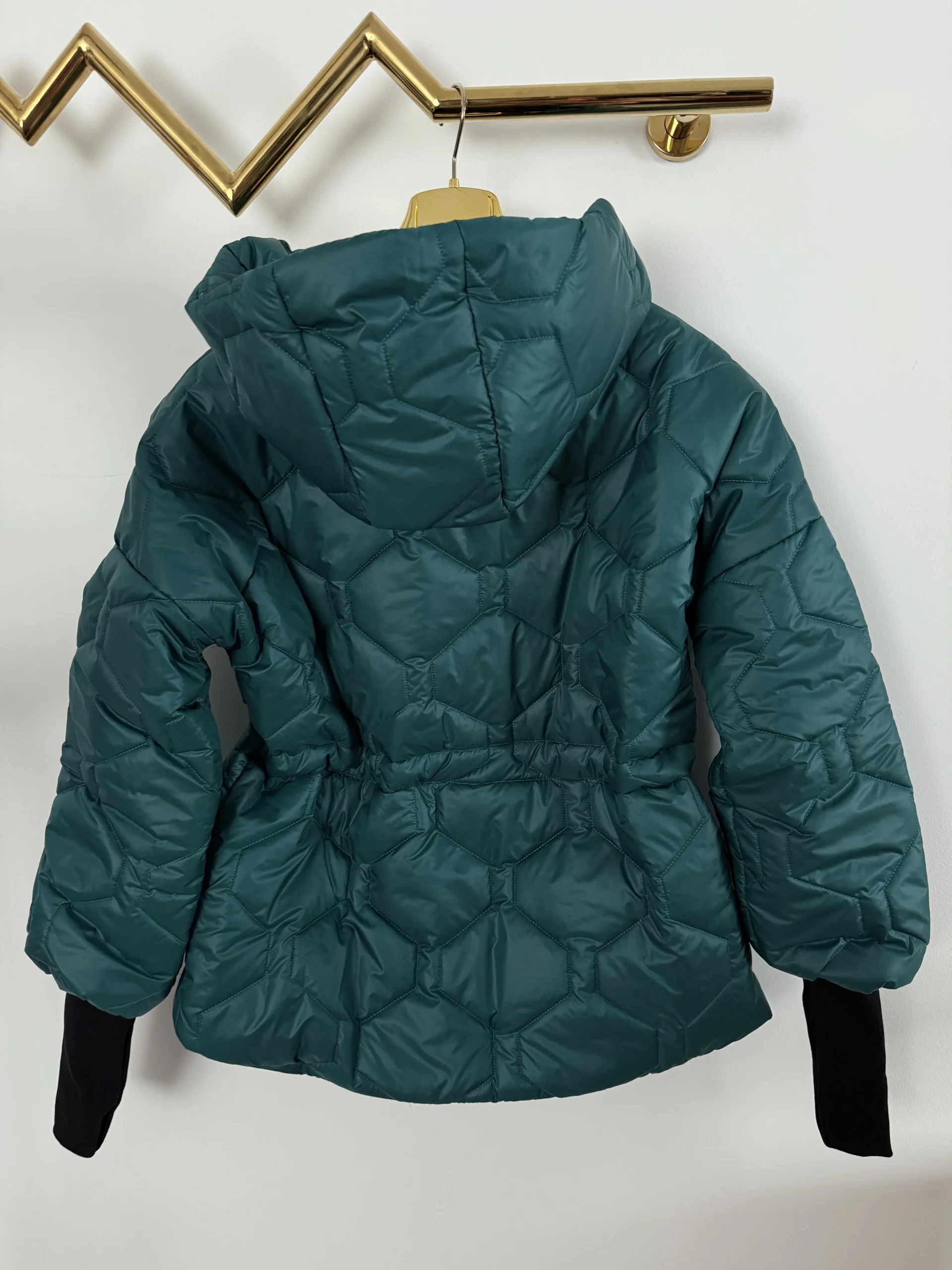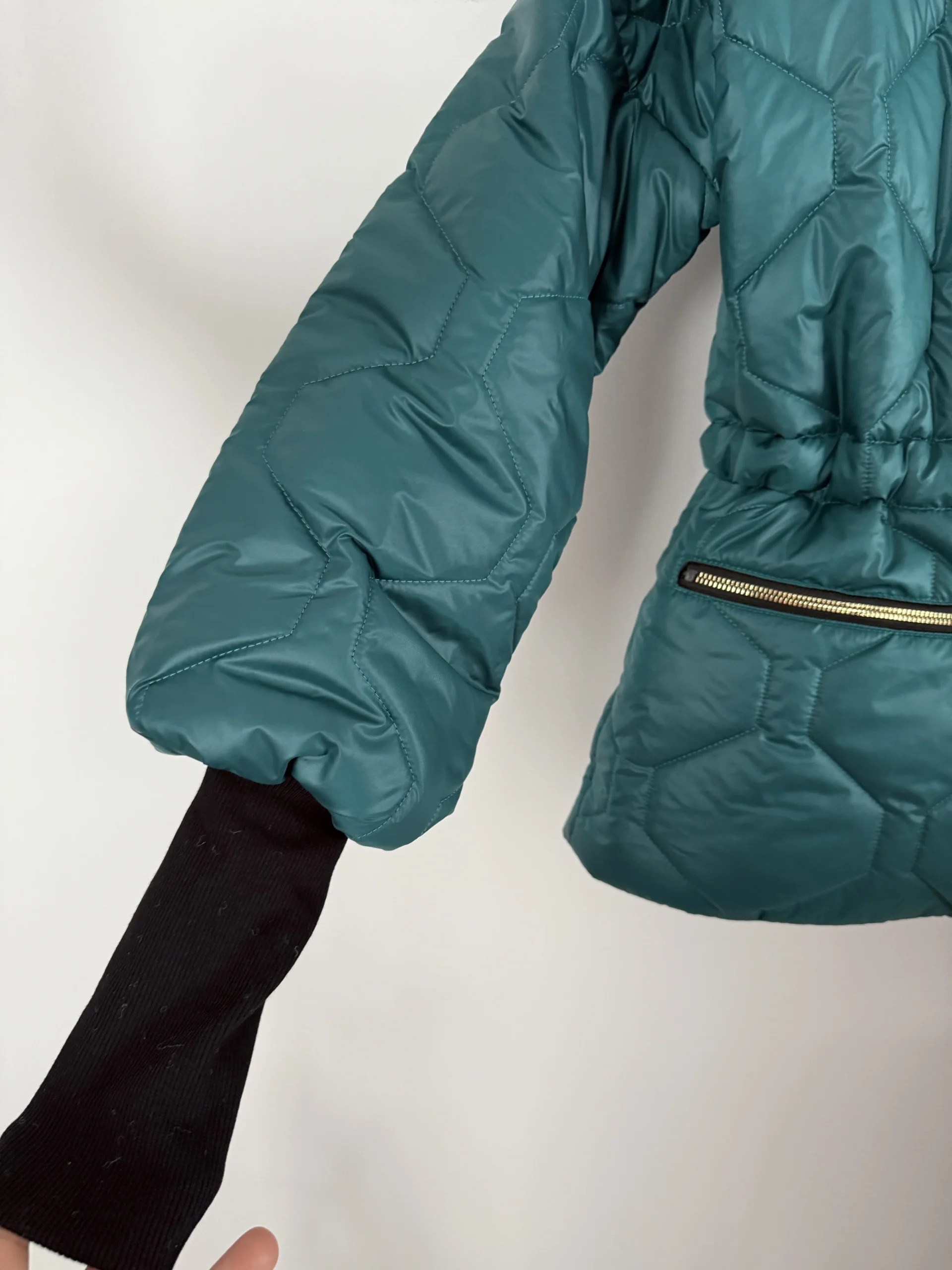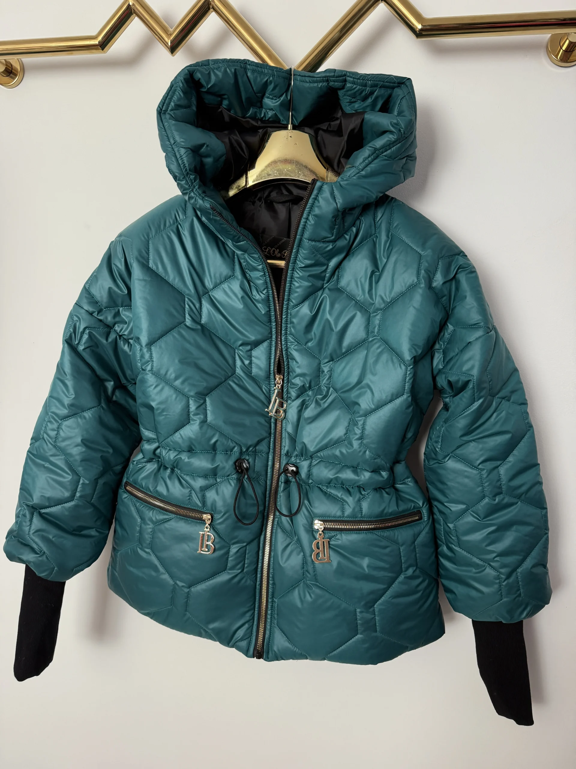 Kurtka Lola Bianka pikowana w kolorze morskim, z kapturem zapinana na zamek, rękawki zwężane bawełniane, rozmiar na metce UNI-odpowiedni na S,M,L, w pasie troczki do ściągnięcia i podkreślenia talii, piękne pikowanie, ocieplana
