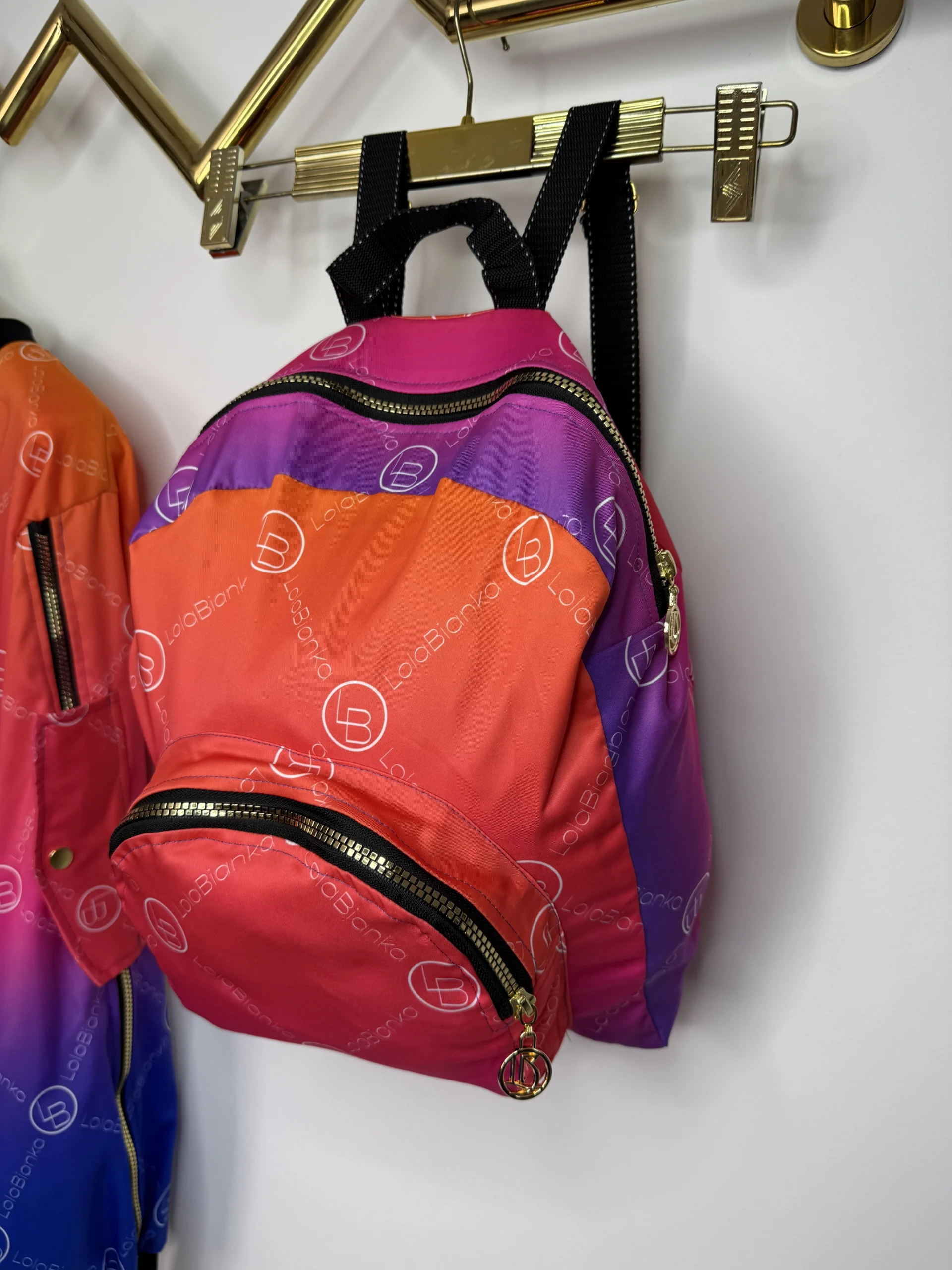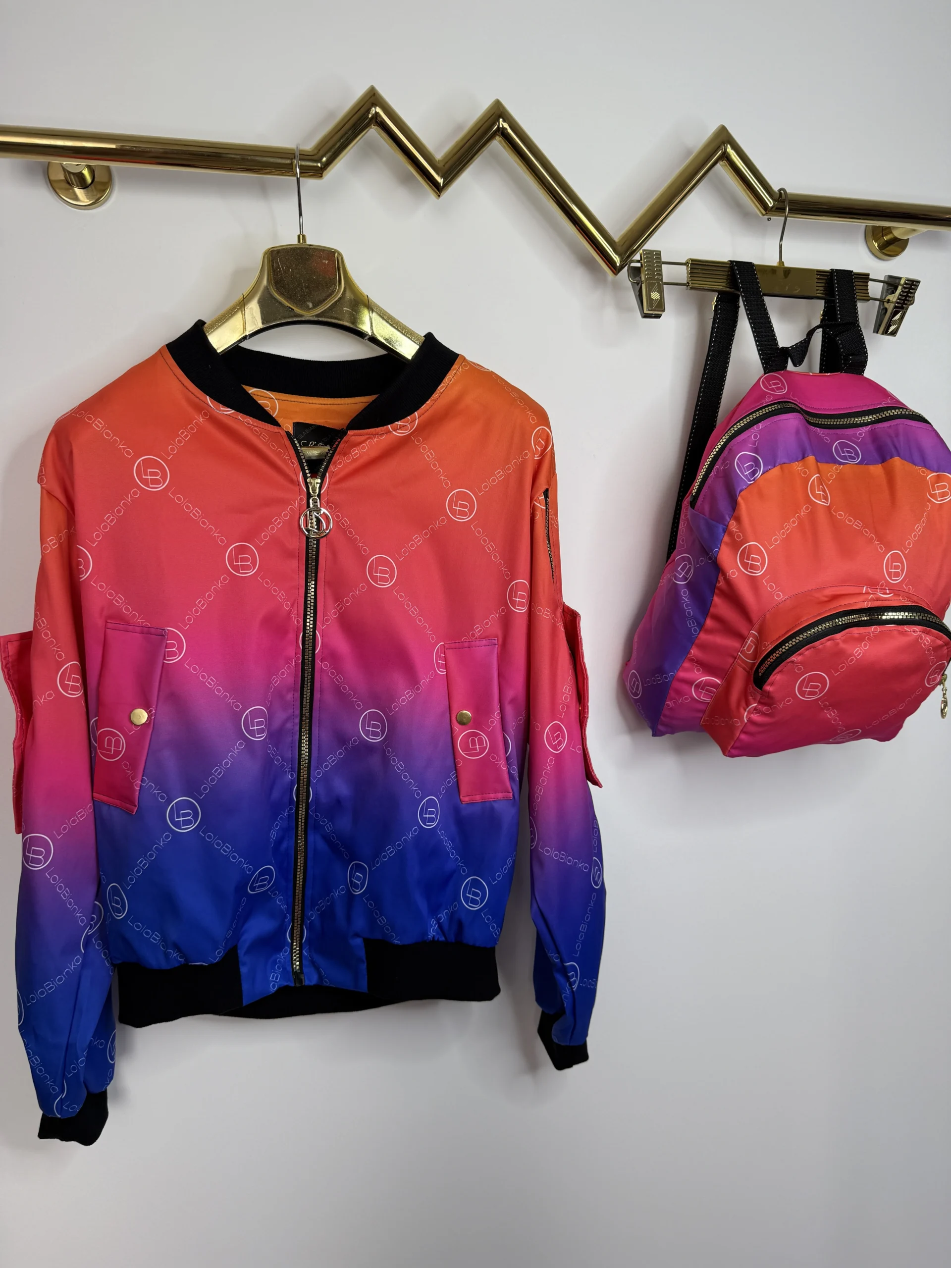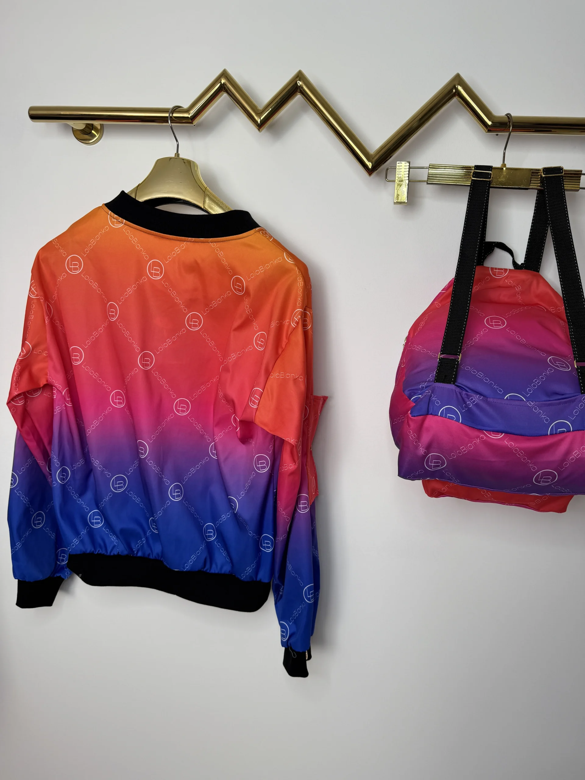 Kurtka Lola Bianka szwedka z plecakiem w kolorze pomarańczowo-różowo-niebieskim ombre – modny zestaw, który łączy wygodę, praktyczność i styl.Kurtka Lola Bianka szwedka + plecak w kolorze pomarańczowo-różowo-niebieskim ombre. Lekki zestaw na wiosnę i lato. Uniwersalny rozmiar S/M/L.