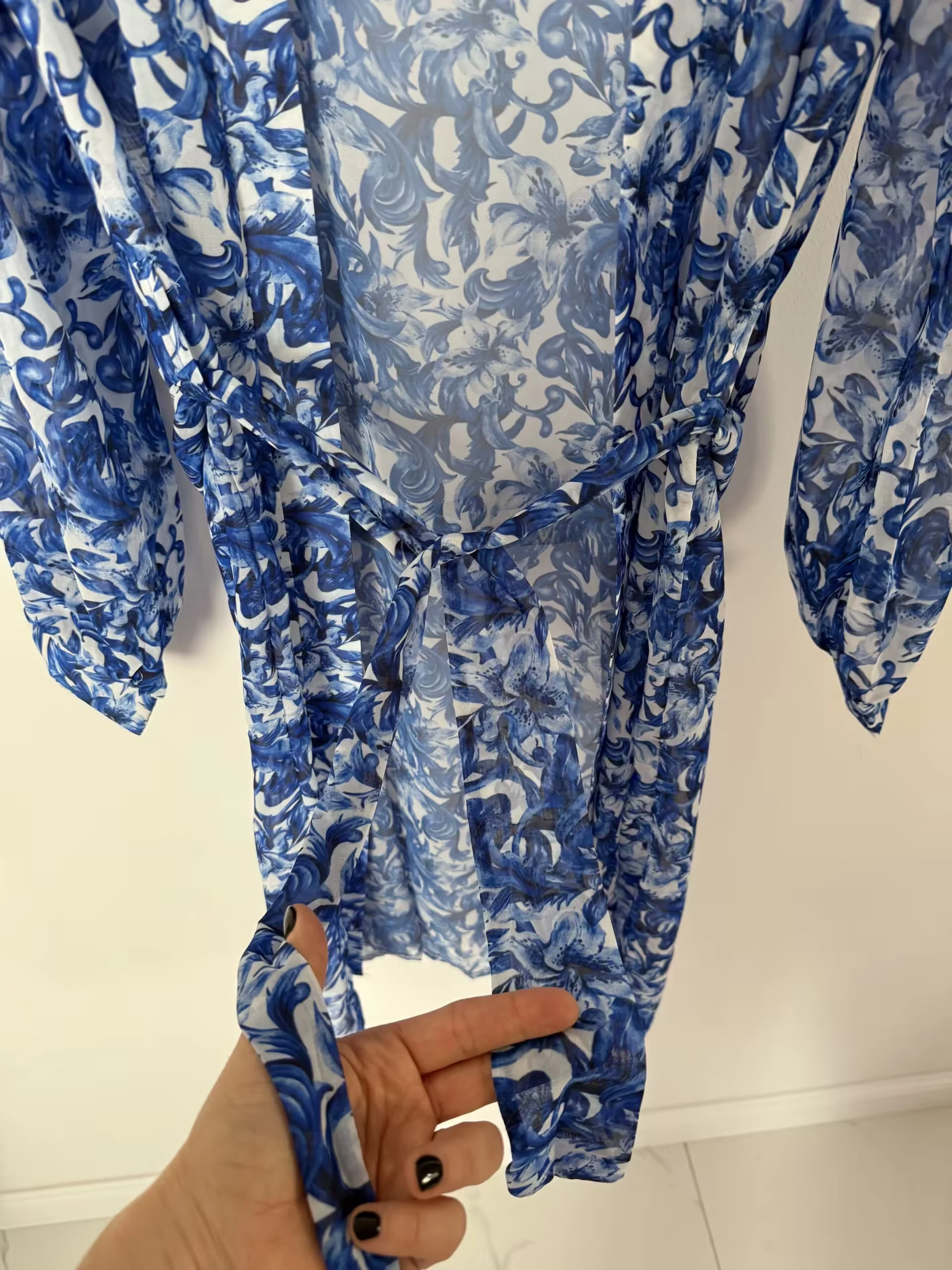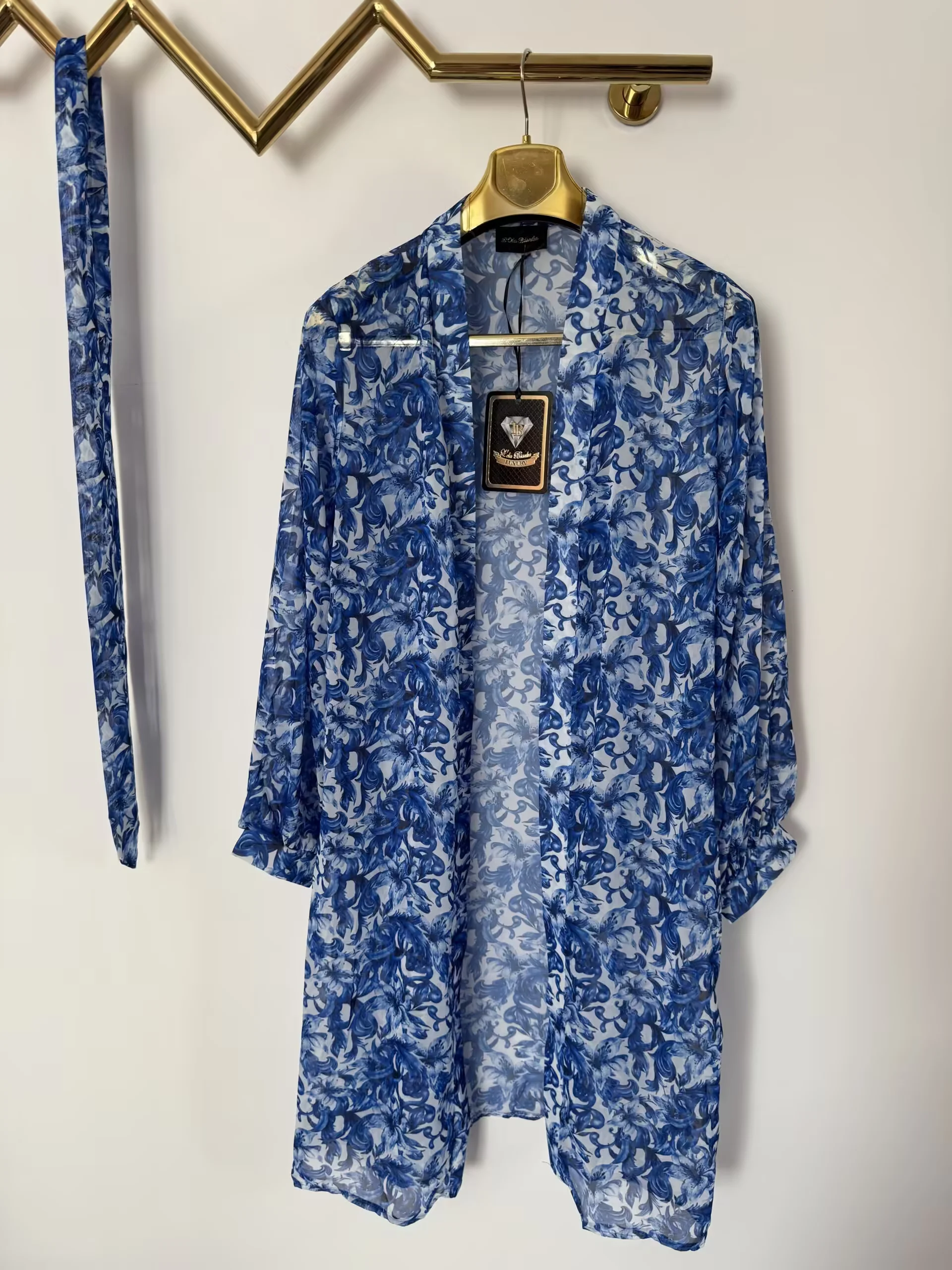 prześliczna cieniutka przewiewna narzutka, dodatkowo wiązana paskiem, rękawek długi, po bokach szlufki, idealna na gorące lato
