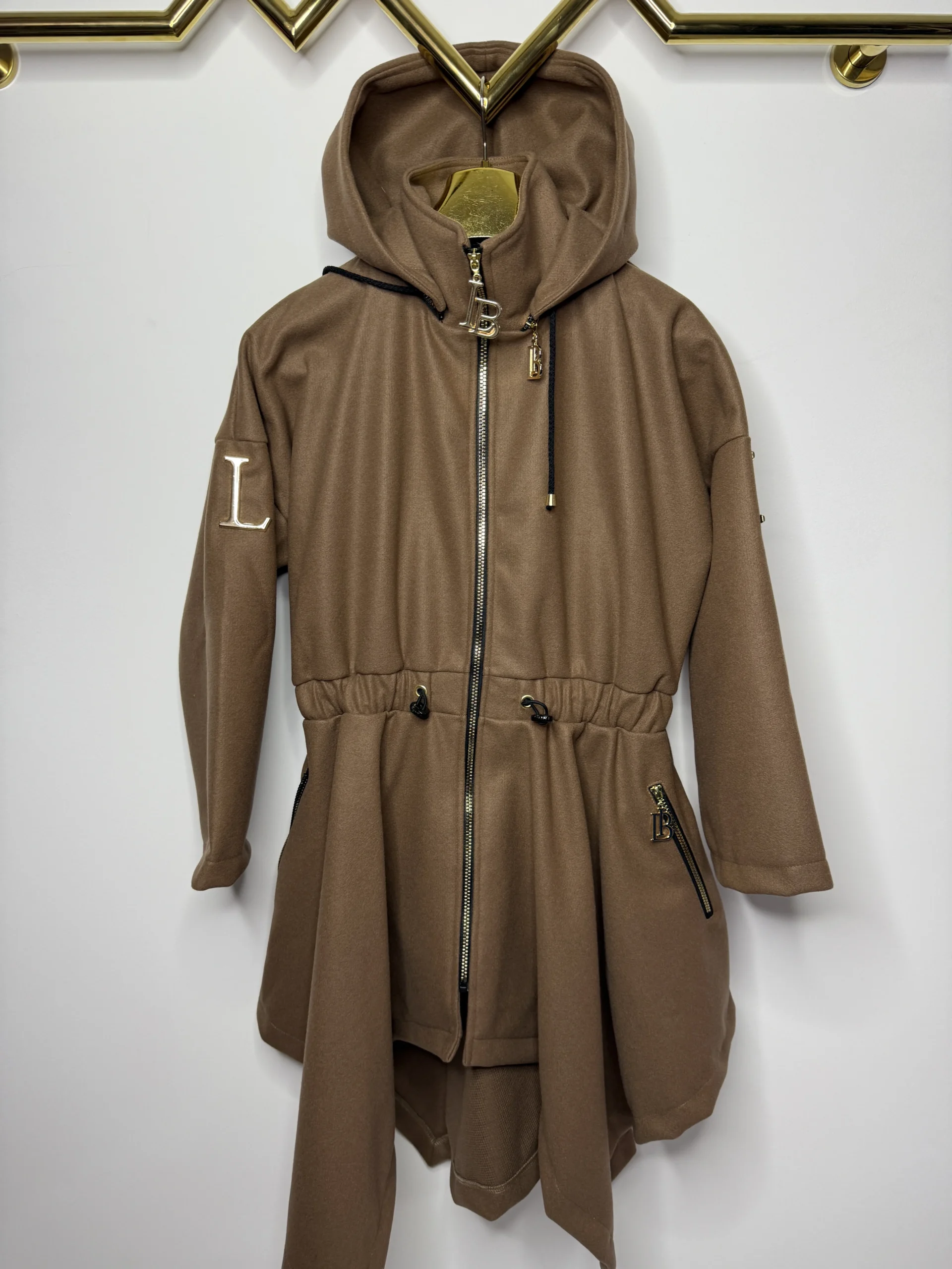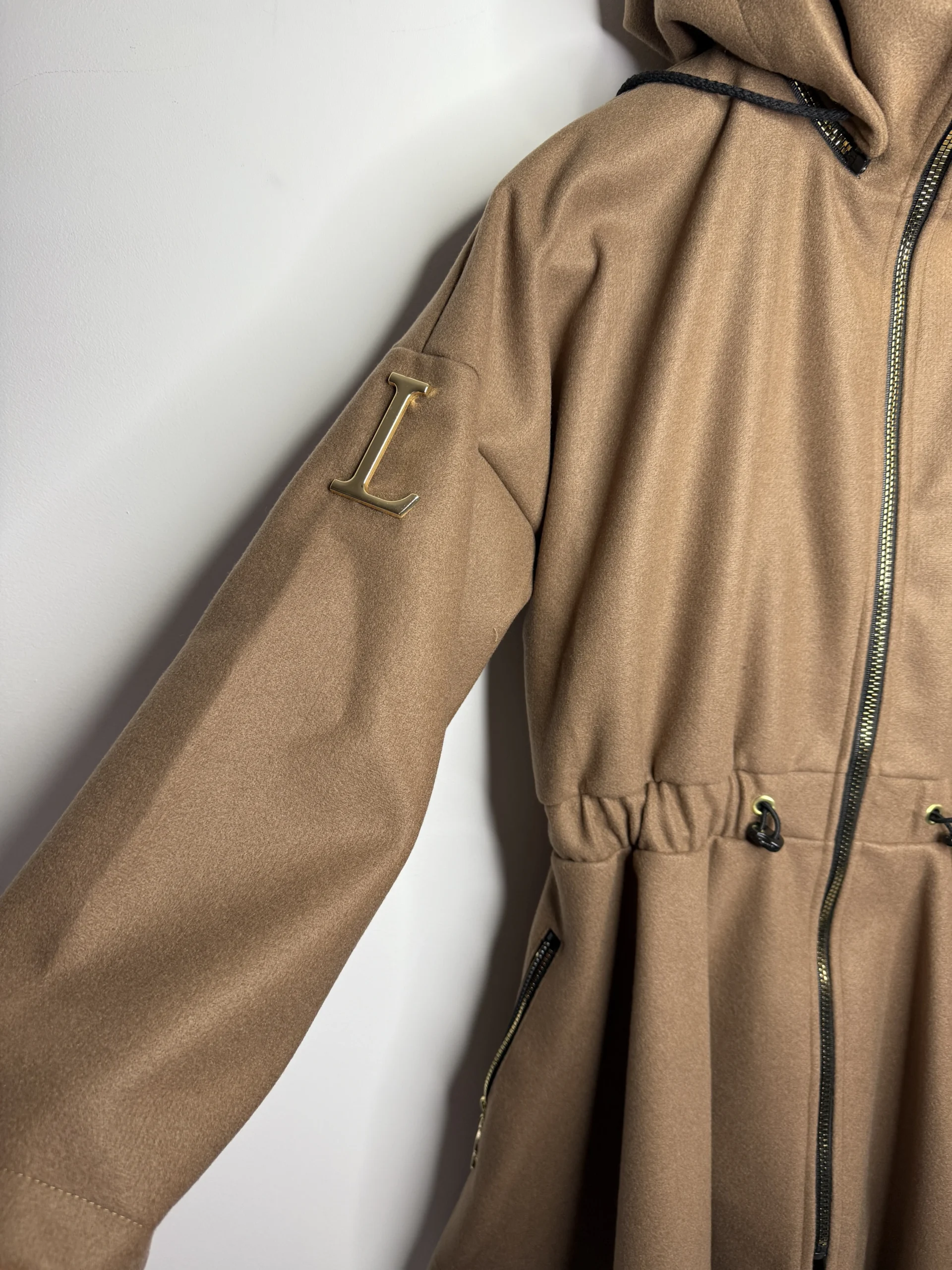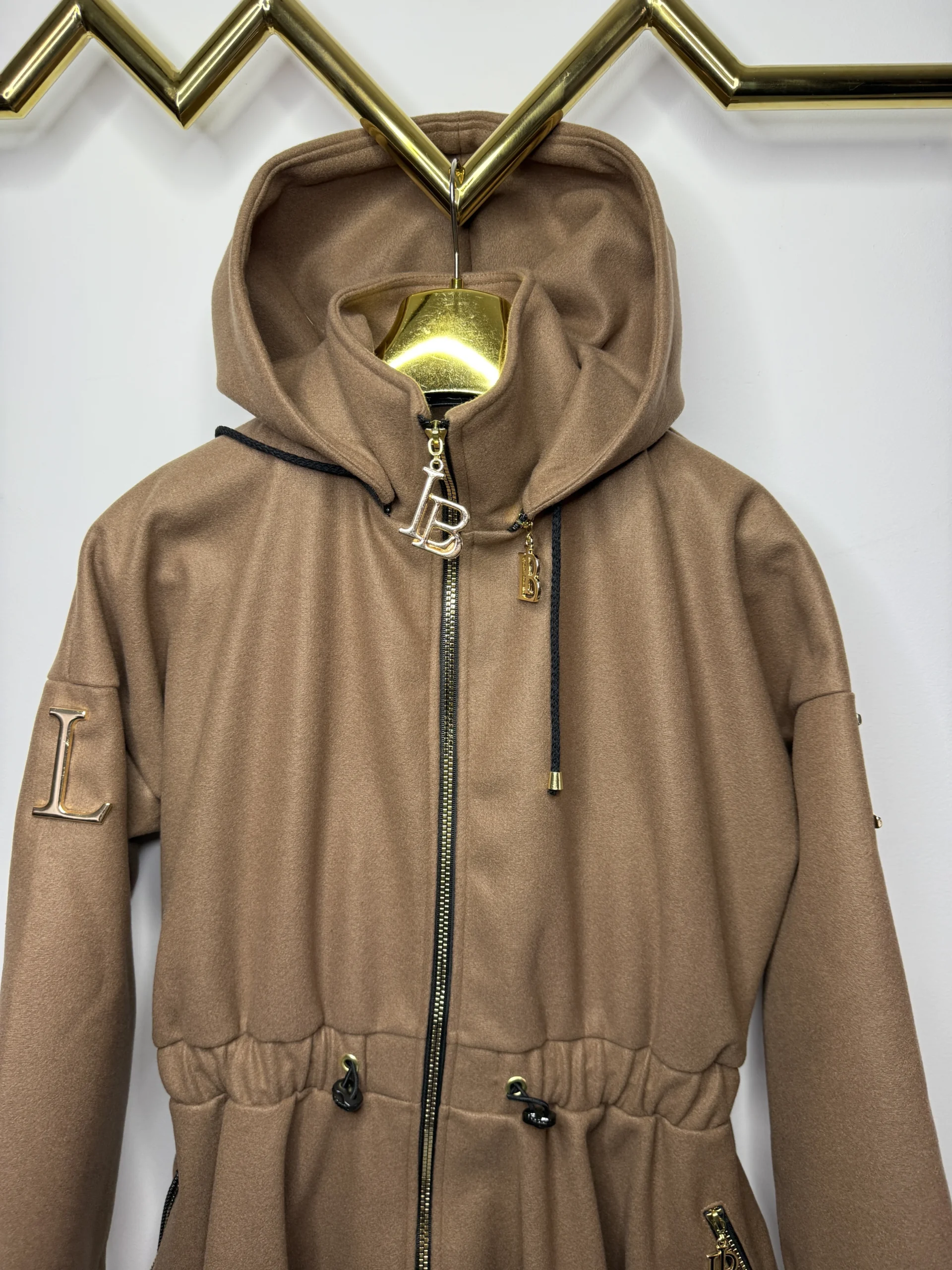 Dodatkowo odpinany kaptur. kieszenie po bokach zapinane na zamek. Piękny karmelowy kolor