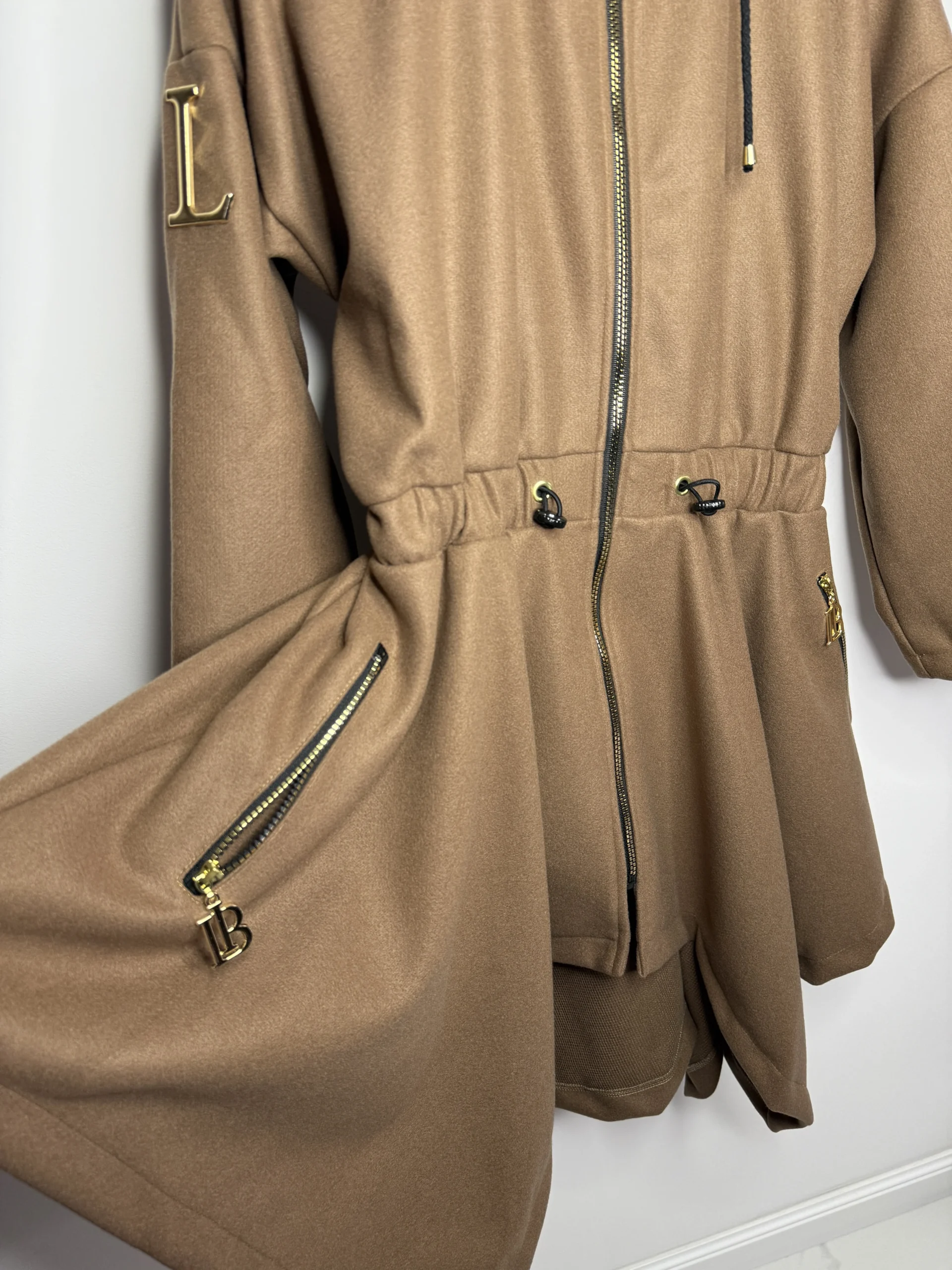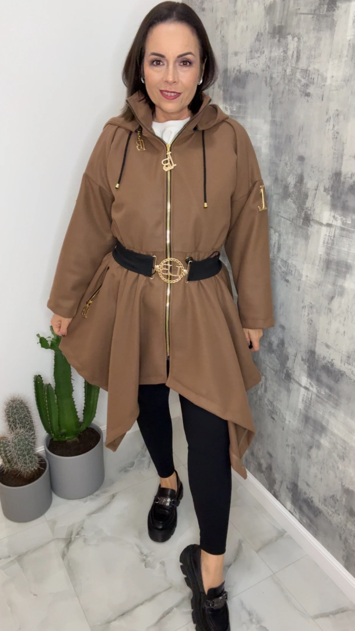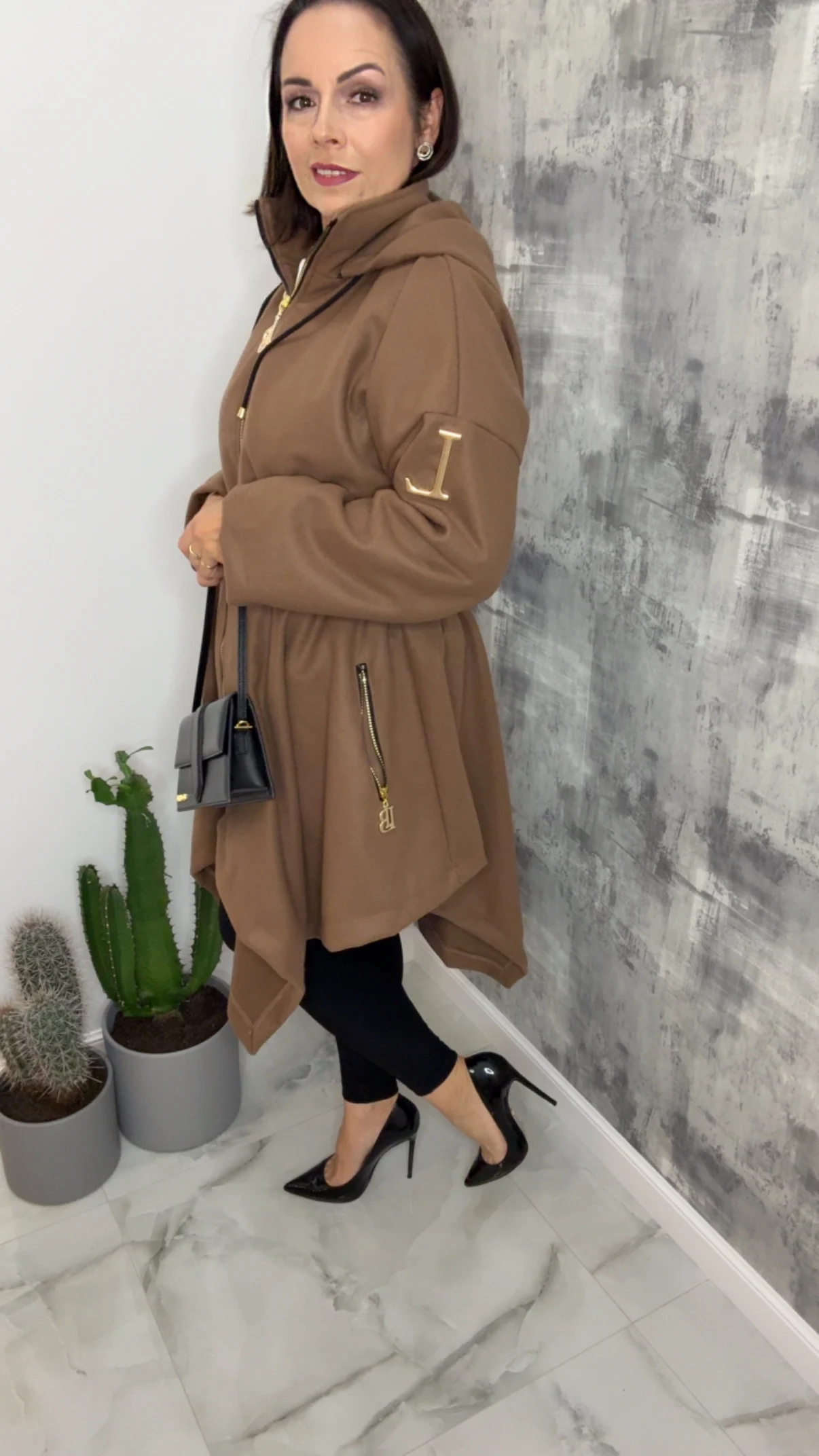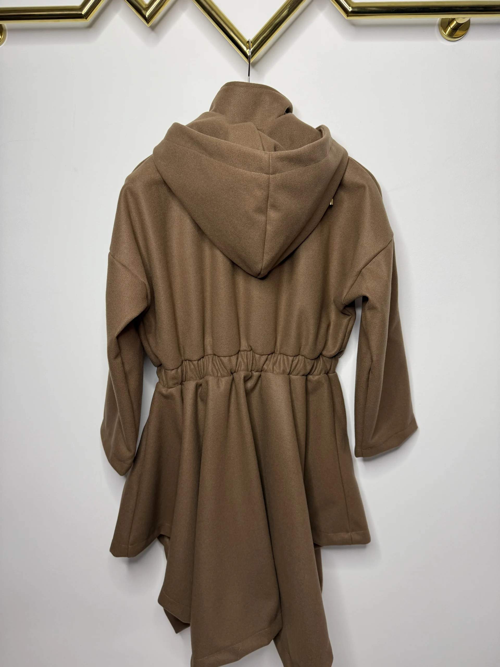 Dodatkowo odpinany kaptur. kieszenie po bokach zapinane na zamek. Piękny karmelowy kolor