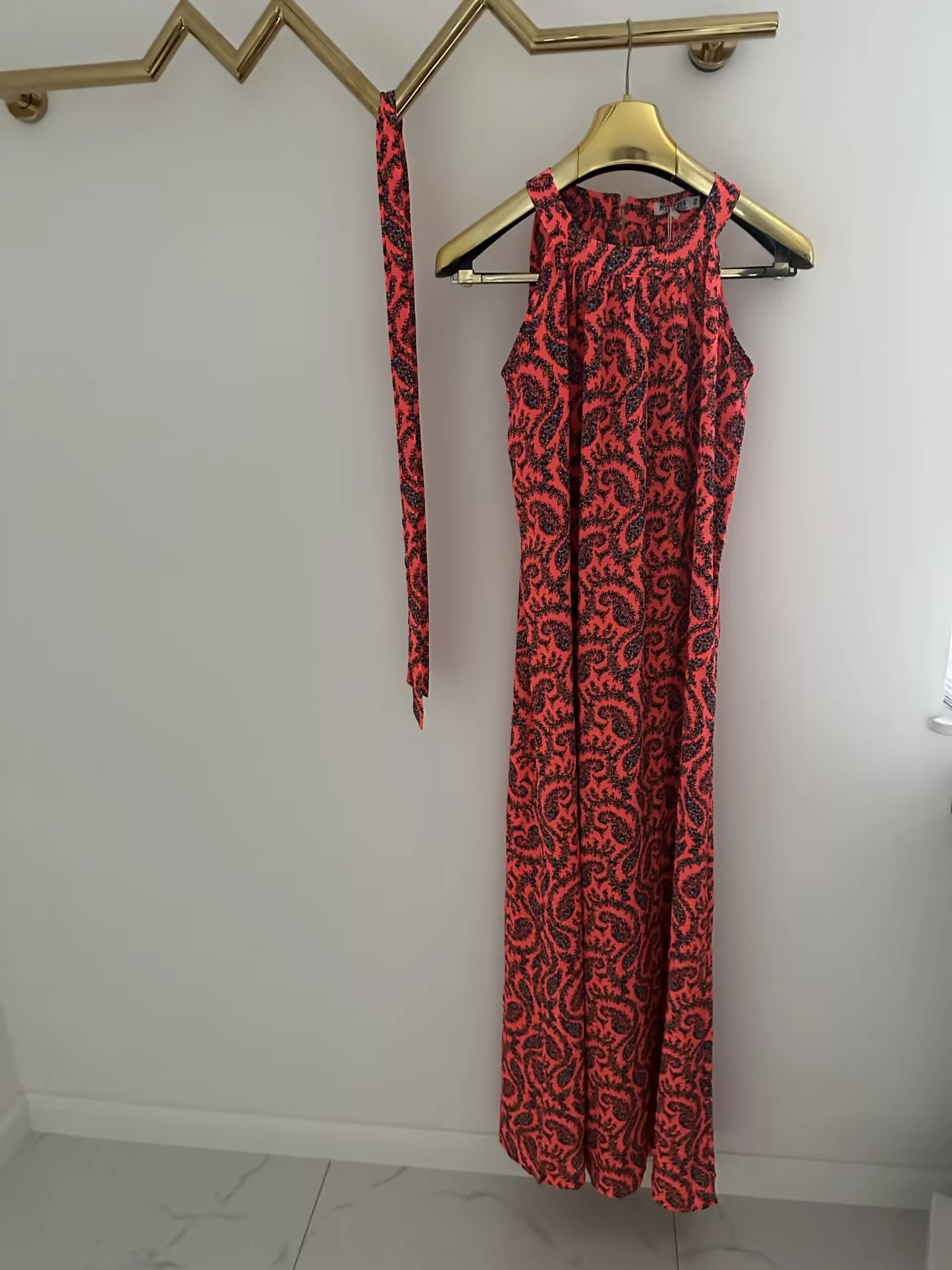rozmiar uni pasuje od S do L, zapinana z tyłu wokół szyi , dodatkowo w zestawie pasek do związania w pasie