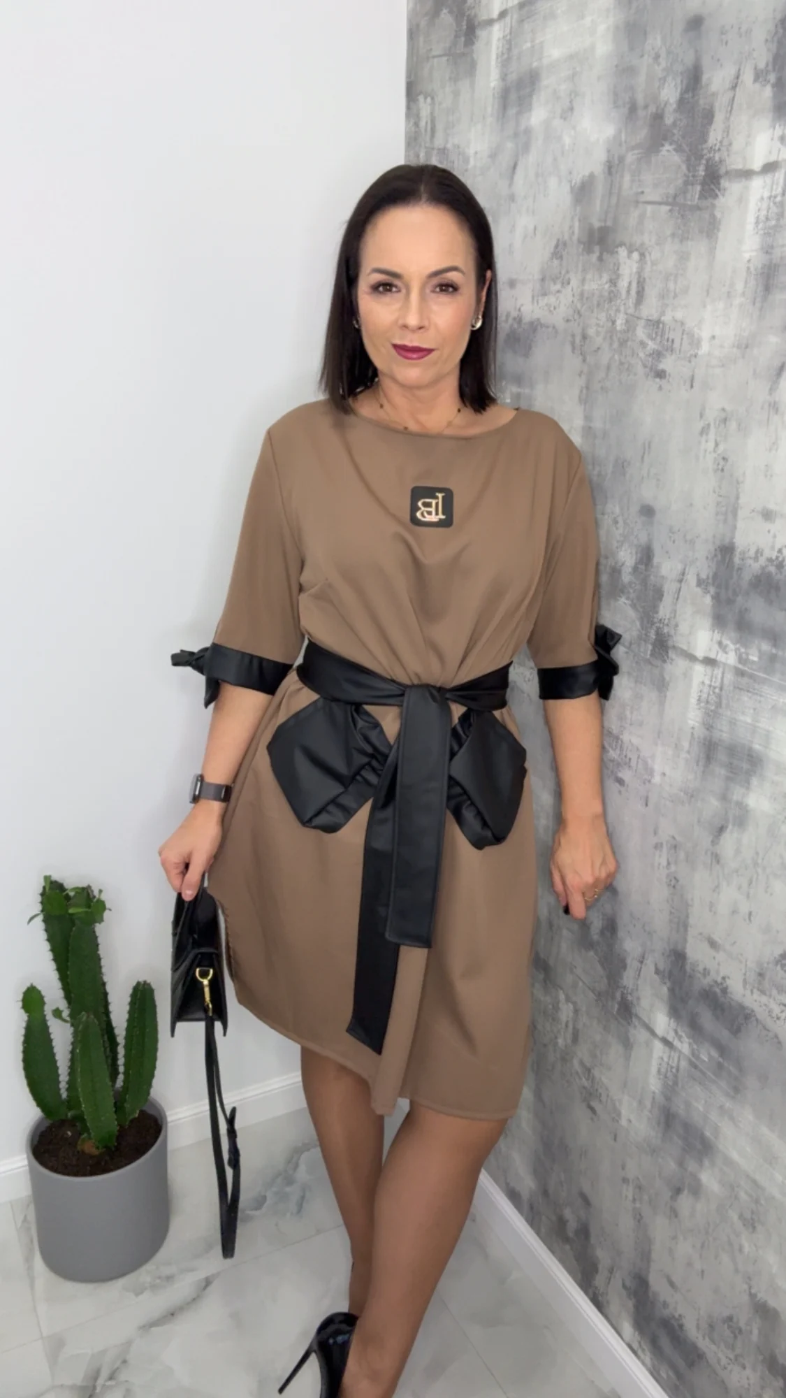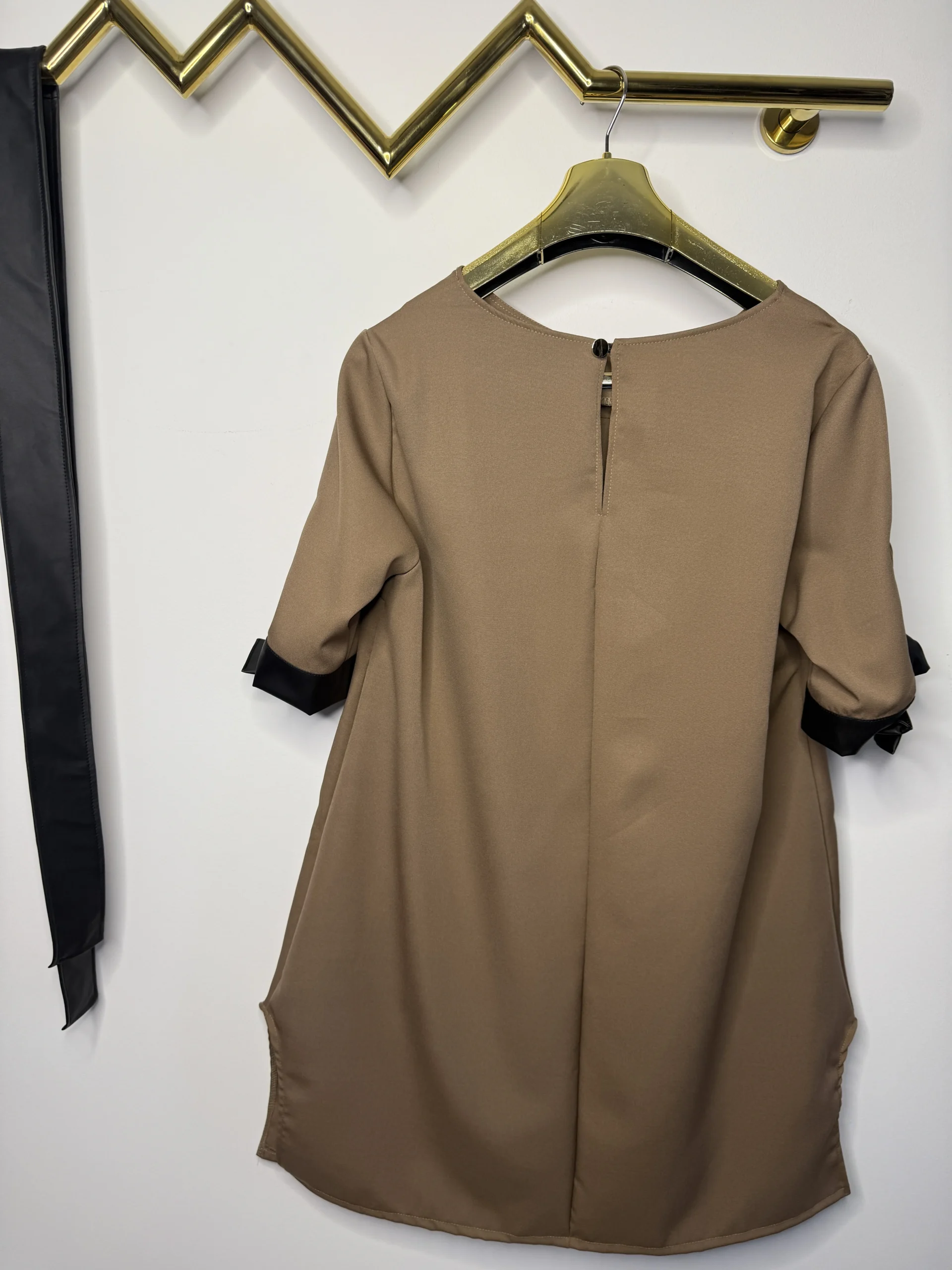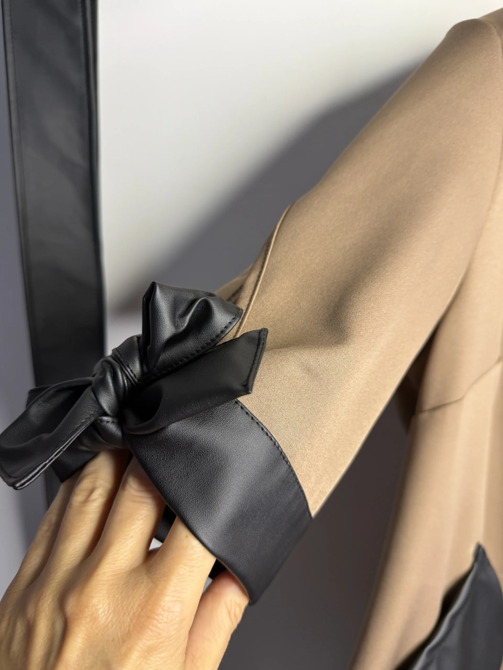 Rękawek 3/4 zakończony ekoskórą wiązaniem na kokardkę.