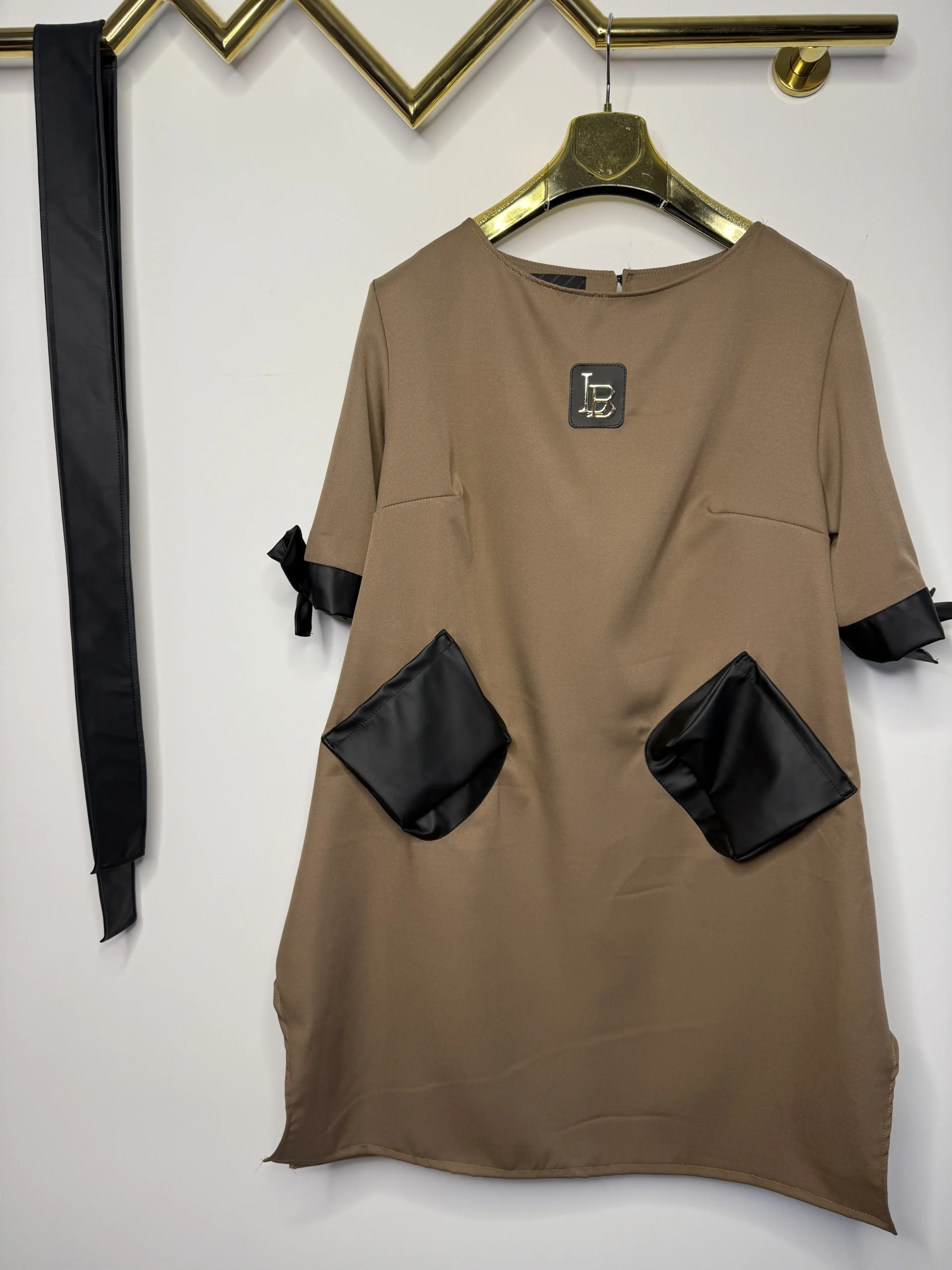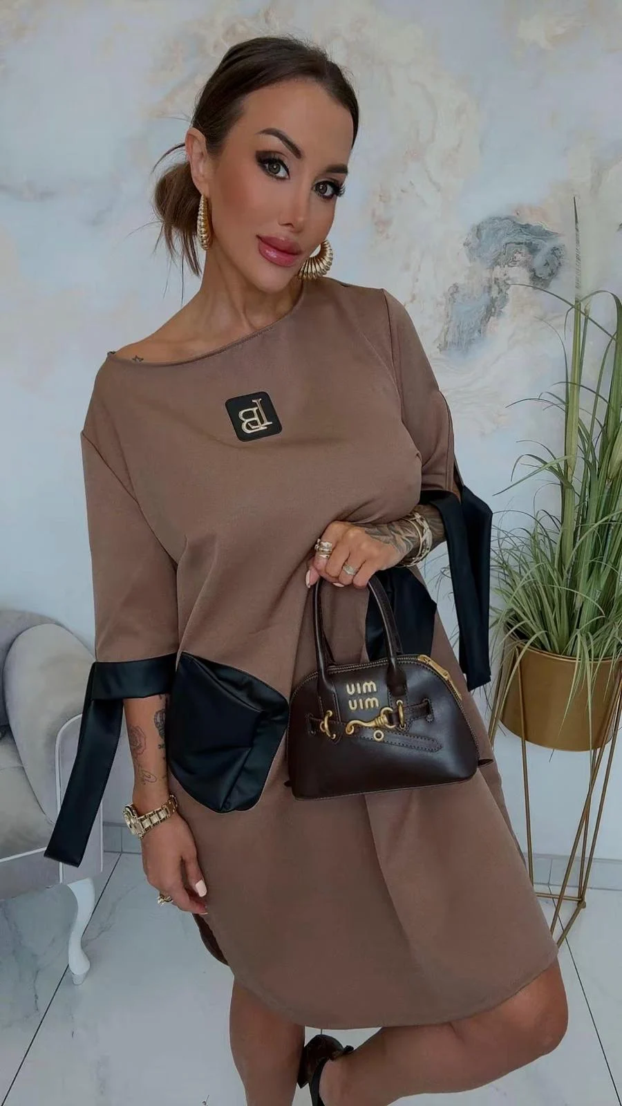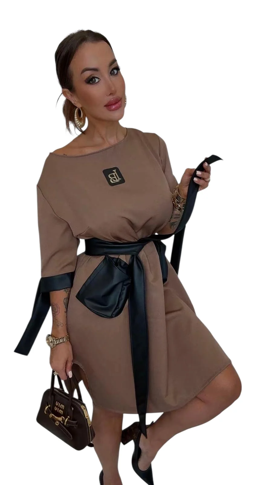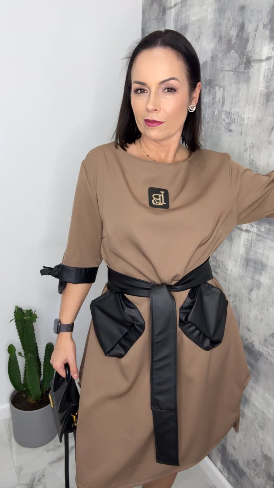 Rękawek 3/4 zakończony ekoskórą wiązaniem na kokardkę.