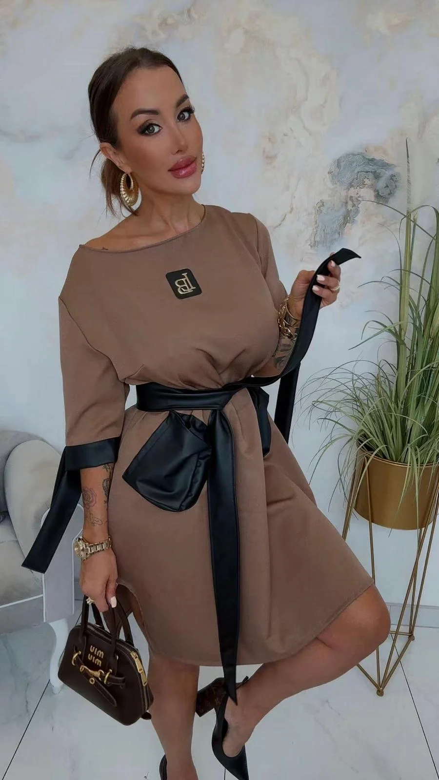 Przepiękny model eleganckiej sukienki w klasycznym beżu, którą założysz do pracy na chrzciny czy na spotkanie.