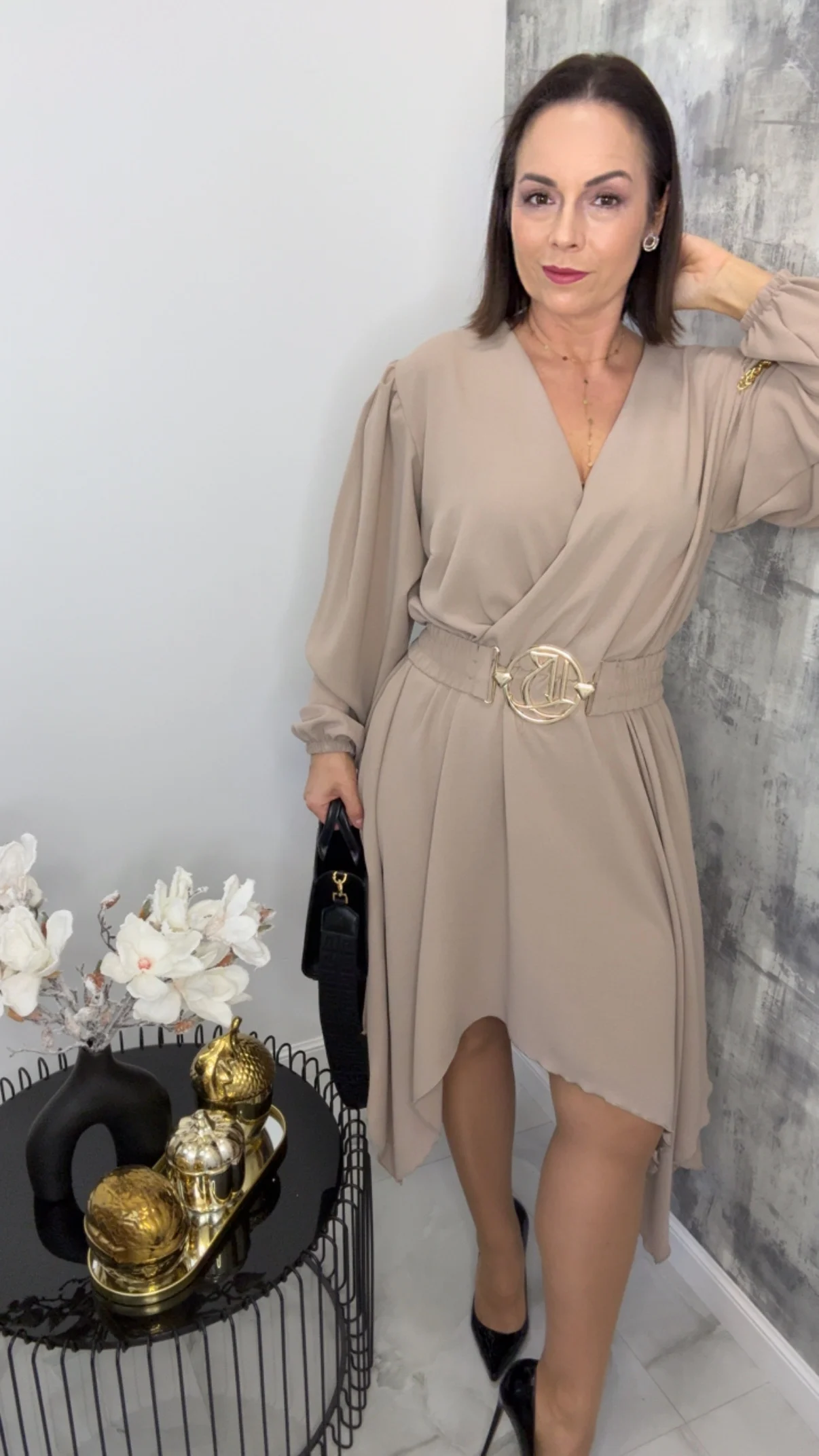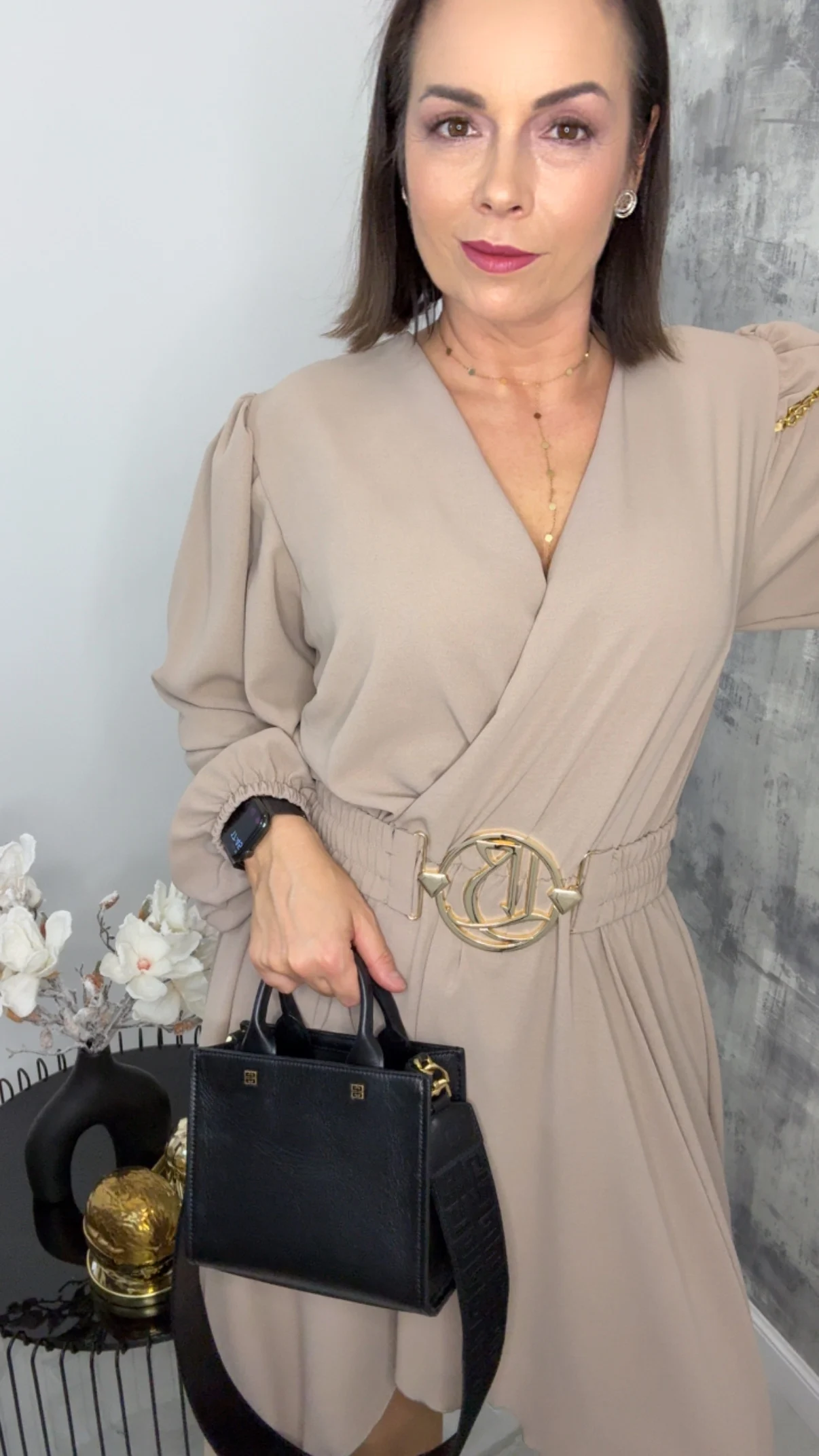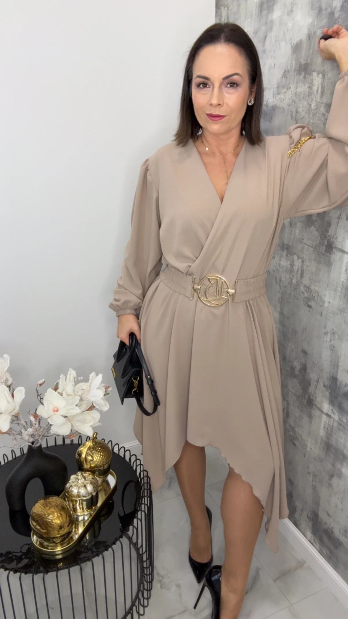 Sukienka Lola Bianka beżowa elegancka wizytowa w rozmiarze uniwersalnym w zestawie z paskiem z klamrą
