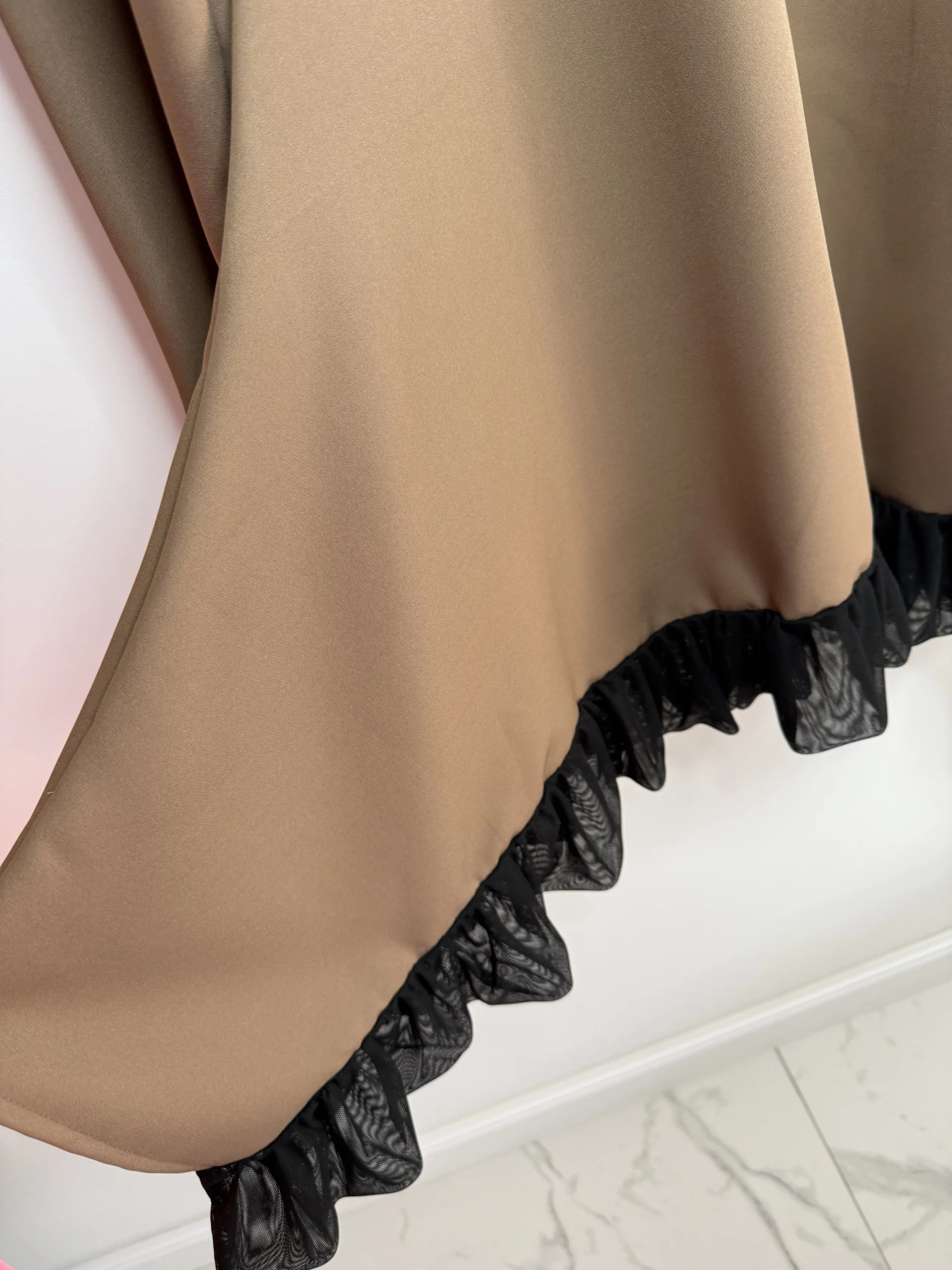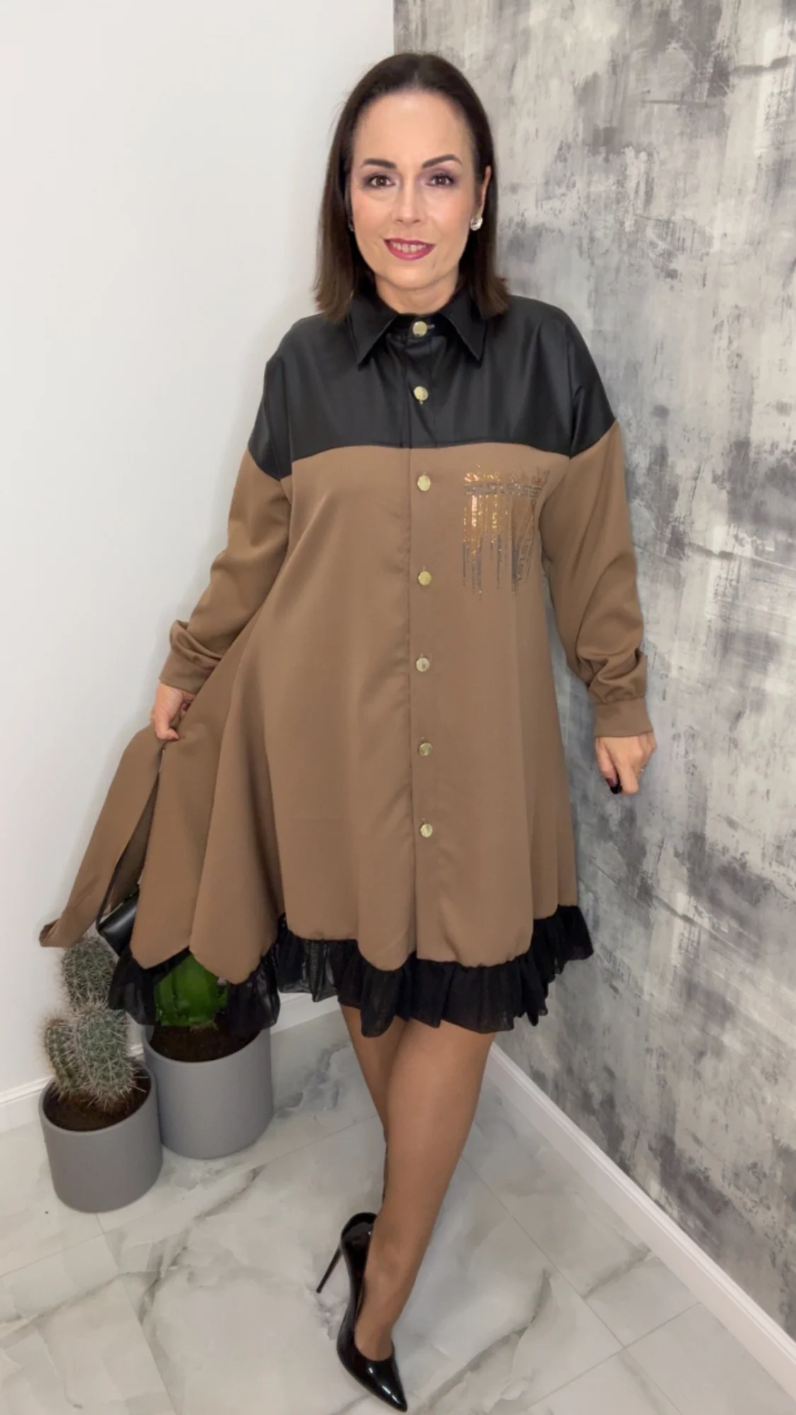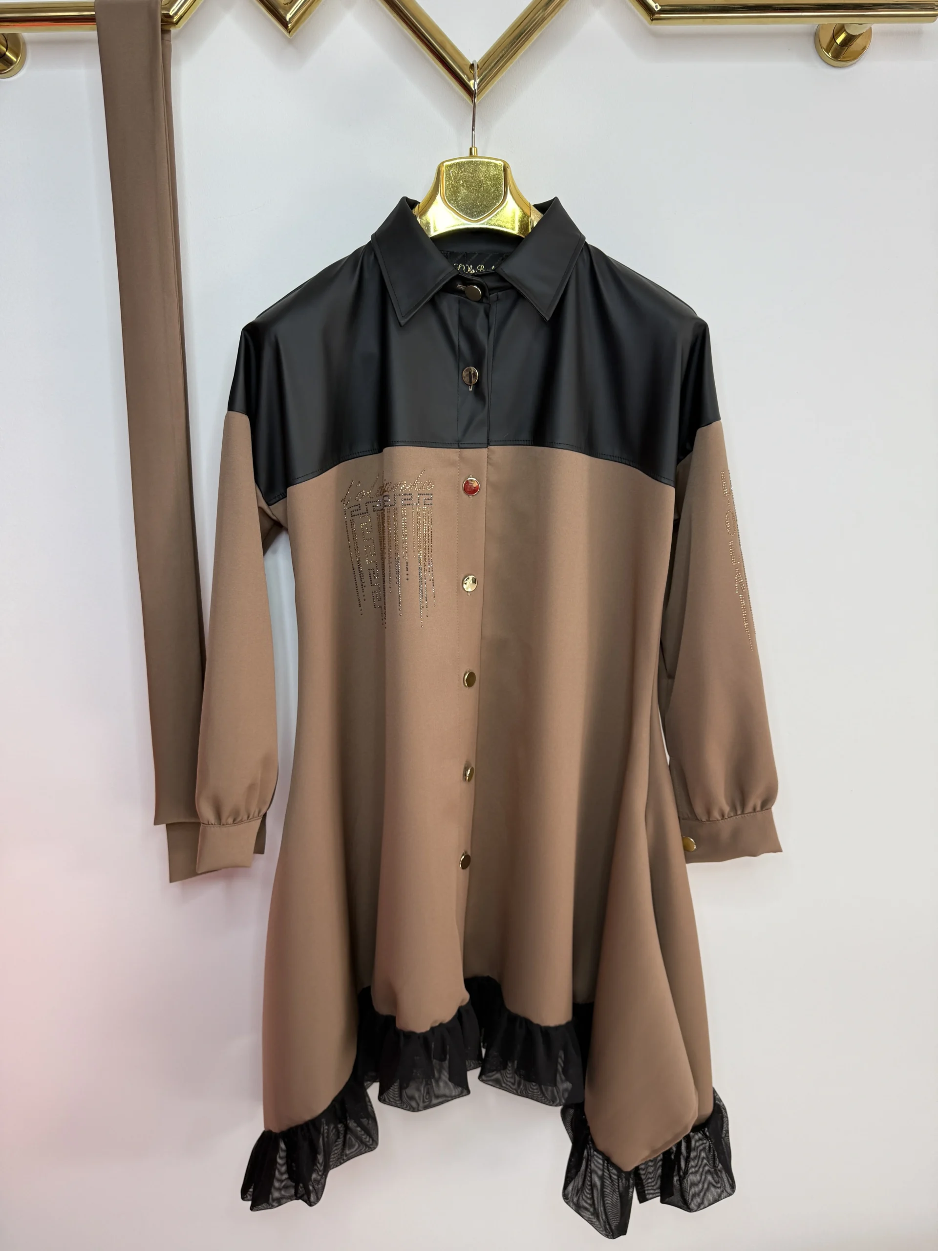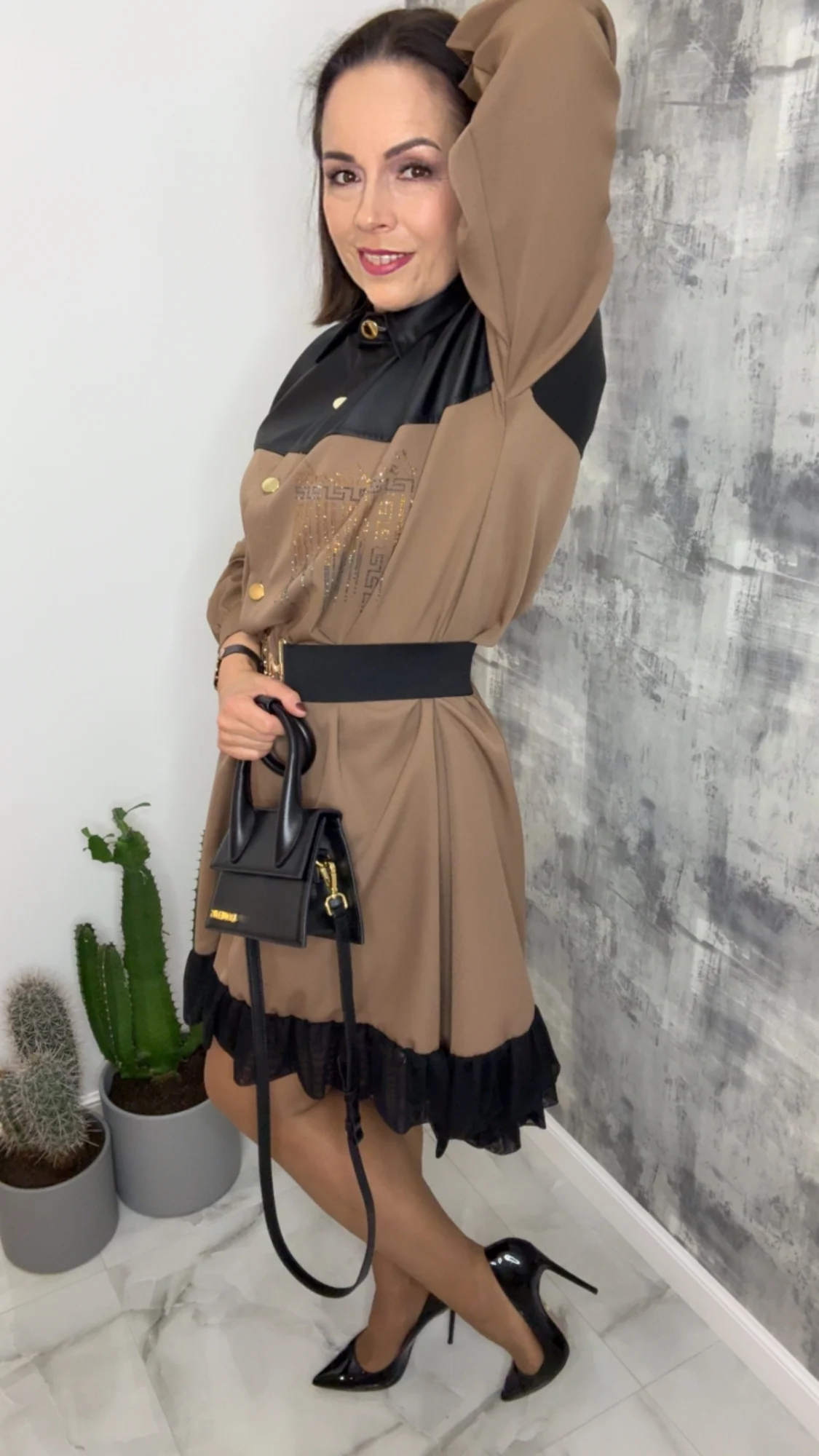 Zapinana na guziki, zdobiona cyrkoniami, na dole wykończona tiulem. Rękawek-mankiet z guzikiem.