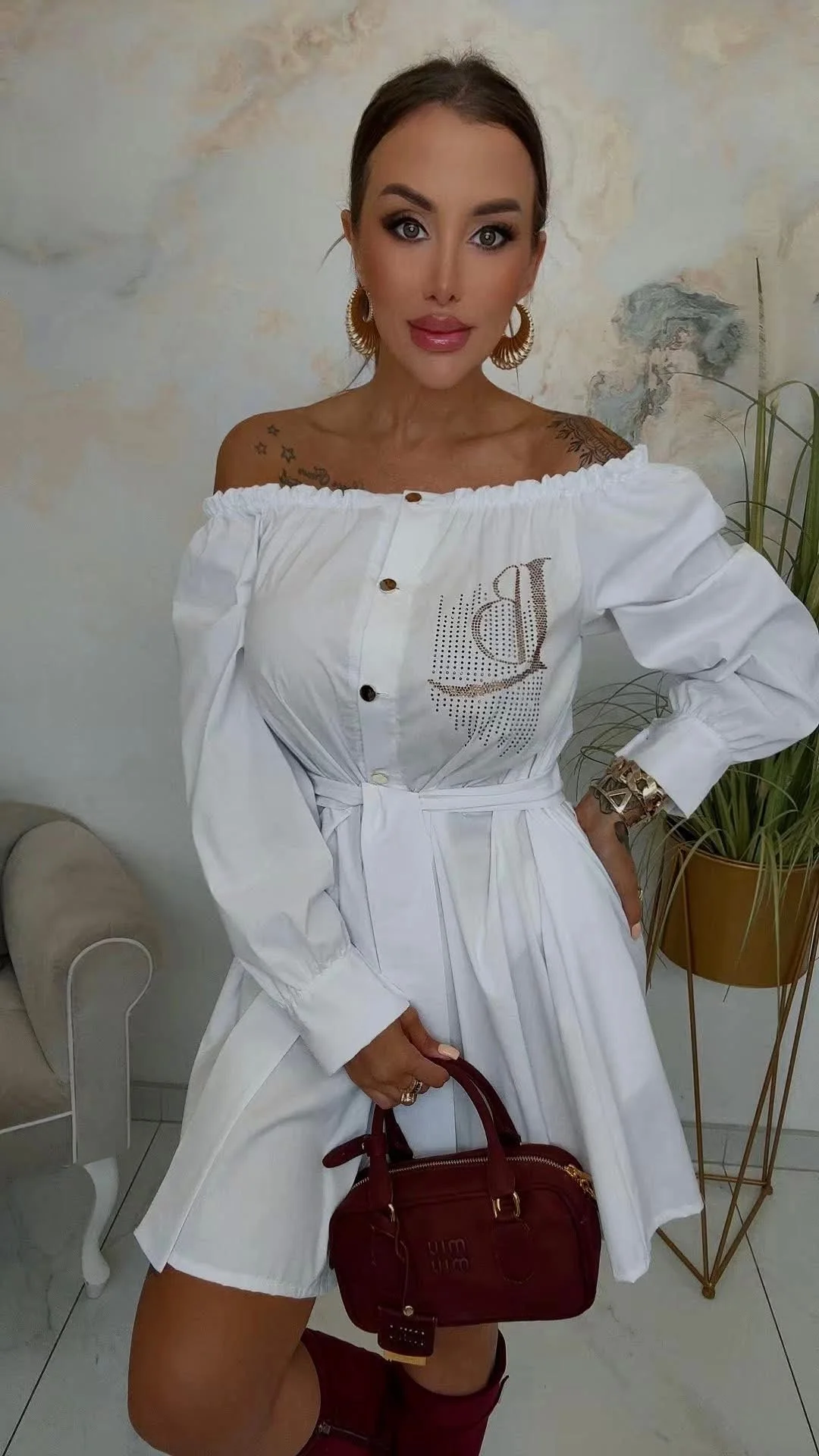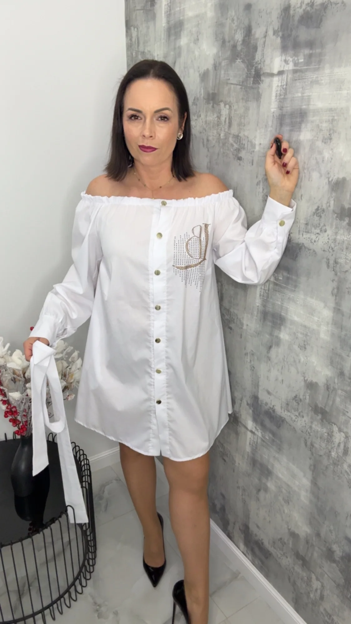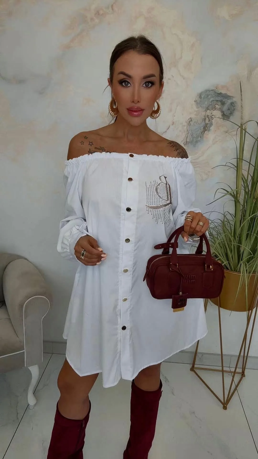 Przepiękny model cienkiej koszulowej sukienki z długim rękawem zakończonym zapięciem na guzik. Góra hiszpanka na gumce z możliwością opuszczenia na ramiona lub nie, po bokach kieszenie na drobiazgi.