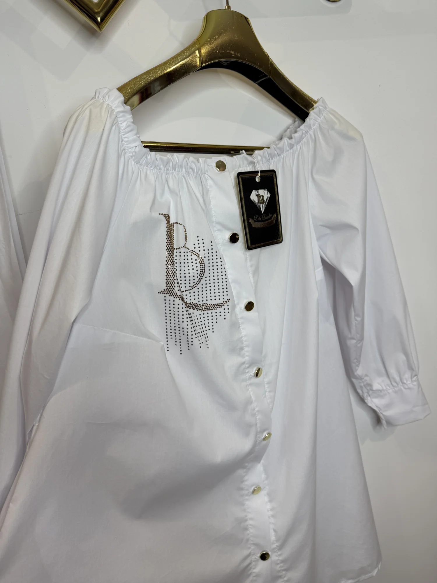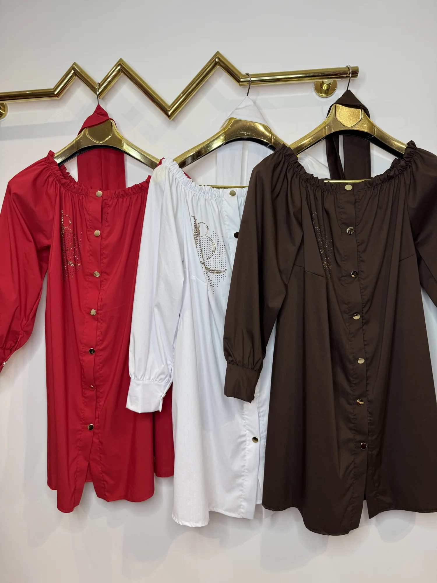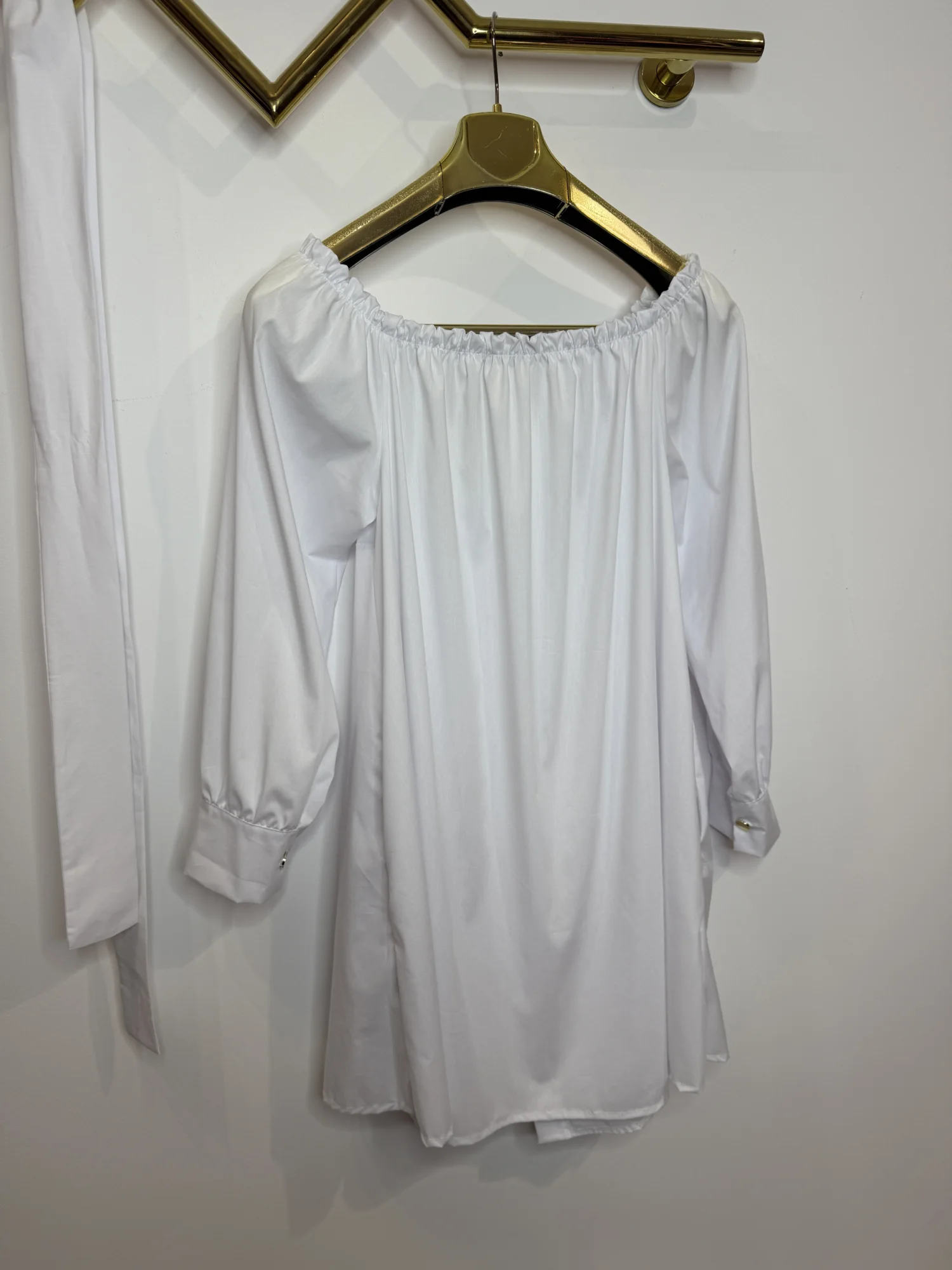 Przepiękny model cienkiej koszulowej sukienki z długim rękawem zakończonym zapięciem na guzik. Góra hiszpanka na gumce z możliwością opuszczenia na ramiona lub nie, po bokach kieszenie na drobiazgi.
