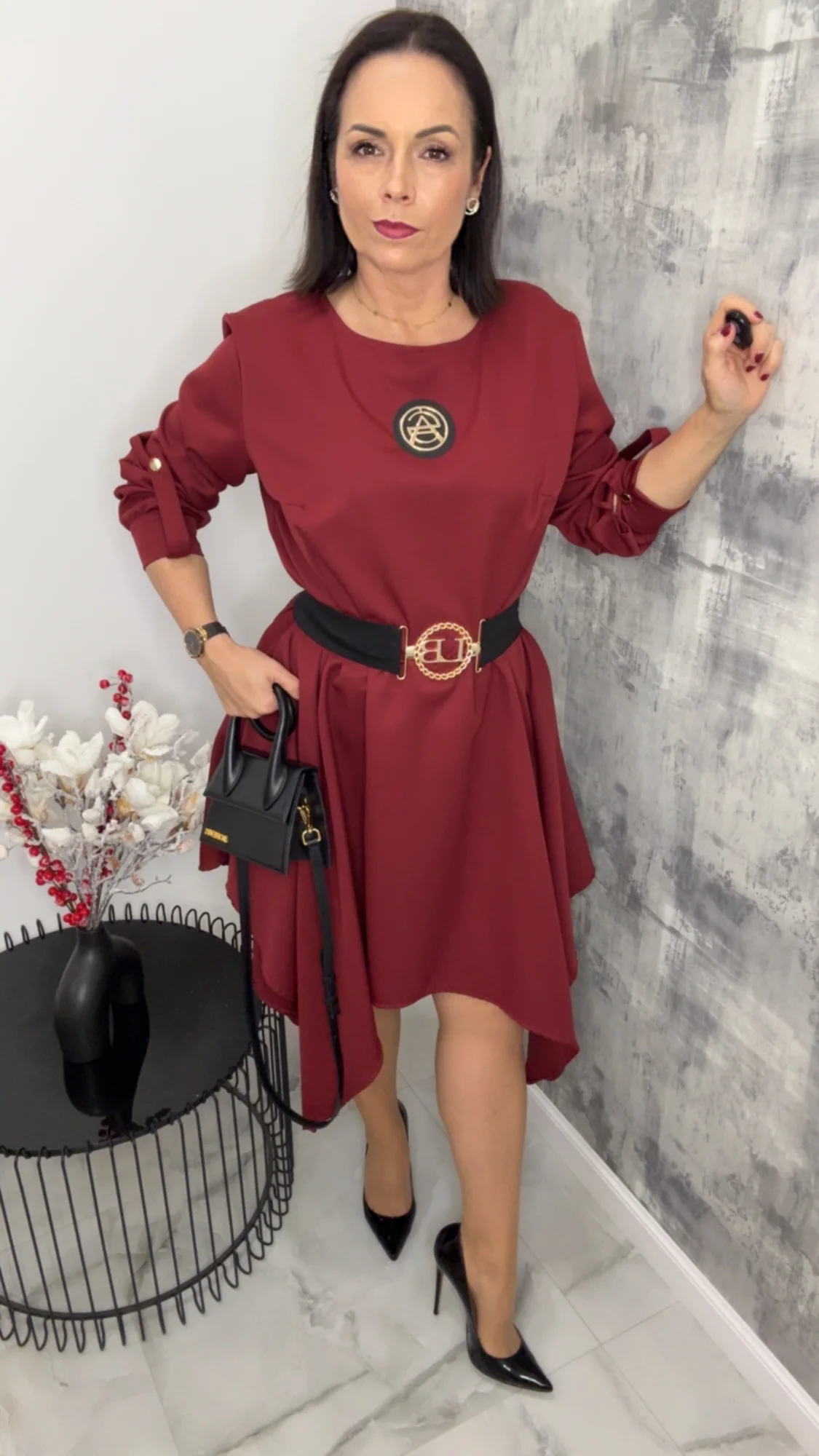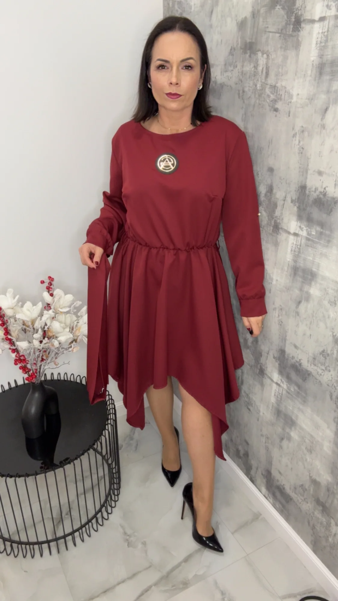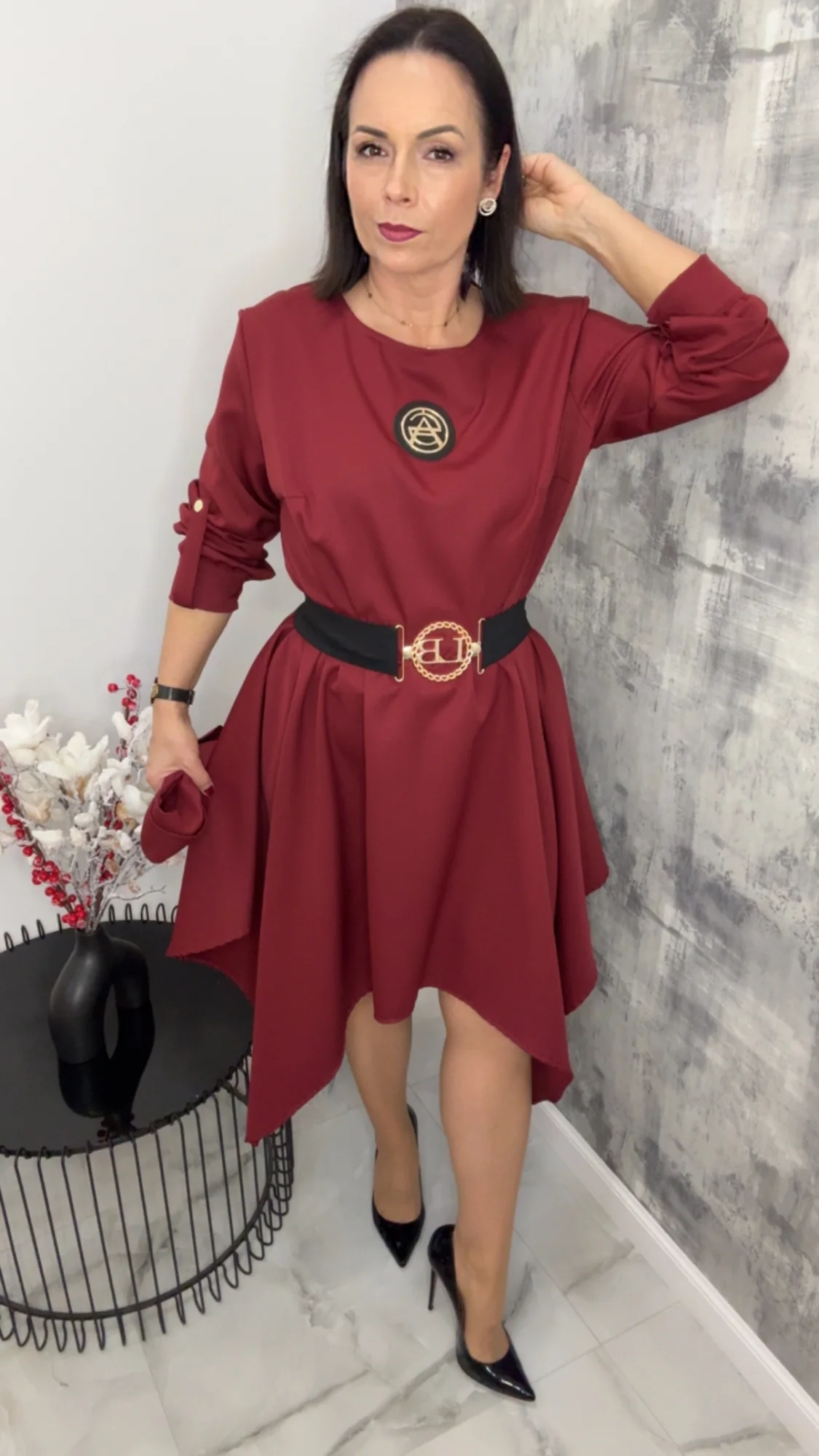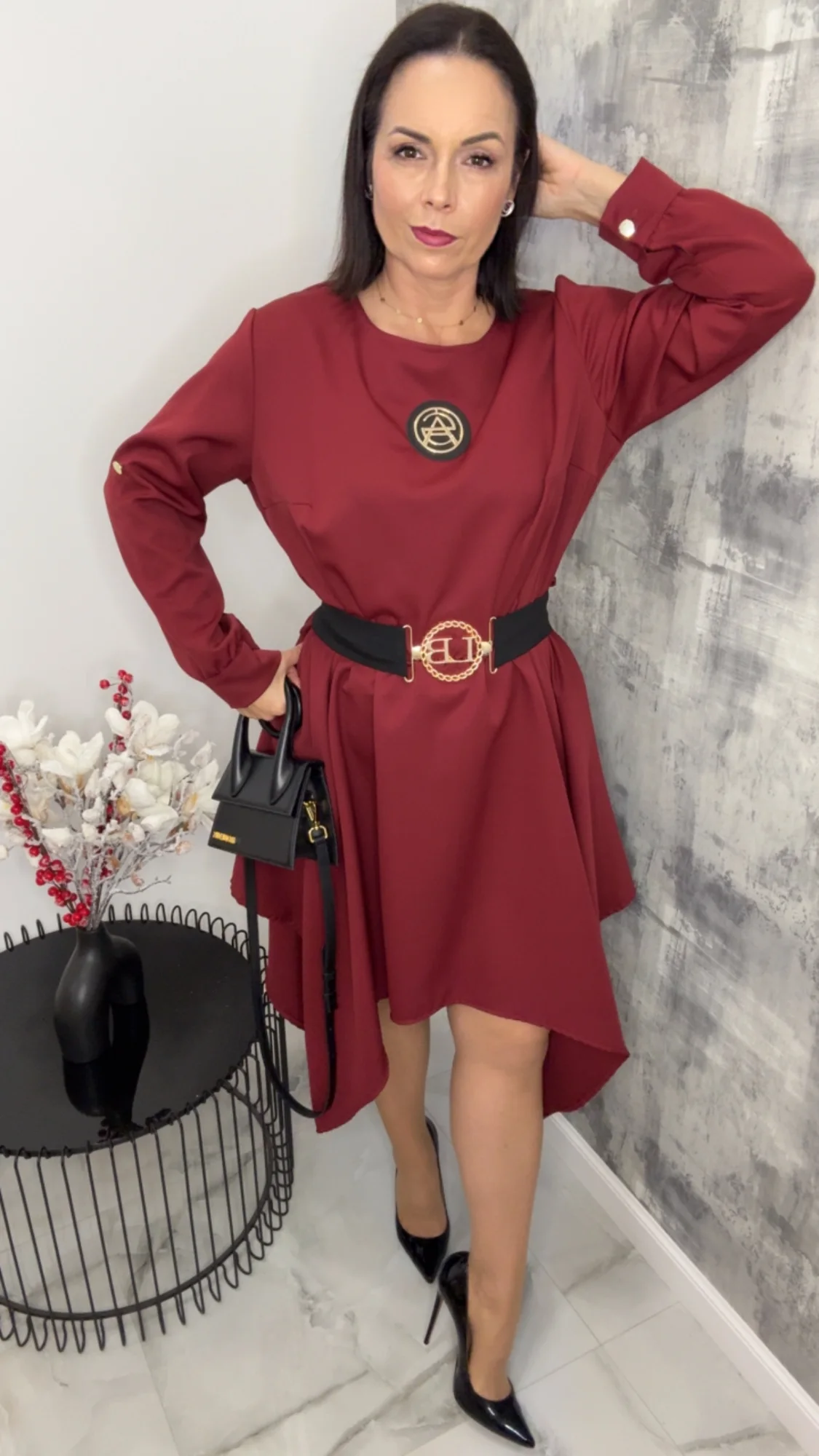 Sukienka Lola Bianka bordowa elegancka z paskiem z materiału w zestawie, zapinana z tyłu na guzik, zdecydowanie na wyższą Panią. Przepiękny model z kolekcji Aleksandry Szafrańskiej