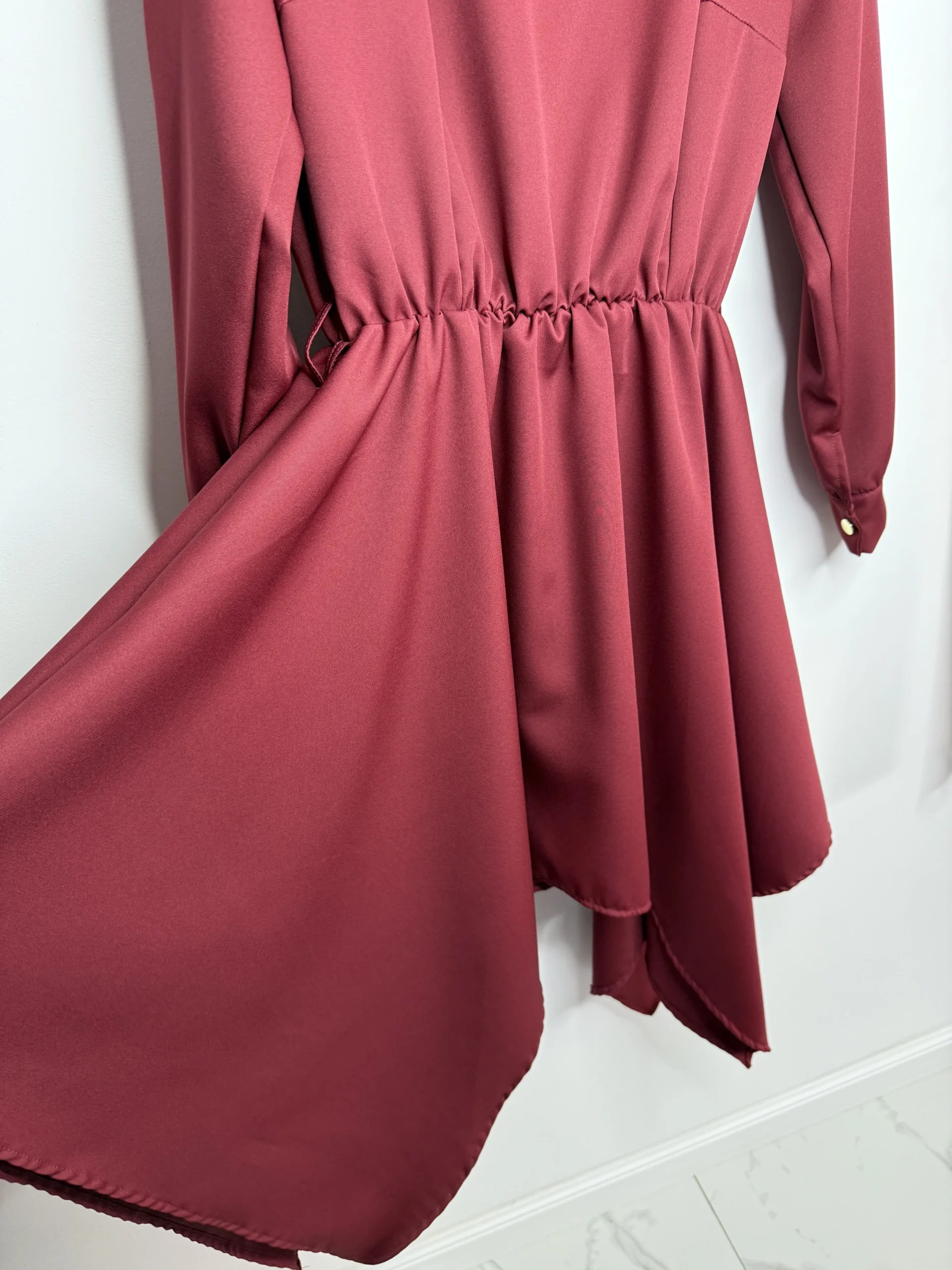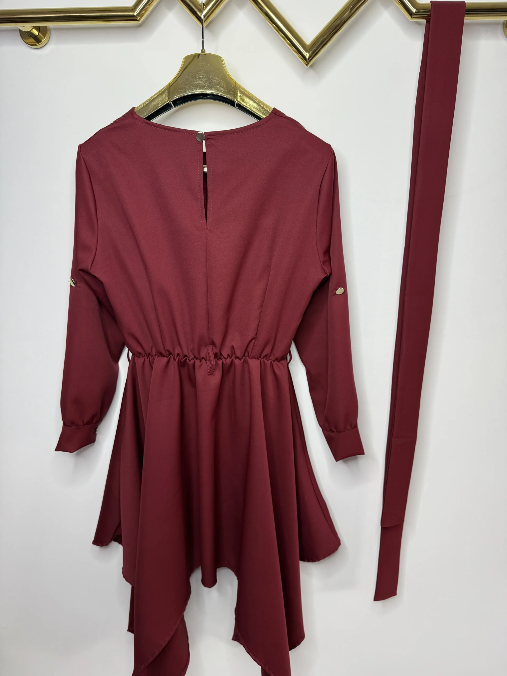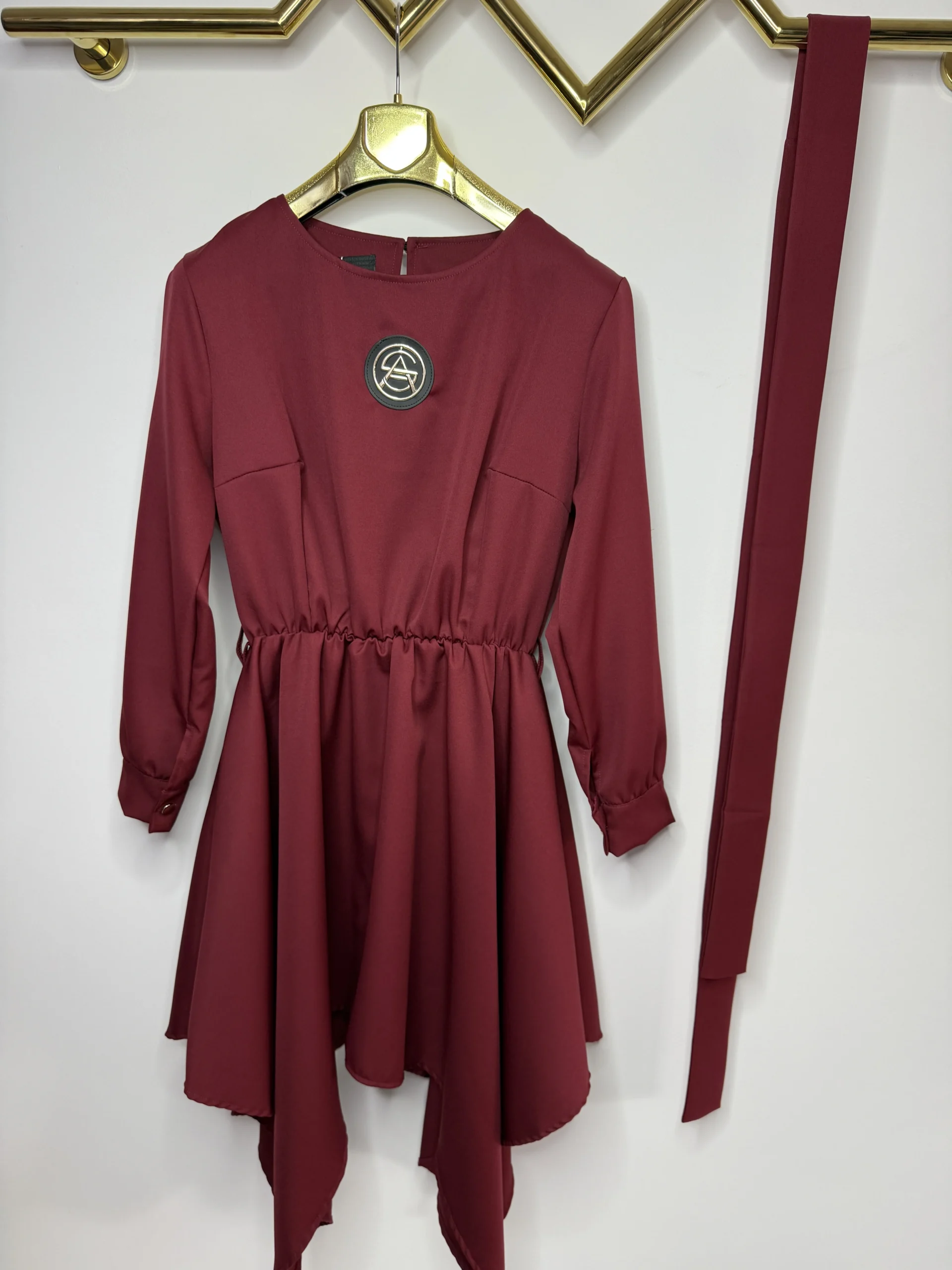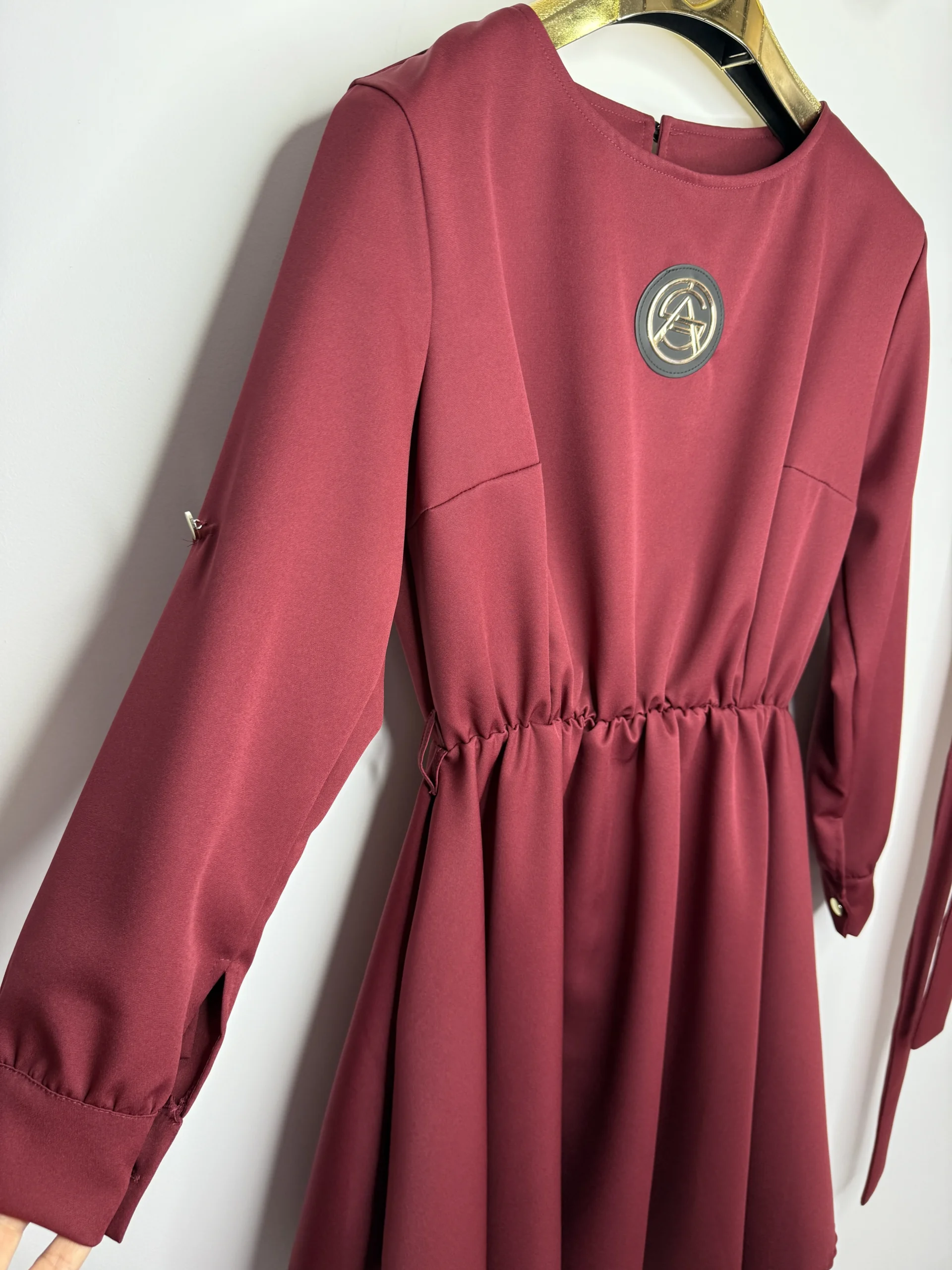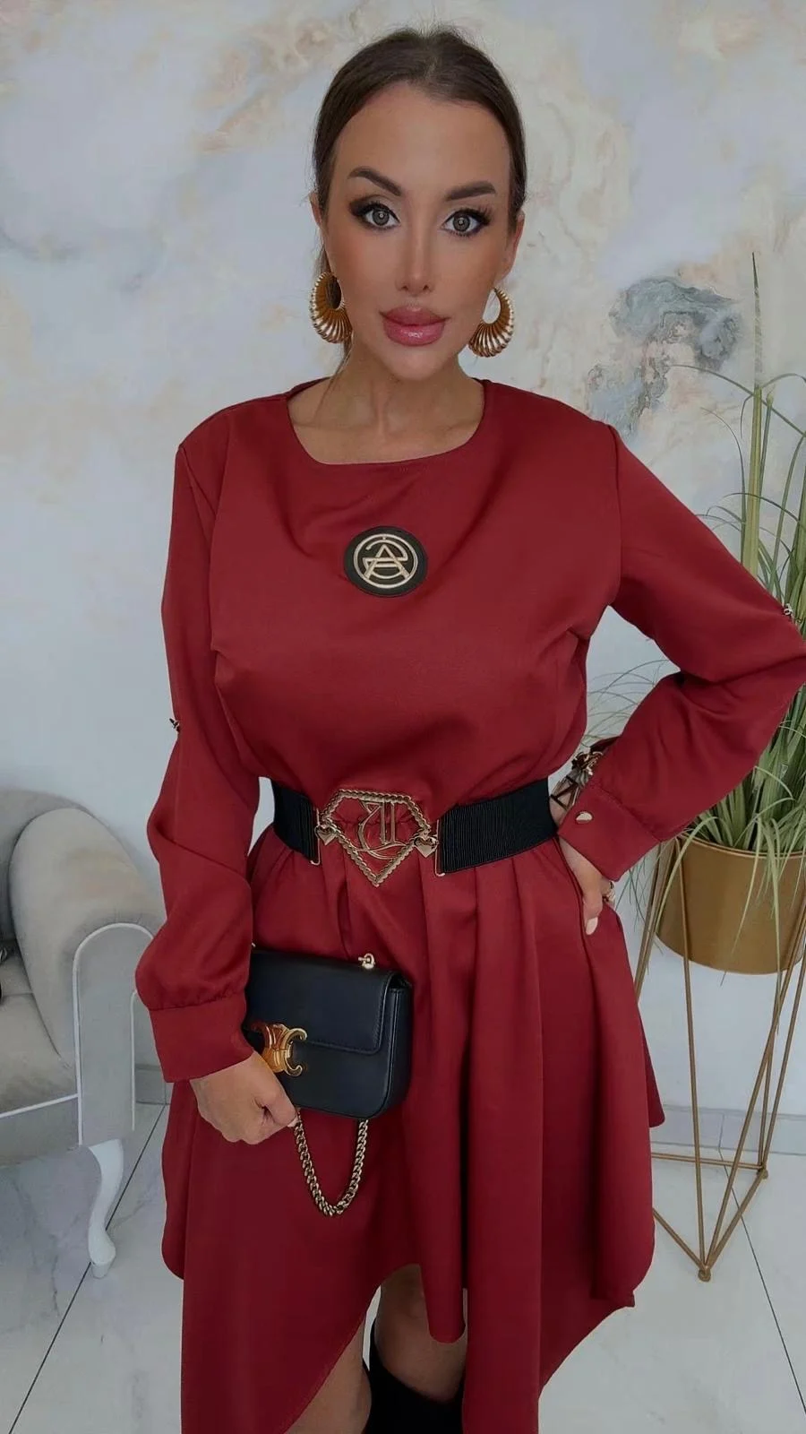 Sukienka Lola Bianka bordowa elegancka z paskiem z materiału w zestawie, zapinana z tyłu na guzik, zdecydowanie na wyższą Panią. Przepiękny model z kolekcji Aleksandry Szafrańskiej