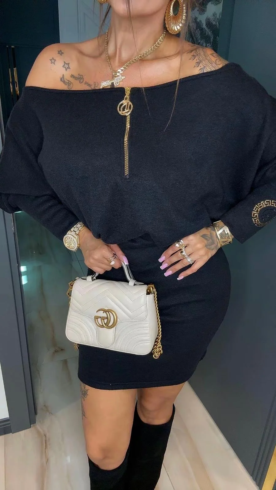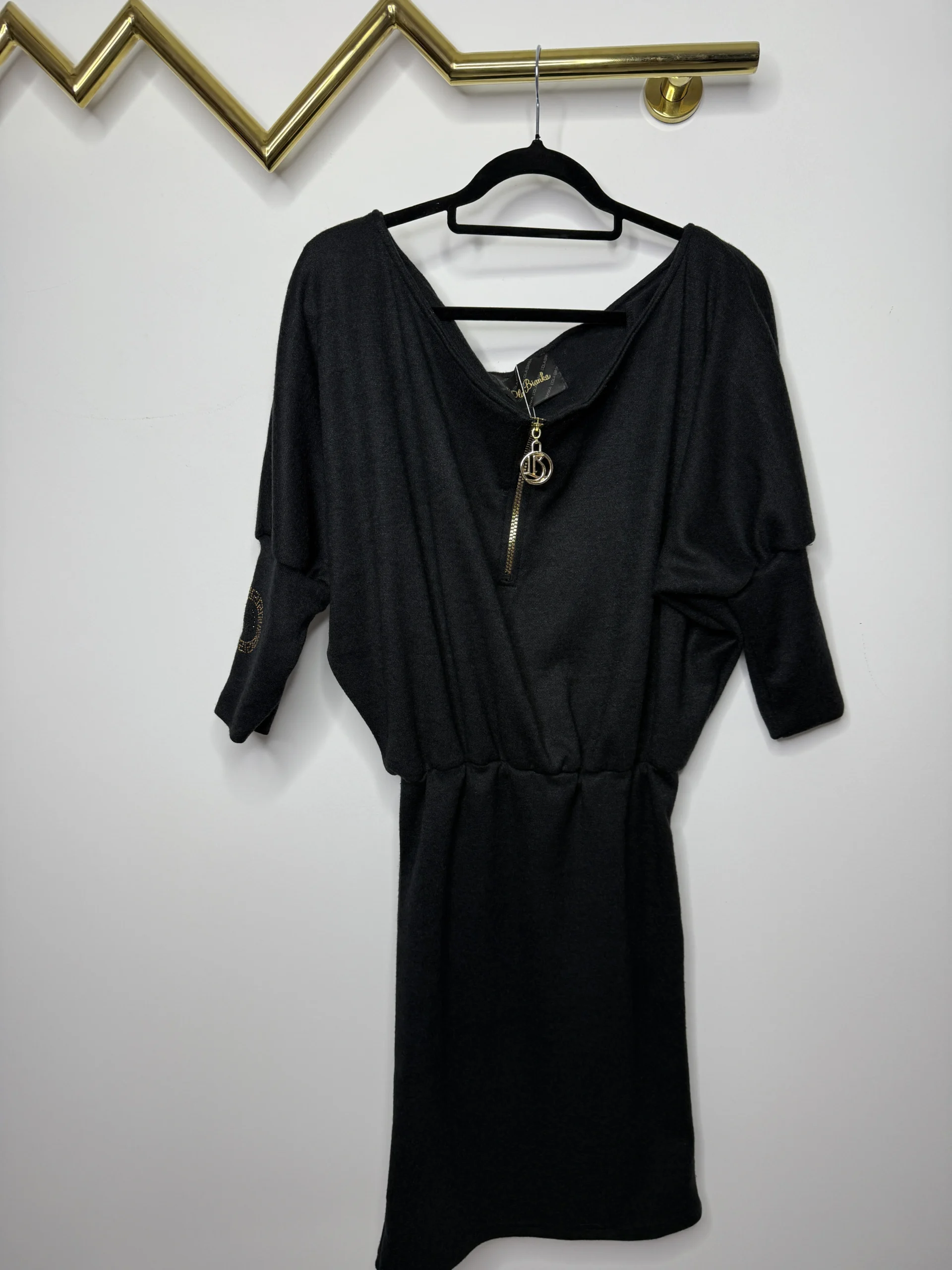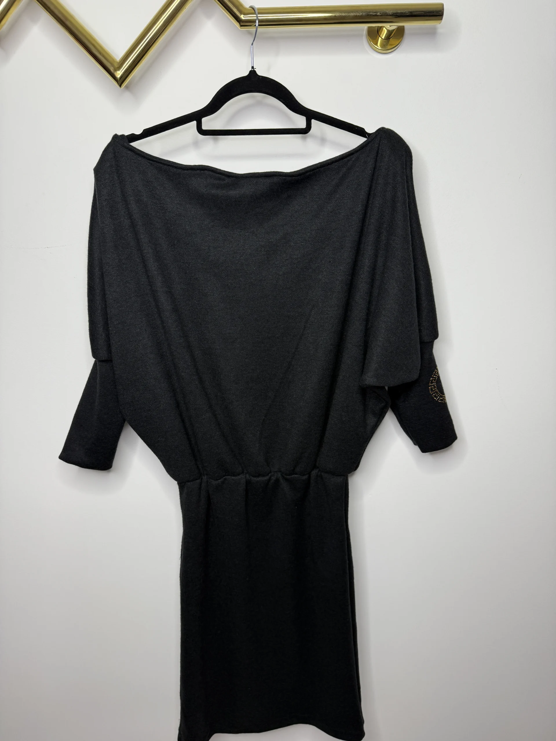 Dekolt łódka z możliwością opuszczenia na jedno ramię, rękawek zwężany, w pasie gumeczka, dół dopasowany