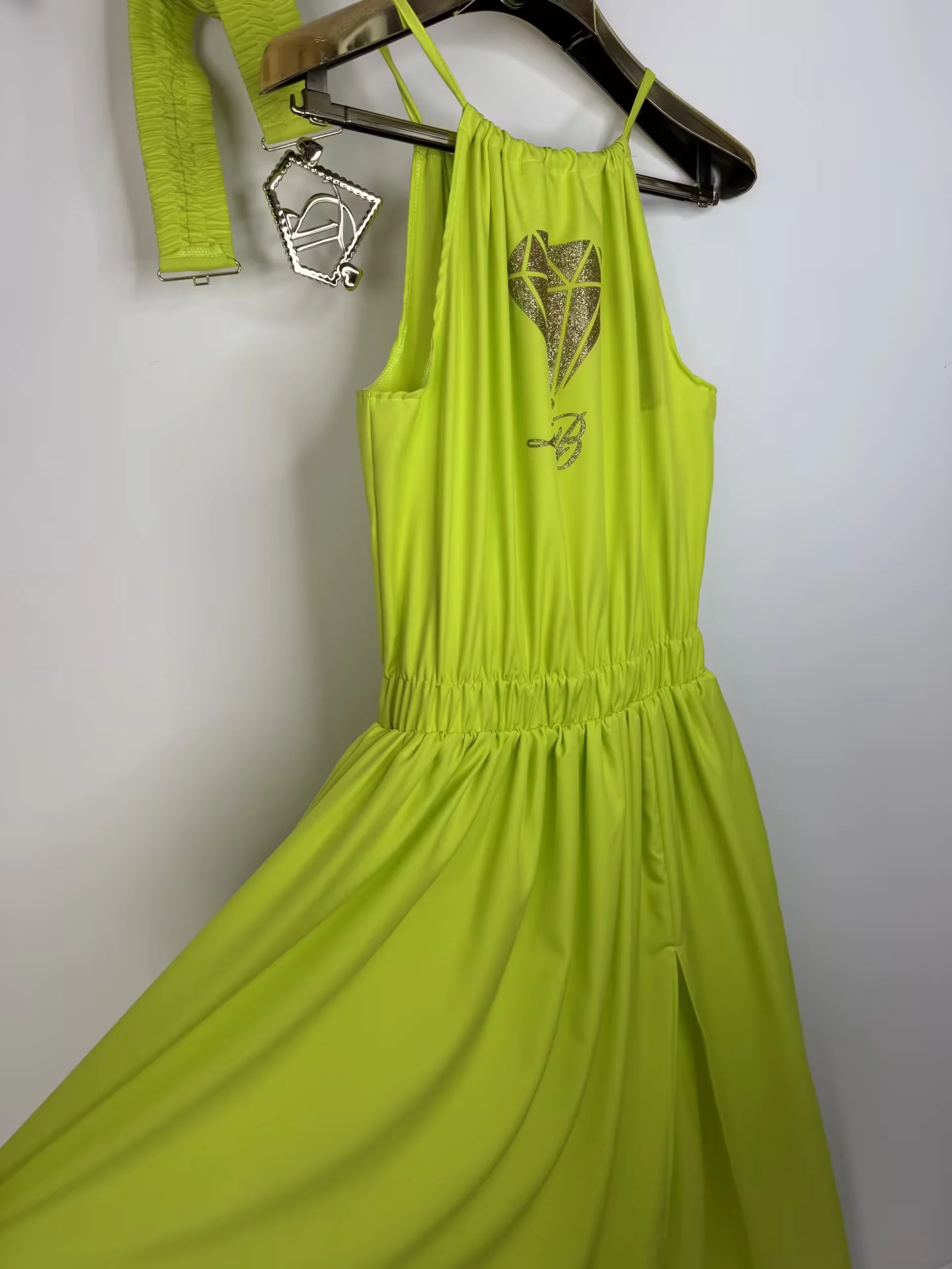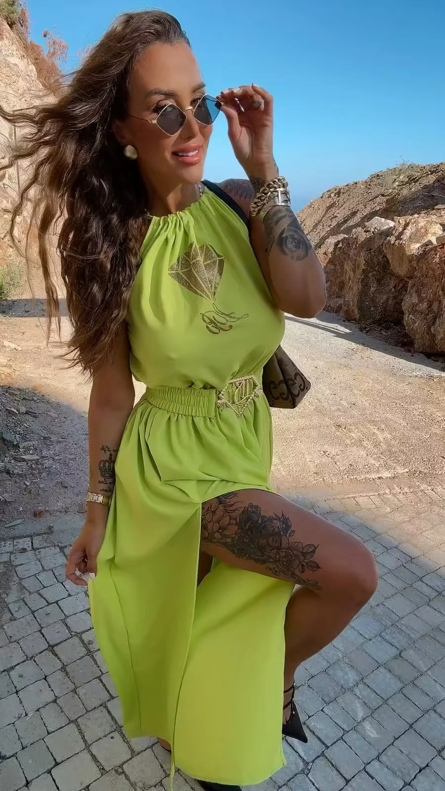 cudowny model na lato, doskonała na wesela chrzciny komunie czy spacer po plaży, rozmiar UNIWERSALNY co oznacza ,że pasuje na S, M, L, bez rękawów, wiązana z tyłu, w pasie gumka, rozcięcie w pionie na nóżkę, w zestawie pasek z klamrą