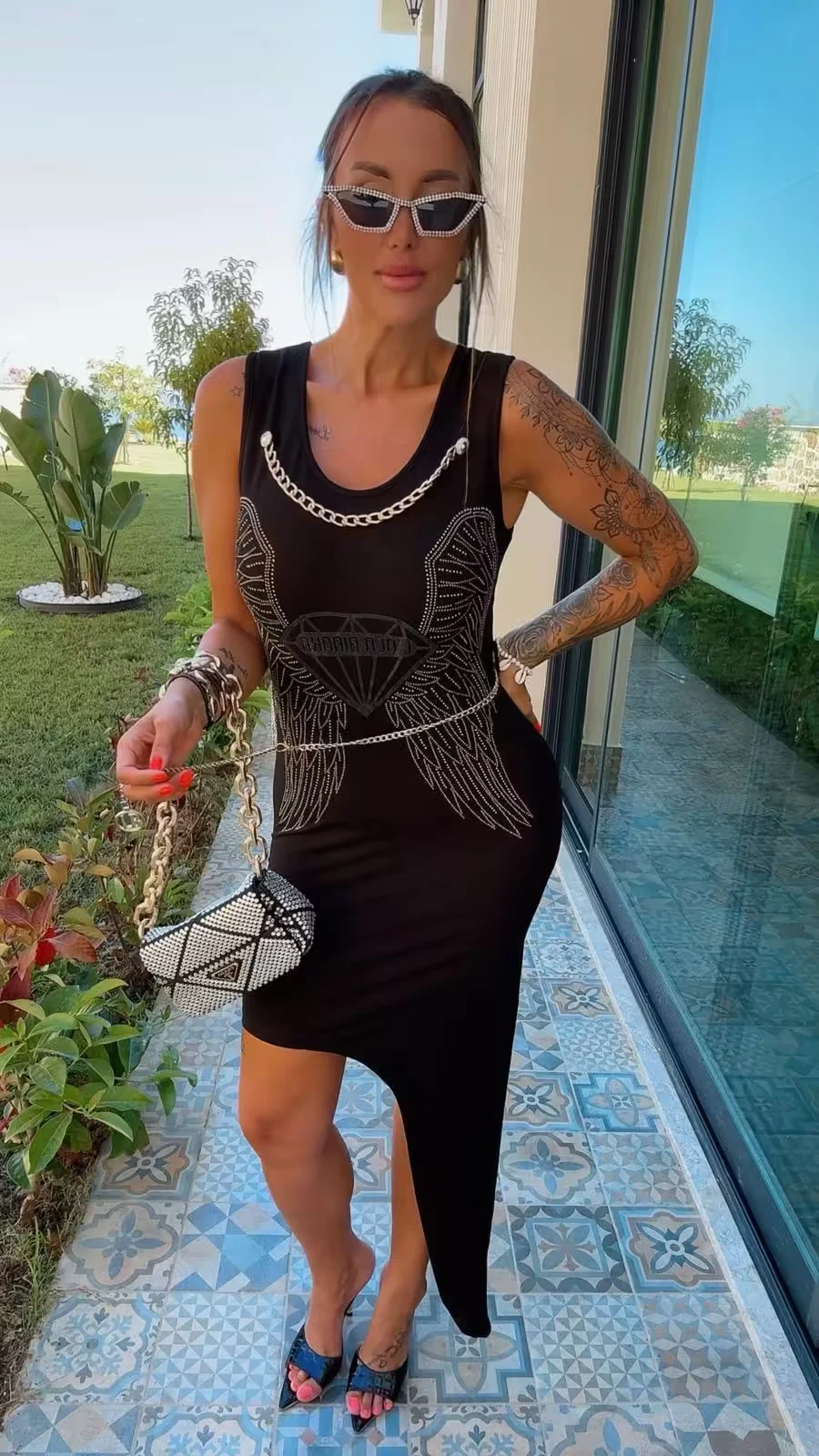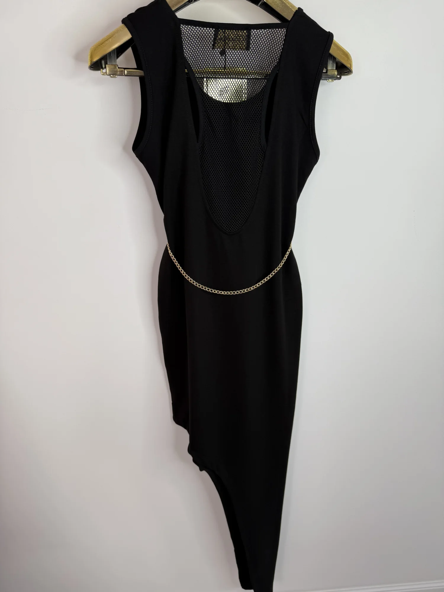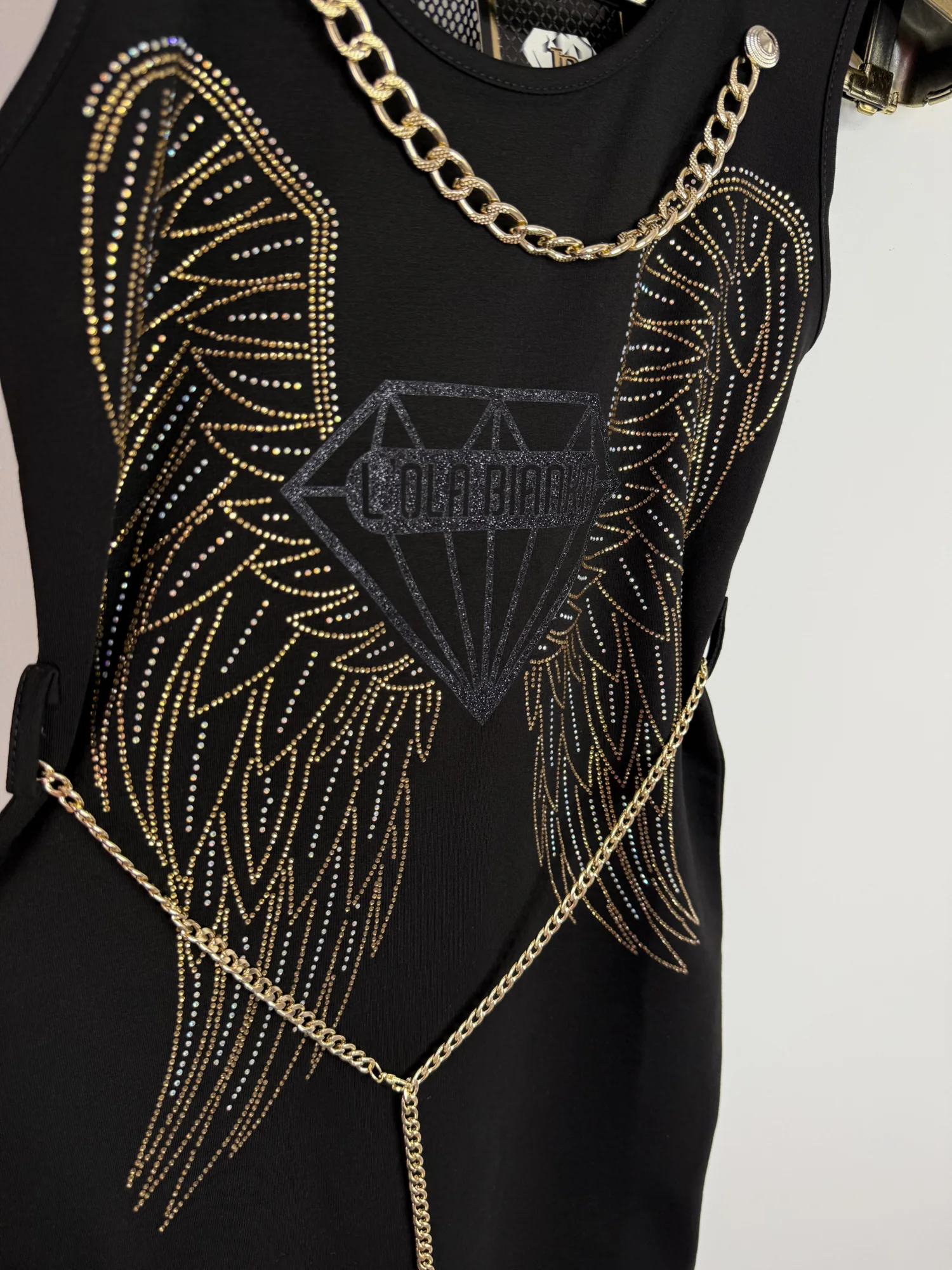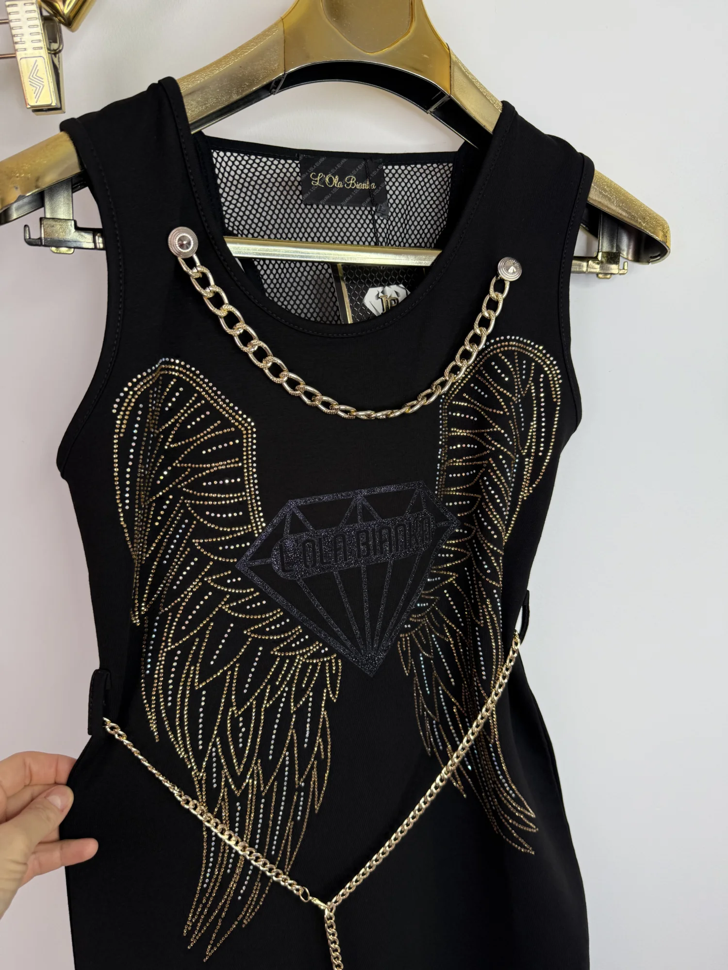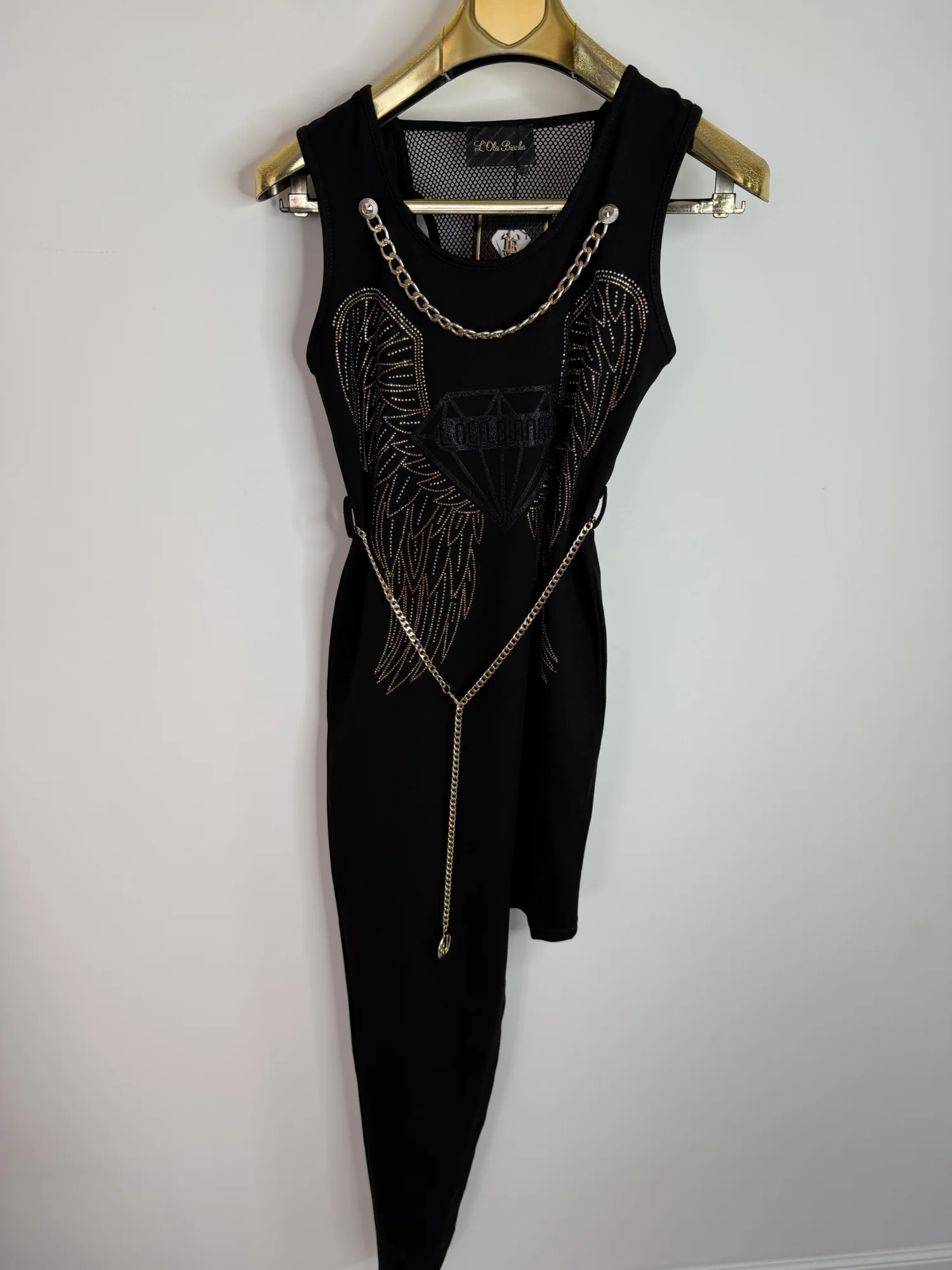 Sukienka Lola Bianka dopasowana czarna długa w rozmiarze uniwersalnym pasuje na SML pięknie zdobiony cyrkoniami w zestawie pasek łańcuszek