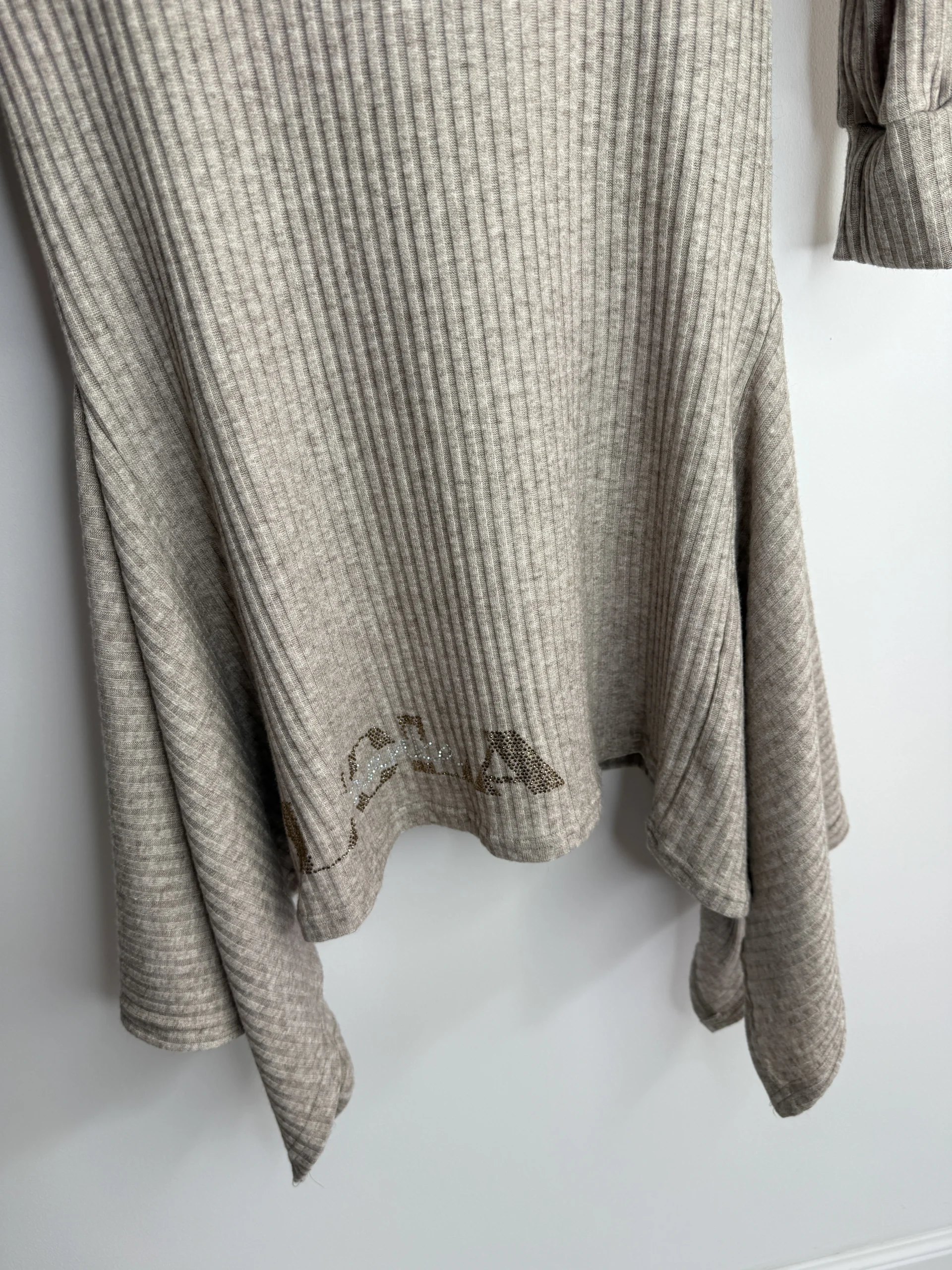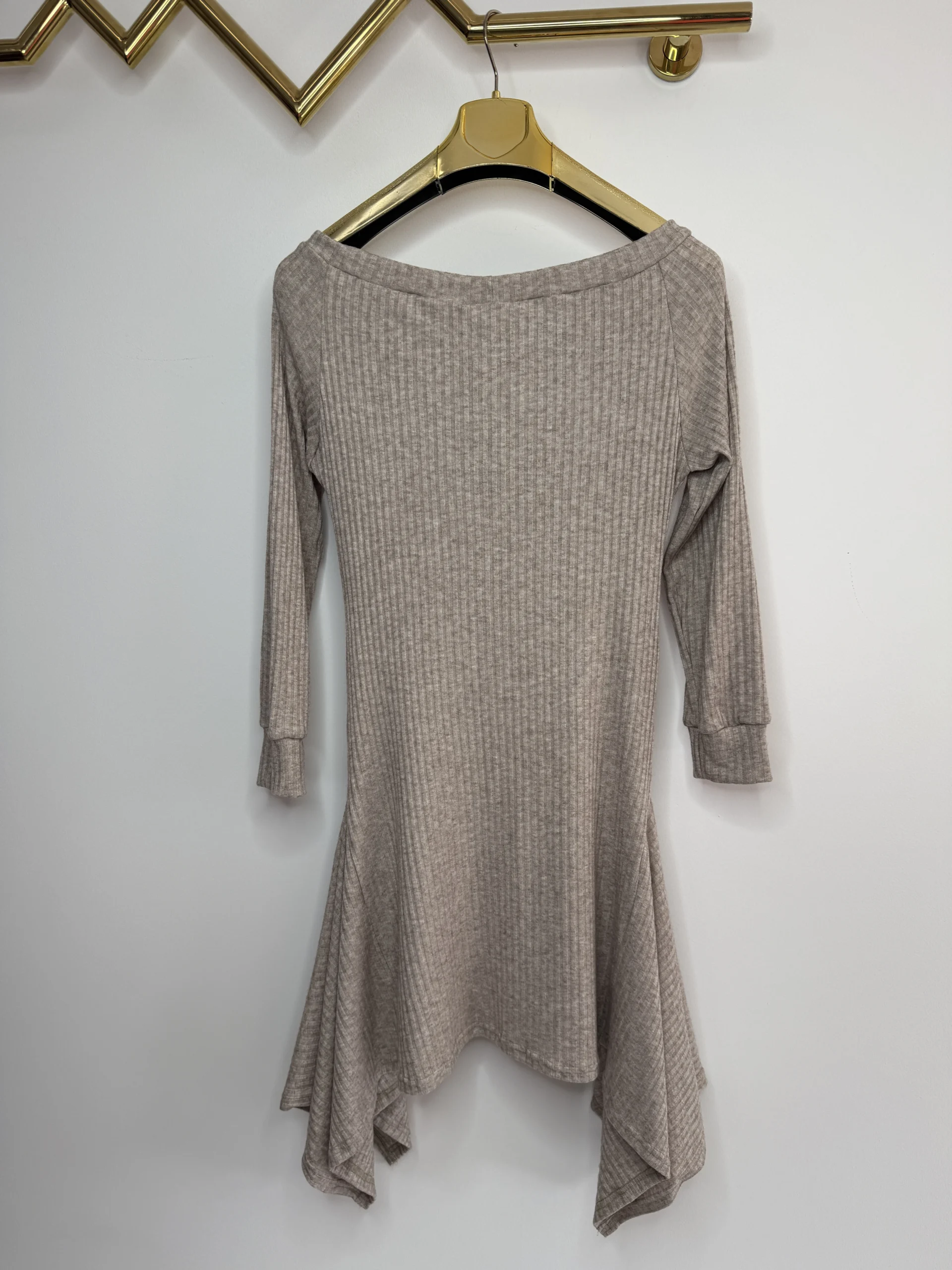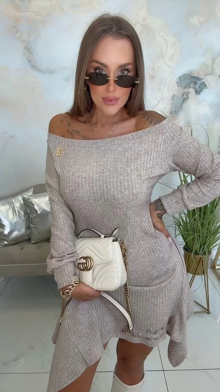Model został zaprojektowany tak, aby łączyć komfort z najnowszymi trendami. Asymetryczne boki zakończone dłuższymi rogami nadają sylwetce smukłości i sprawiają, że sukienka prezentuje się bardzo nowocześnie. Długi rękaw czyni ją doskonałą opcją na chłodniejsze dni, a brak kieszeni podkreśla minimalistyczny charakter fasonu.