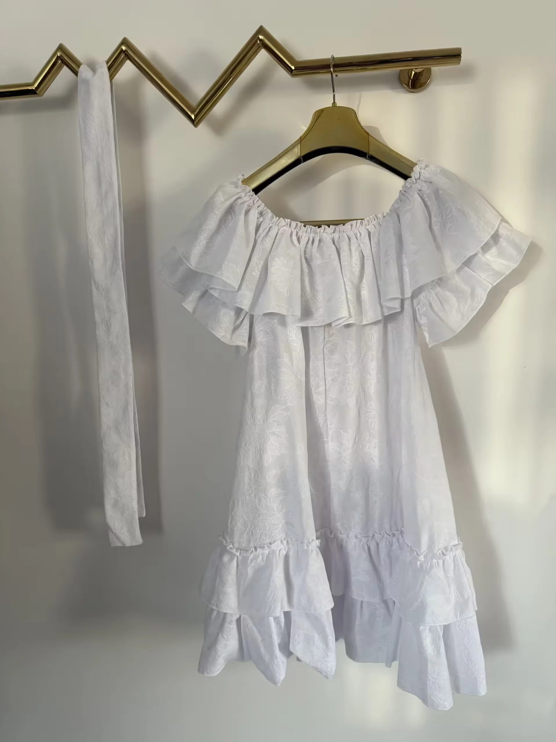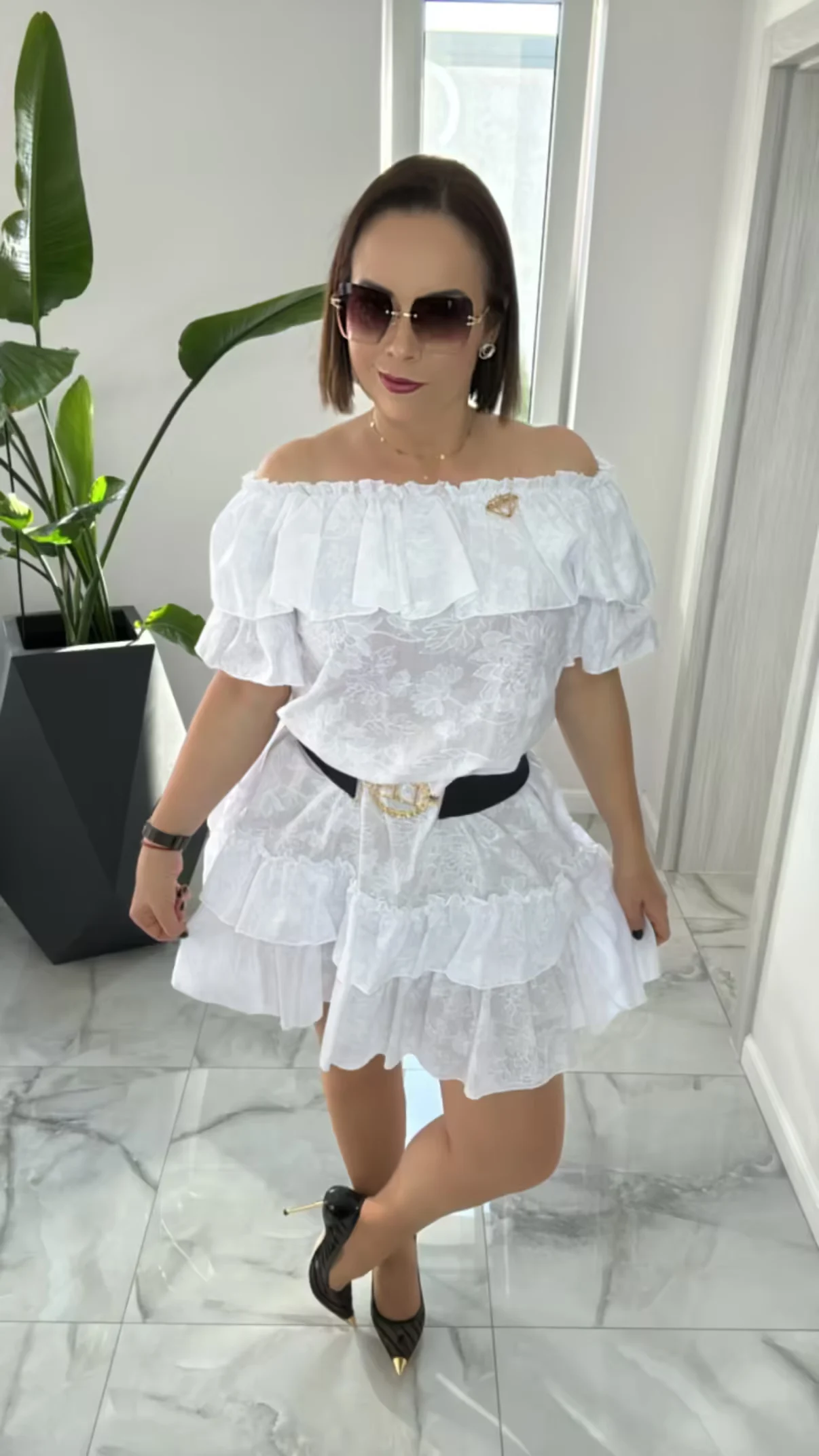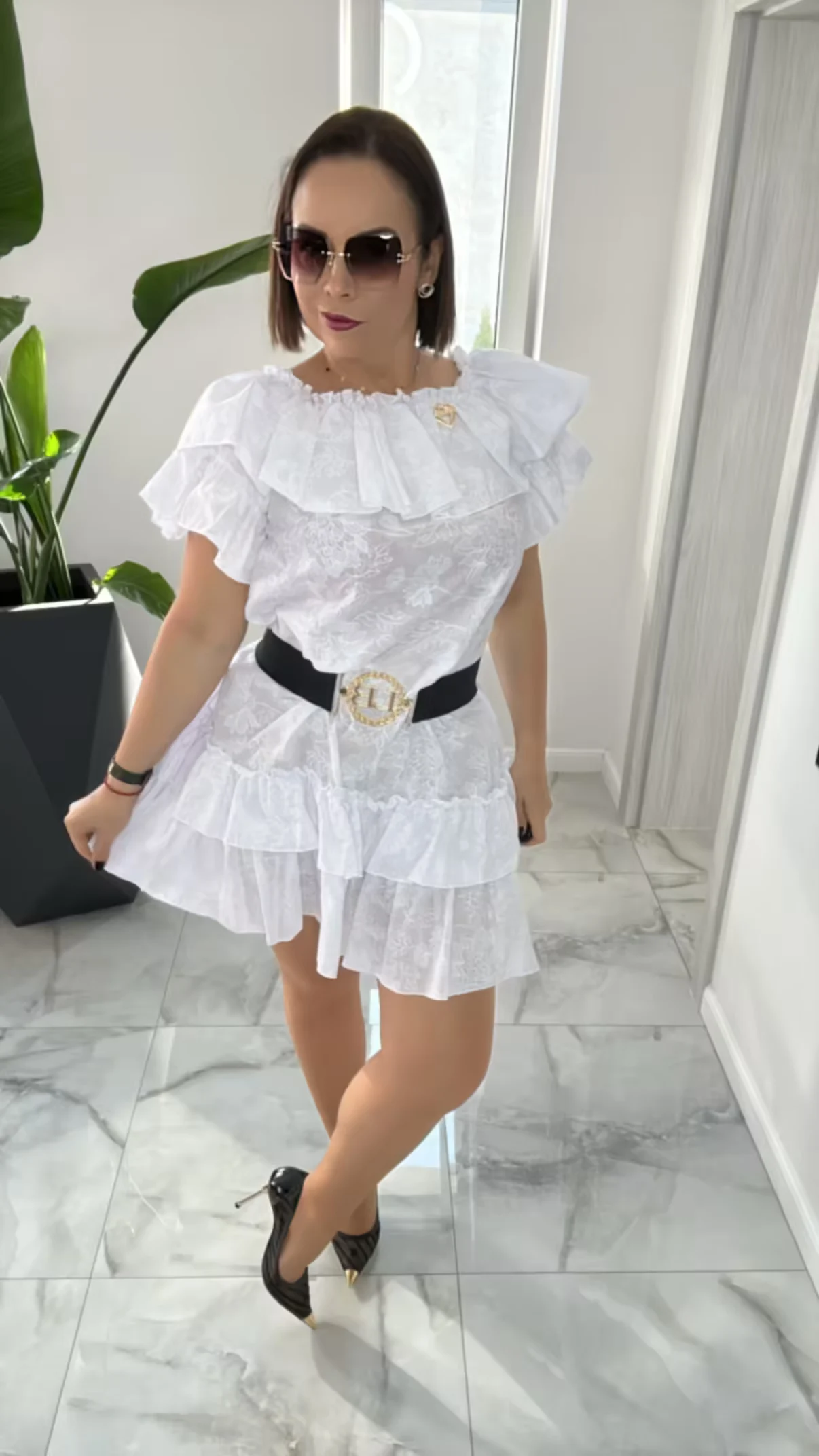 Sukienka Lola Bianka hiszpanka letnia biała z paskiem z materiału, materiał przewiewny idealny na gorące dni