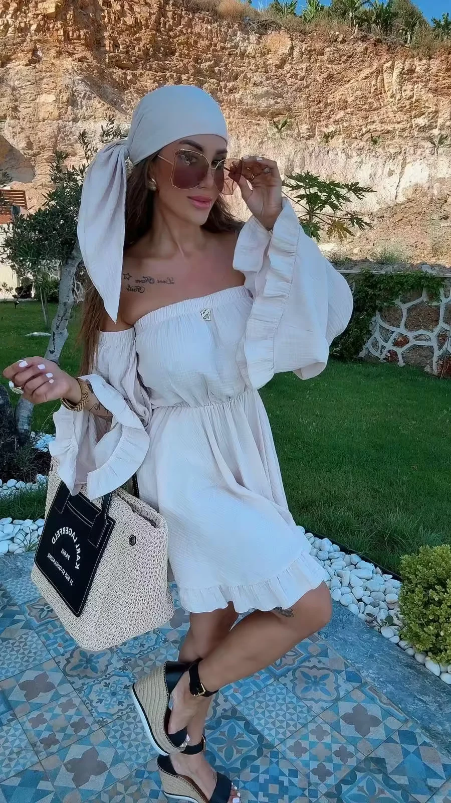 cudownie mièciutka letnia sukienka z odkrytymi ramionami idealna na gorące lato, rękawki długie połączone z sukienką ale można je śmiało odpruć, w zestawie chusta na włosy
