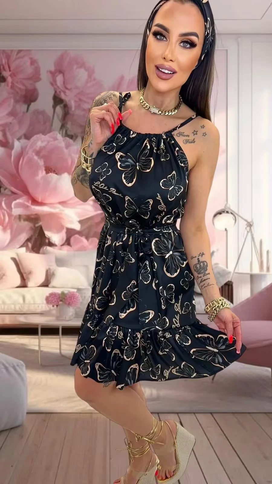 przepiękny leciutki cieniutki materiał, idealna na gorące dni, przepiękny print, w zestawie pasek z materiału oraz opaska na głowę