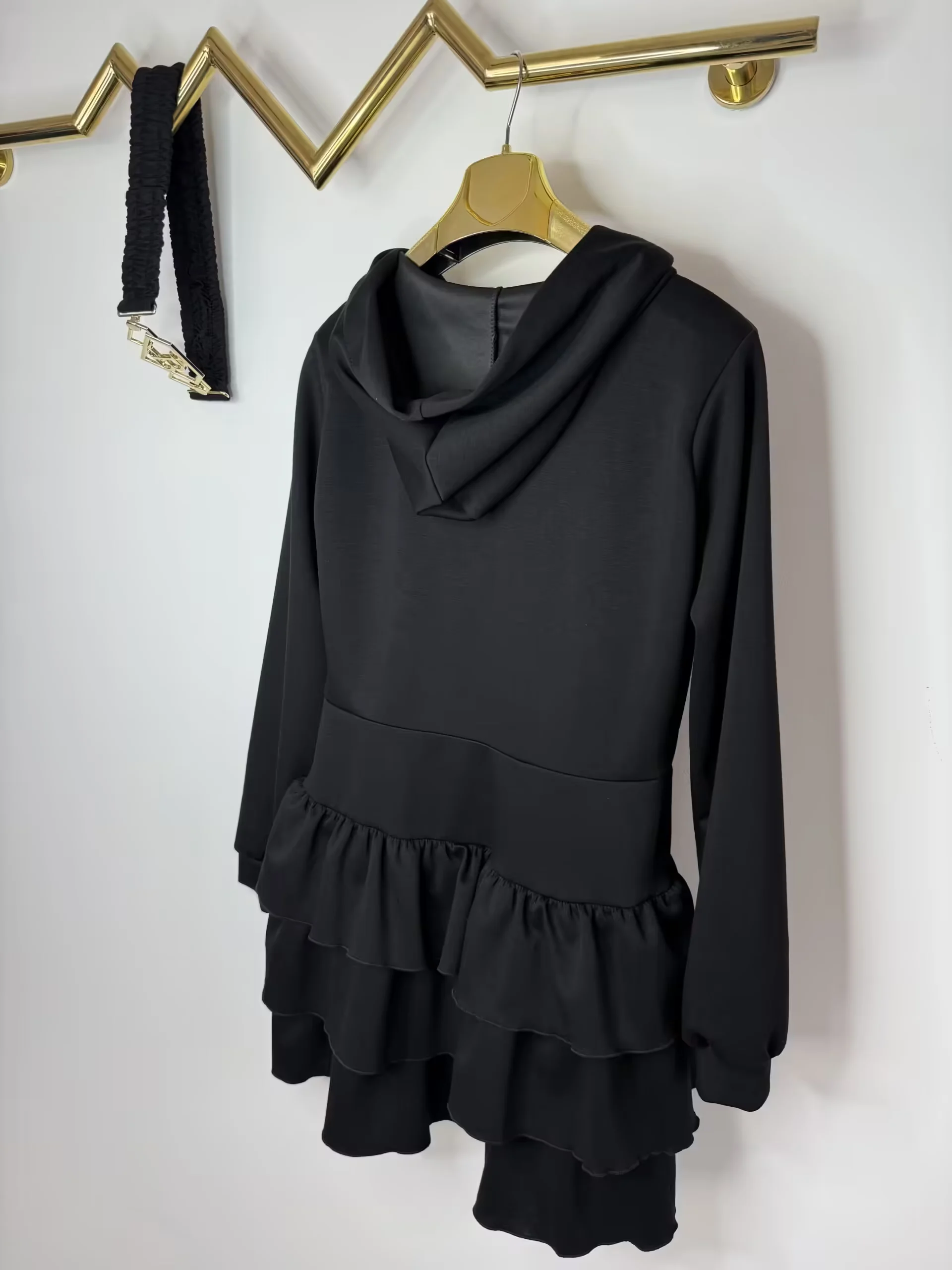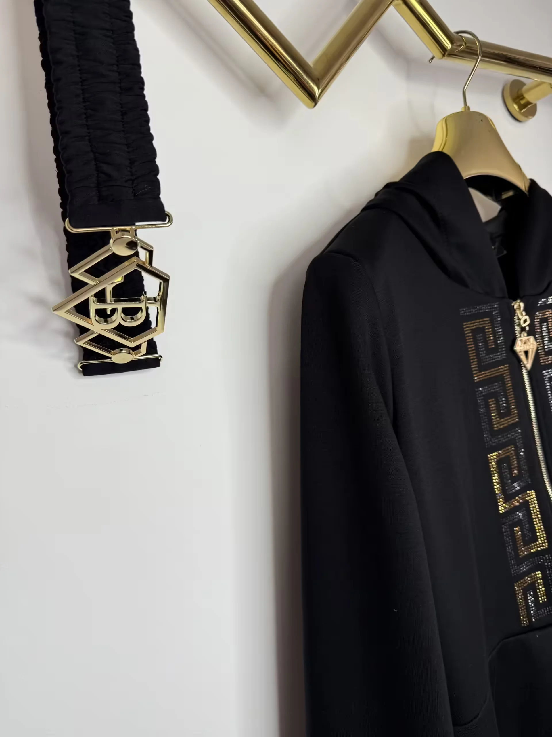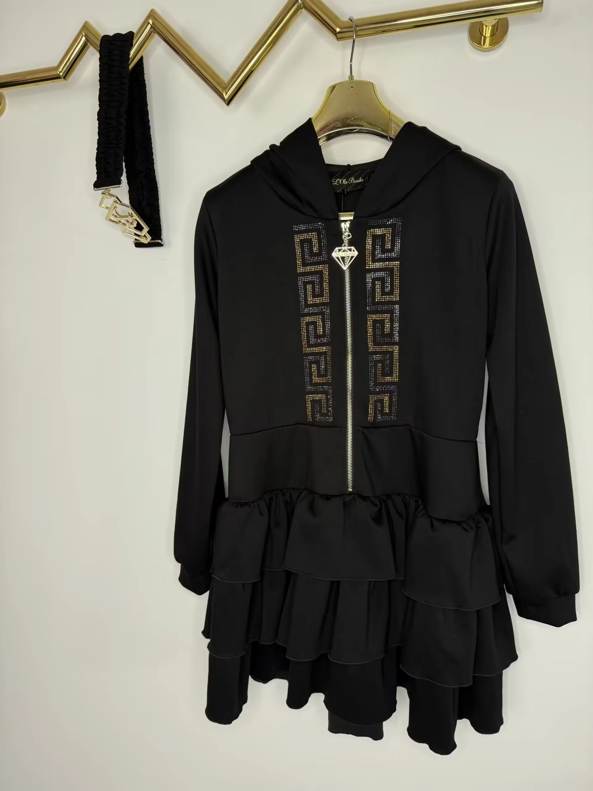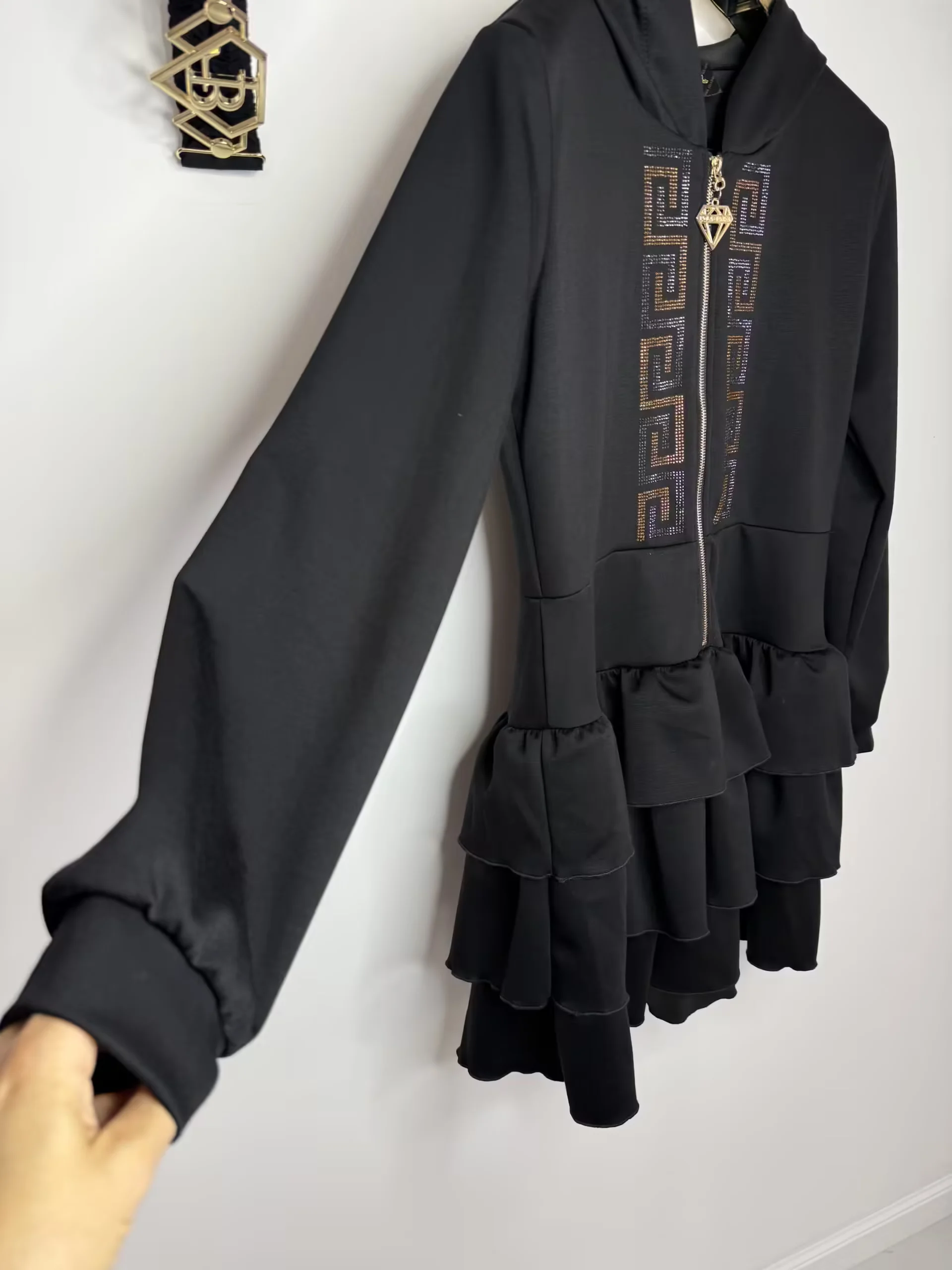 przepiękny model bardzo wygodnej sukienki zapinanej na zamek, zdobienie z cyrkonii na przodzie, z logowanym paskiem z klamrą, dodatkowo kaptur