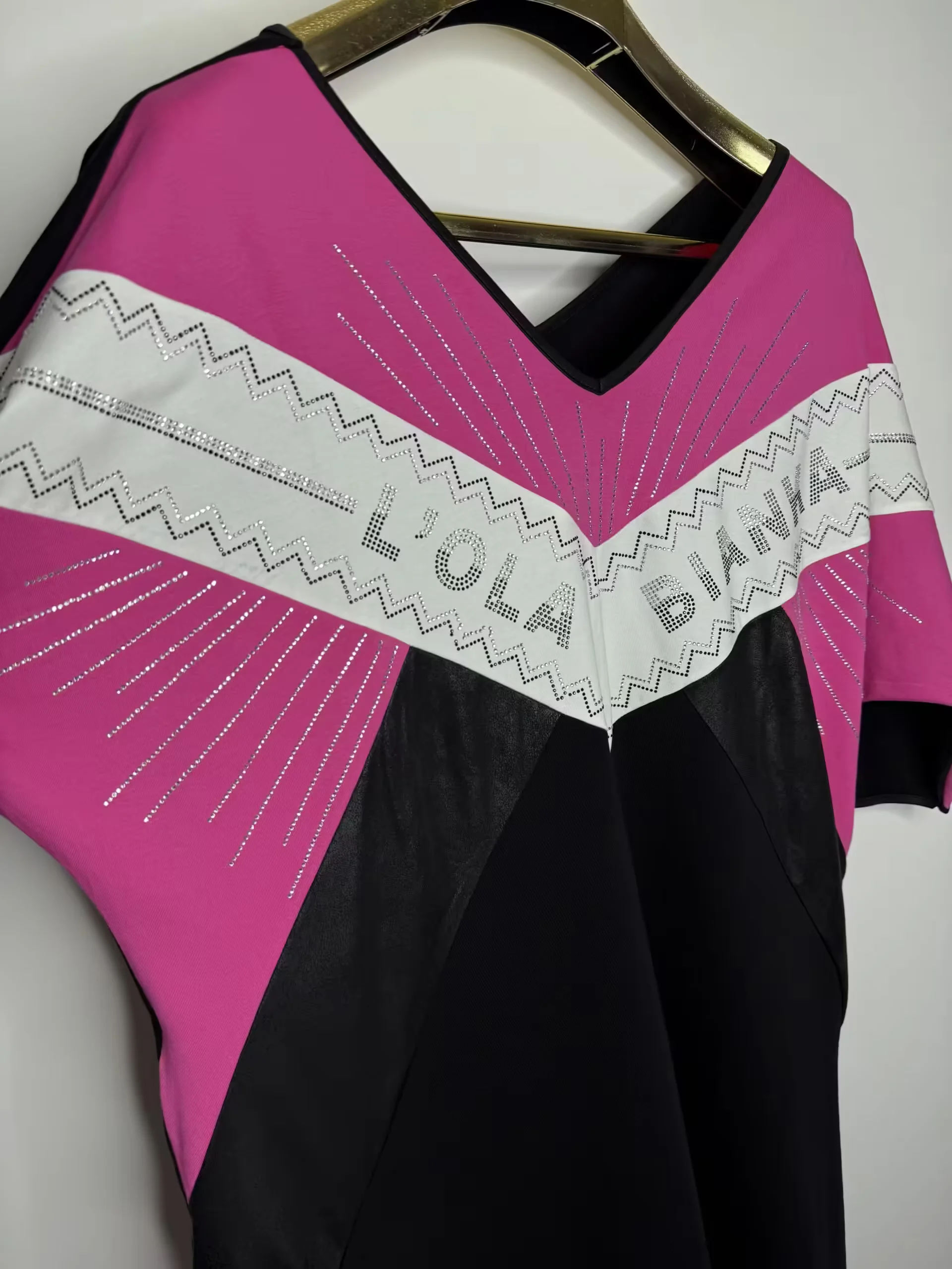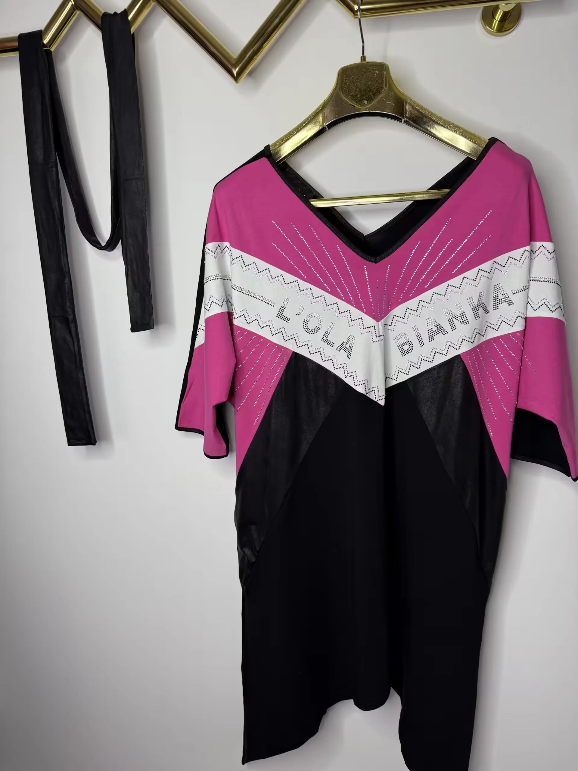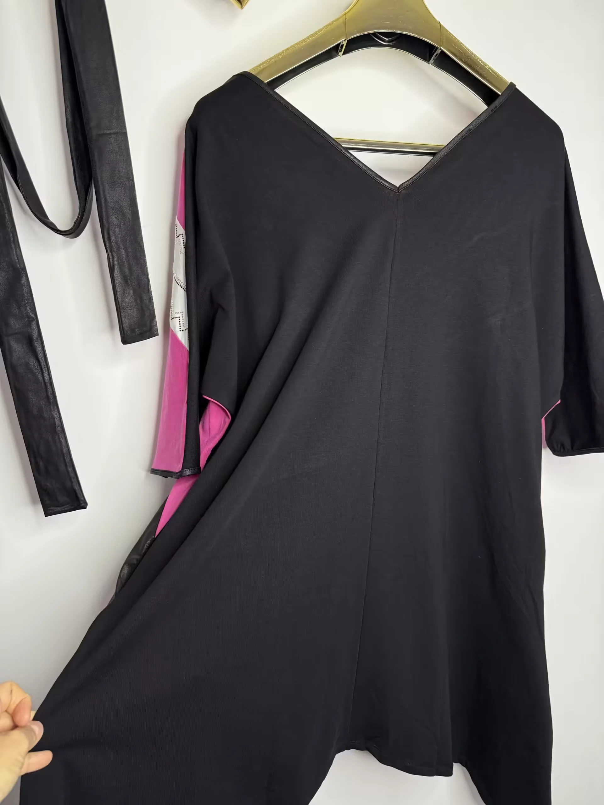 krótki rękaw, po bokach kieszenie zdobiona cyrkoniami, wstawki z ekoskórki, rozmiar z metki uniwersalny pasuje na L, XL, w zestawie pasek
