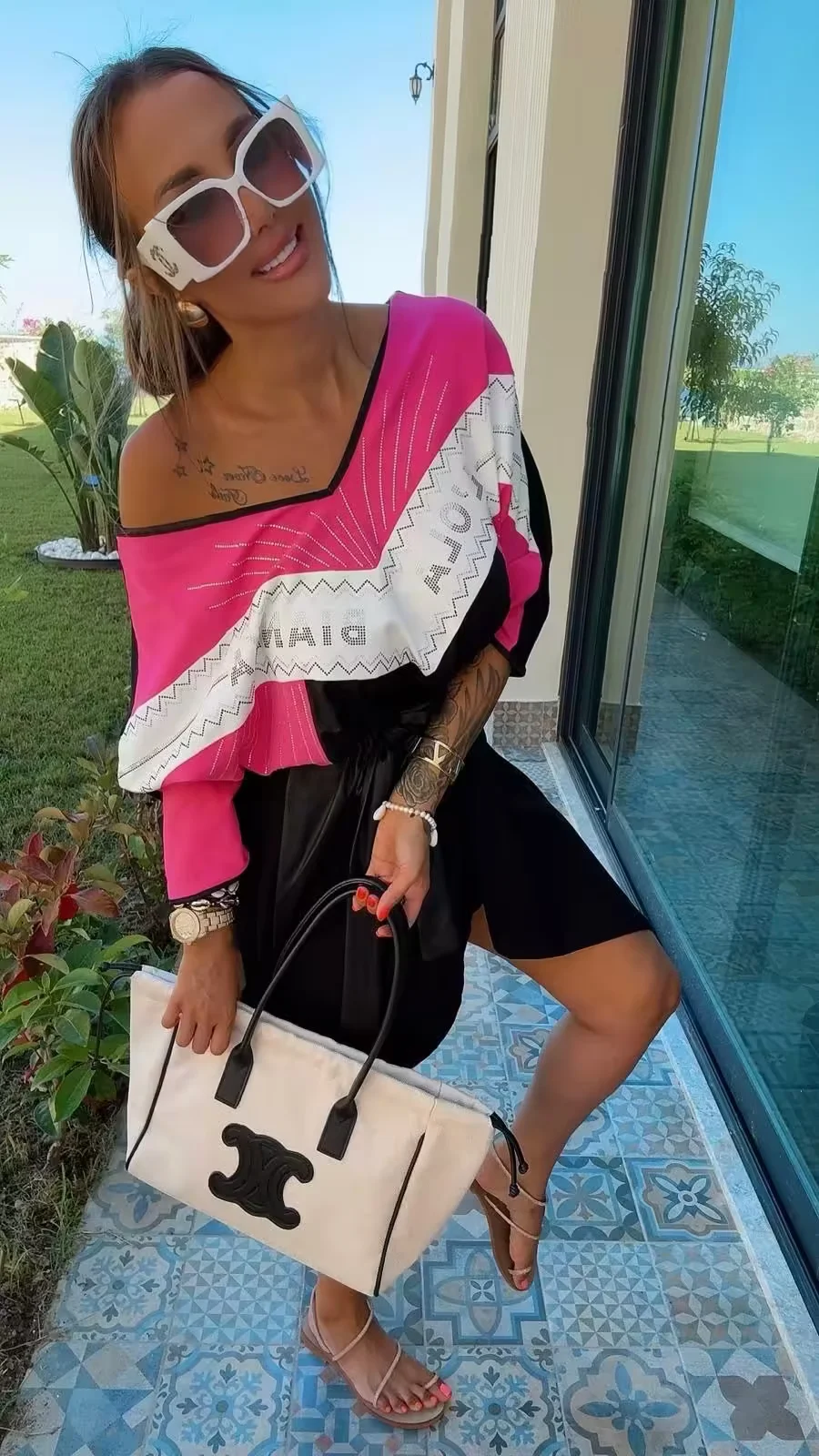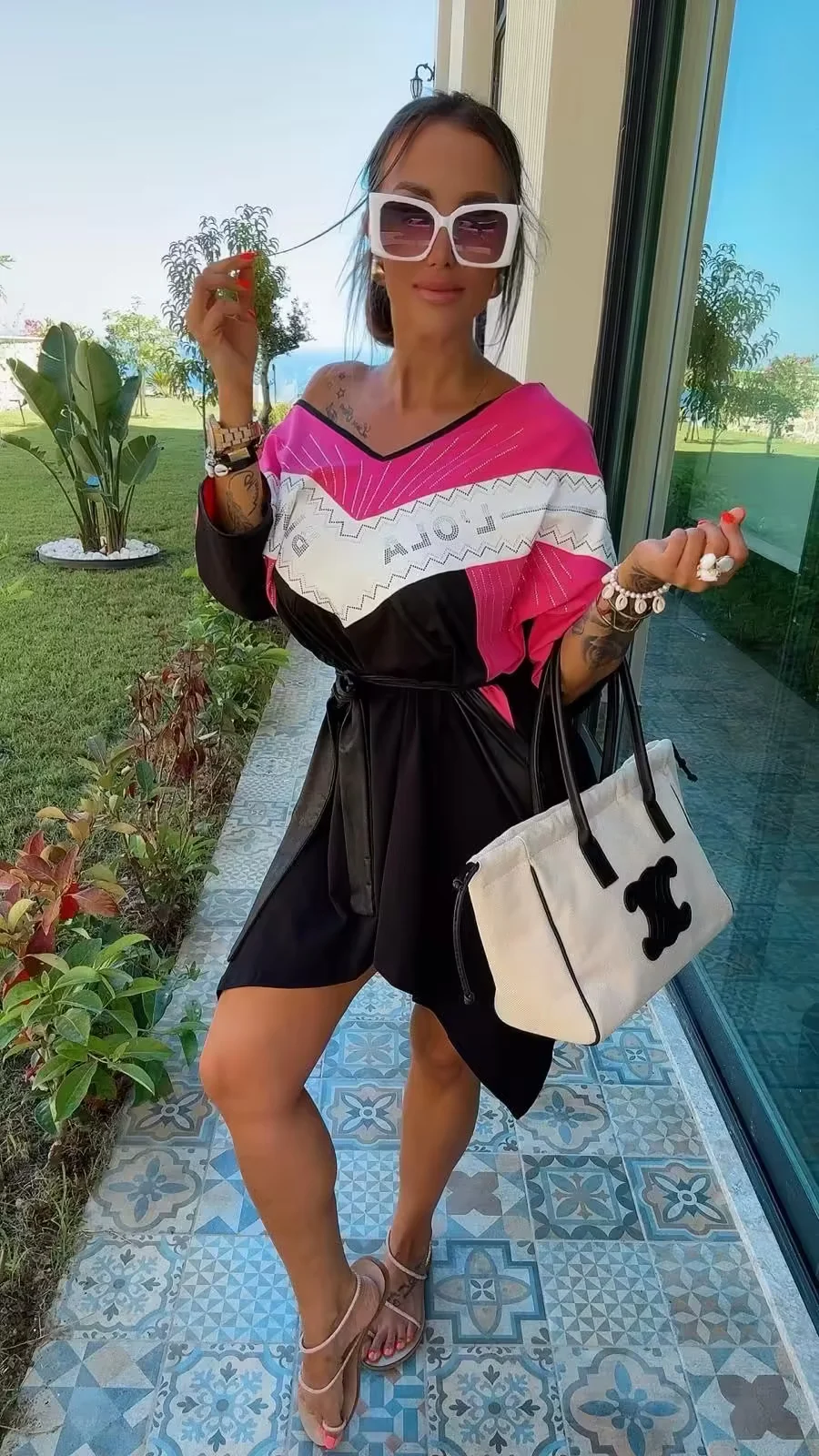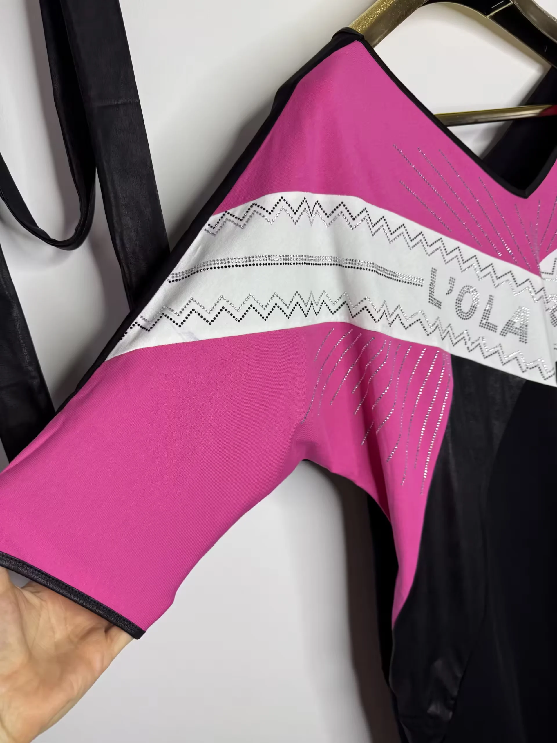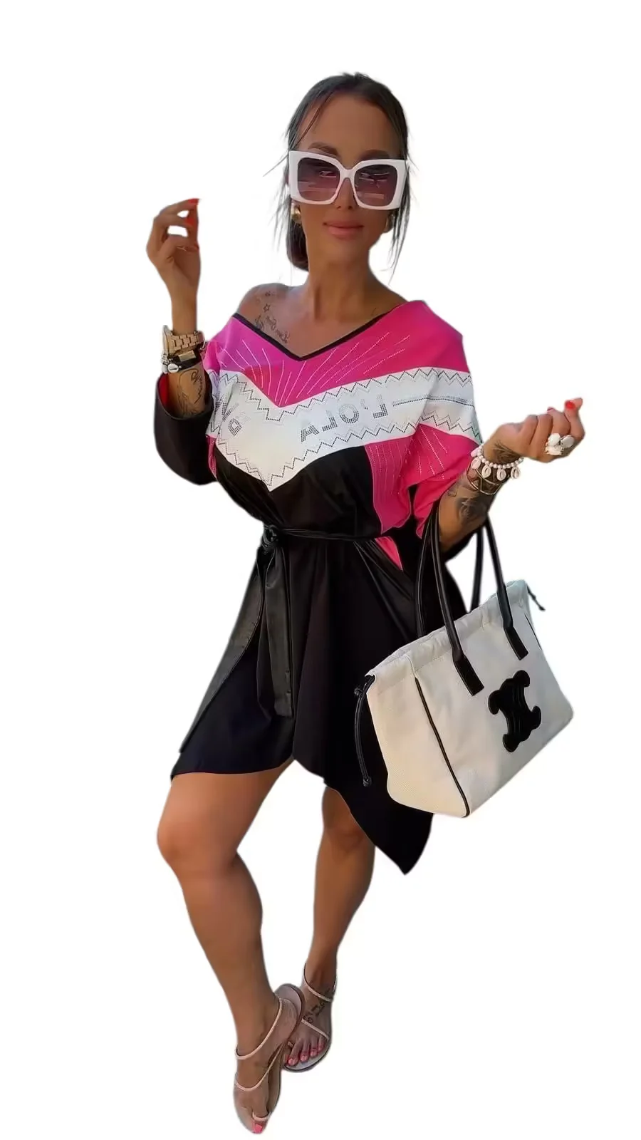 krótki rękaw, po bokach kieszenie zdobiona cyrkoniami, wstawki z ekoskórki, rozmiar z metki uniwersalny pasuje na L, XL, w zestawie pasek